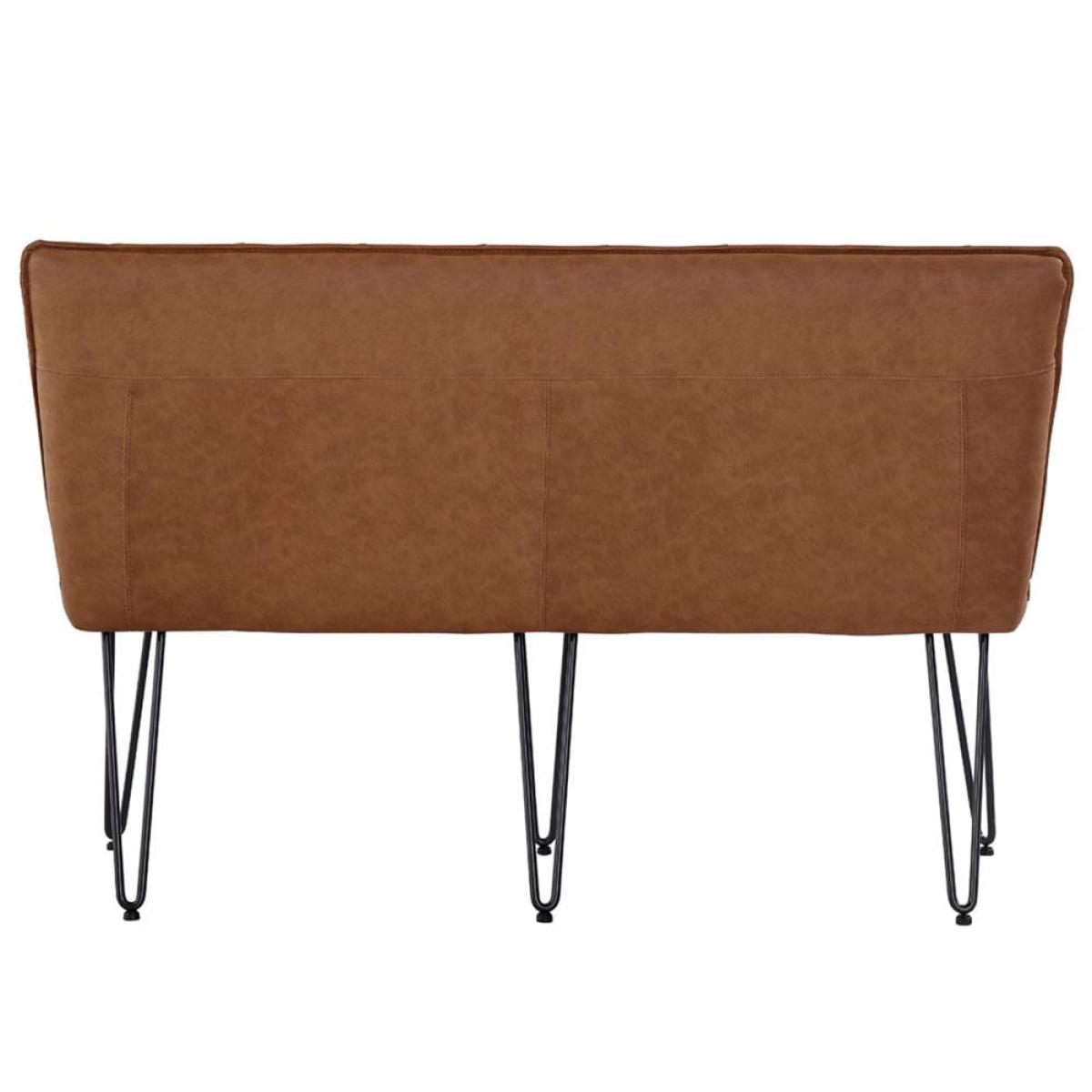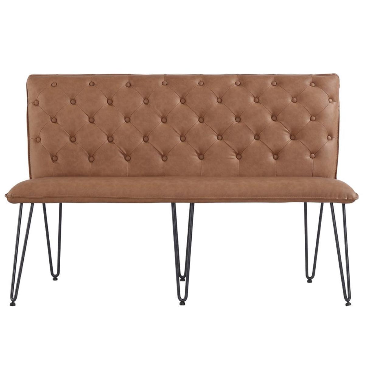 I love this tan leather bench for its utilitarian charm and versatility. It works particularly well in industrial or contemporary interiors, adding warmth and texture to a neutral colour palette. The studded back detail makes it an eye-catching feature, perfect for use in a hallway, dining area, or even as additional seating in a lounge. Practical styling tips include pairing it with a cosy throw or decorative cushions to soften the look, and combining it with other metal or wooden accents to enhance its industrial vibe. Its sleek, slender legs also make it a space-saver, ideal for smaller living areas where you want to optimise seating without overwhelming the room.