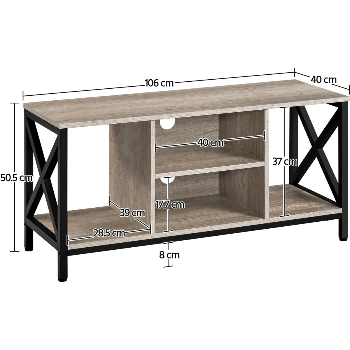 I’m a fan of this grey industrial stand for its clean lines and sturdy X-frame detailing, which gives it character without overwhelming a room. It sits well in loft-style living areas or modern farmhouse schemes, pairing particularly nicely with exposed brick, concrete accents or neutral walls. For a balanced look, style the lower shelves with woven baskets or slim wooden boxes to conceal cables and gadgets, and add a couple of low-profile speakers or a soundbar in the side cubbies. Top the unit with a slim TV, a low vase or a small cluster of succulents to keep the focus on the unit’s structure and maintain an uncluttered feel.