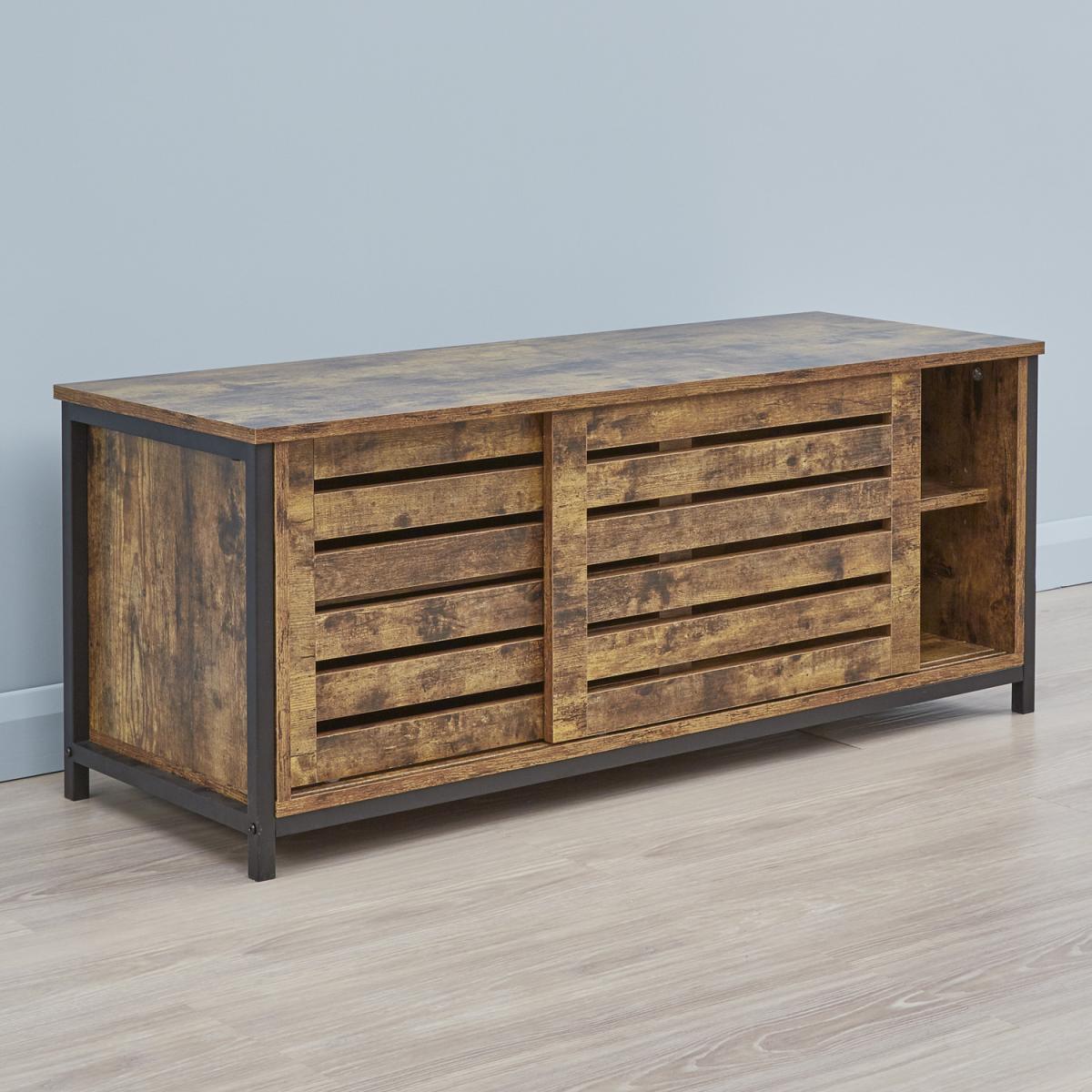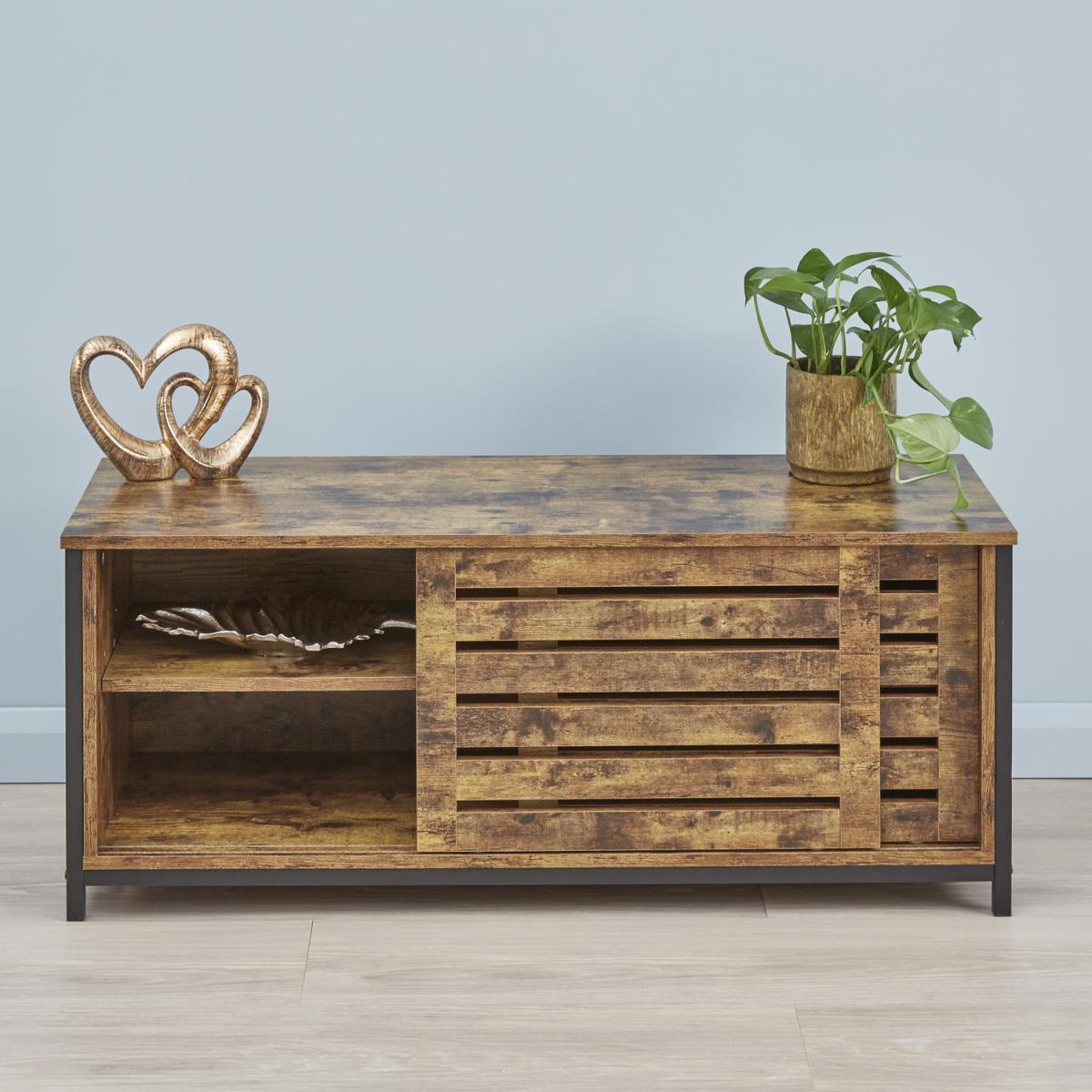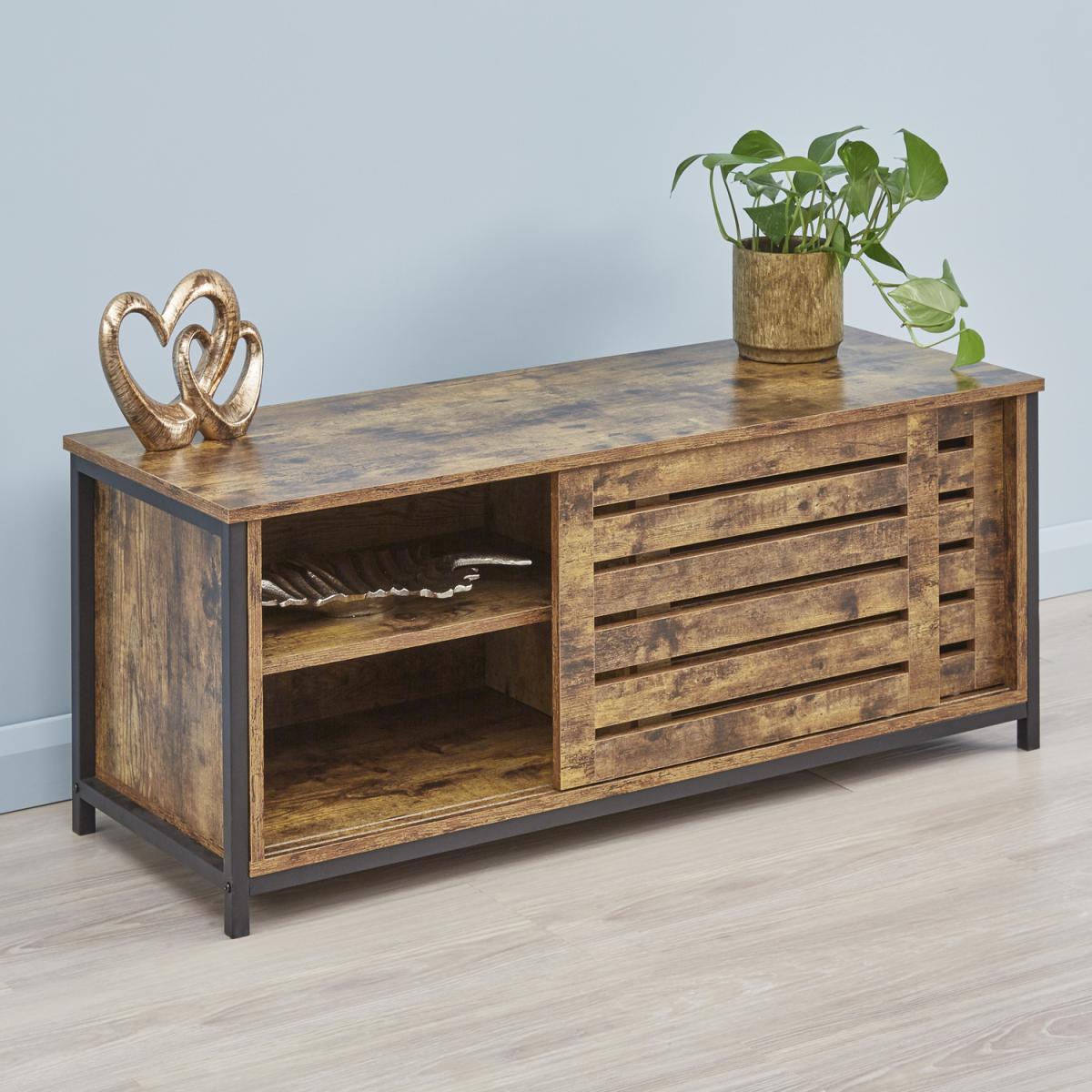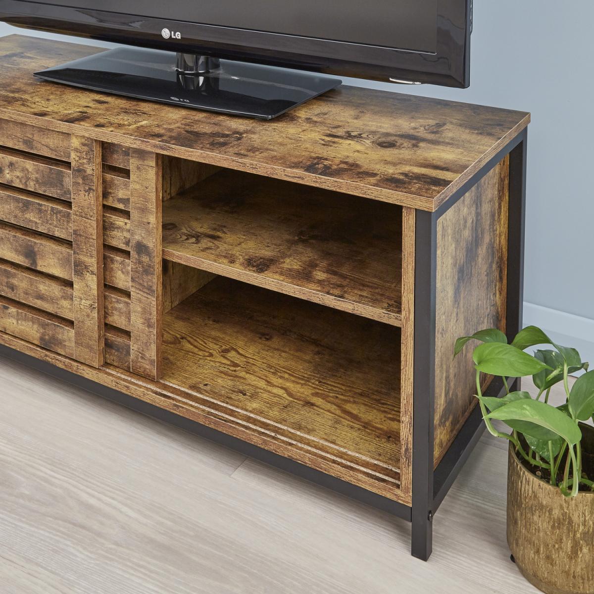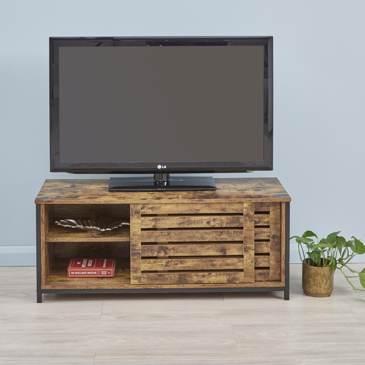 I love this industrial wood TV stand for its rugged yet functional design-perfect for adding a touch of warmth and character to a living space. Its bold Orange tone makes it a standout piece, especially in modern or loft-style interiors, and it works well paired with both neutral and vibrant colour schemes. To style it effectively, consider layering with some decorative books, plants, or metallic accents to enhance its industrial charm. It’s also practical for hiding clutter out of sight with the open and slatted storage, so it’s great for keeping entertainment essentials organised without sacrificing style.
