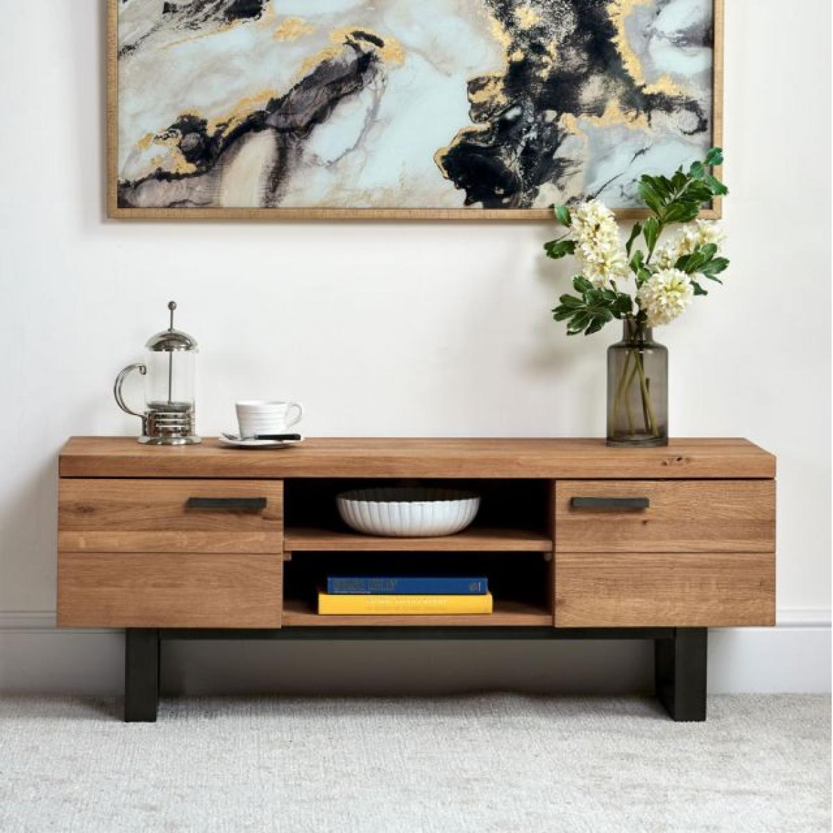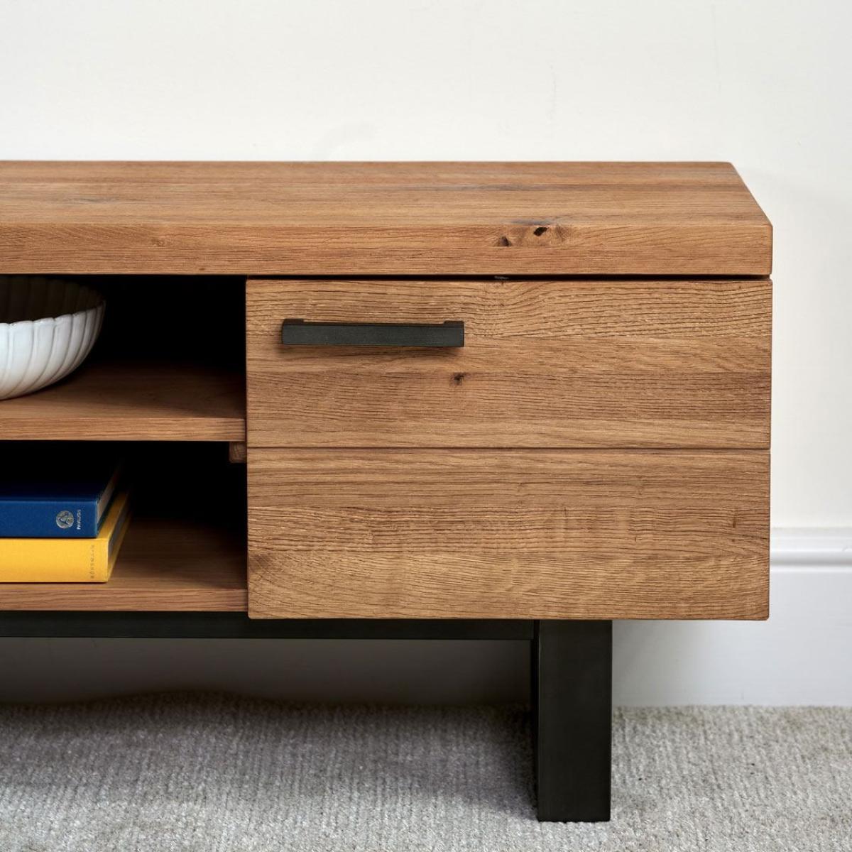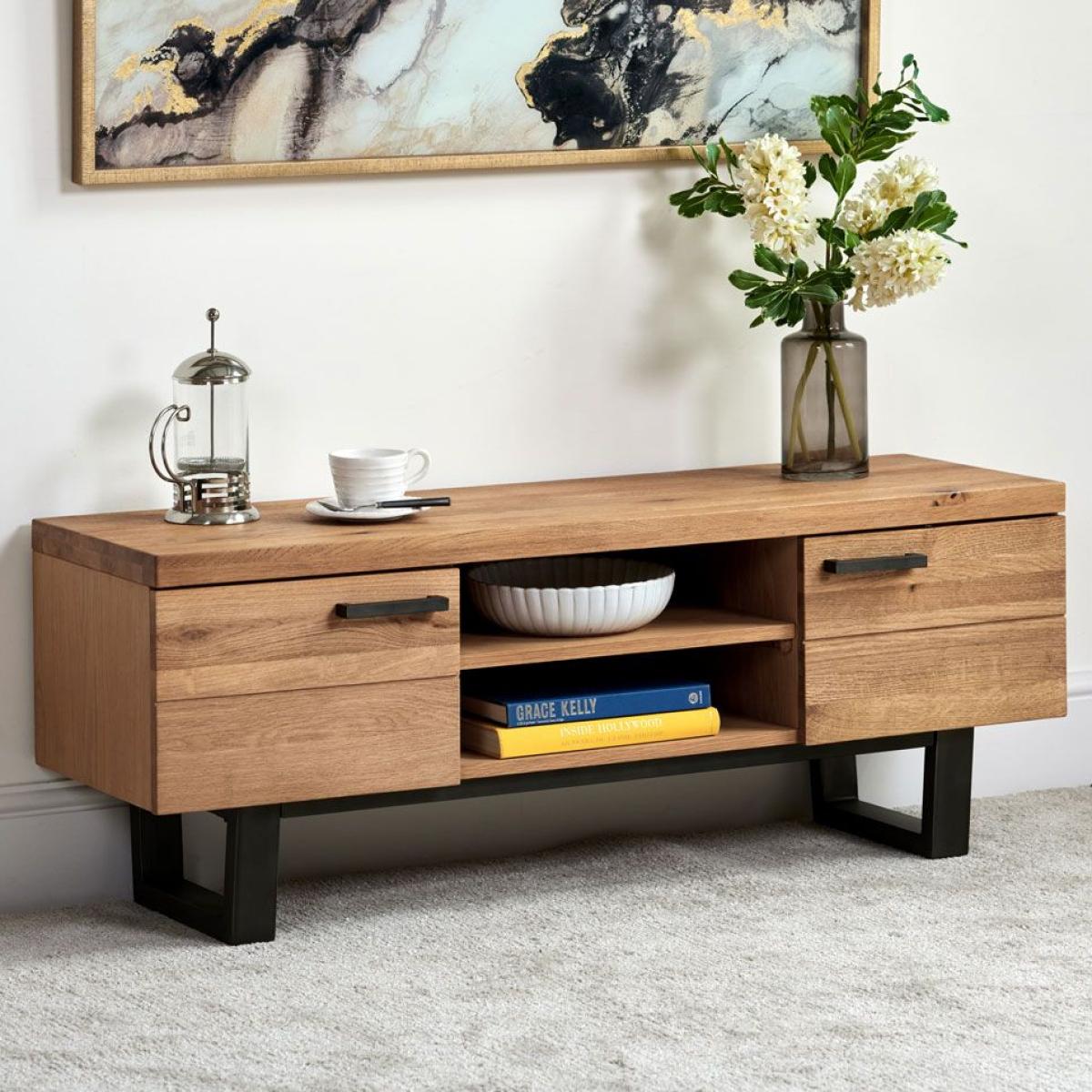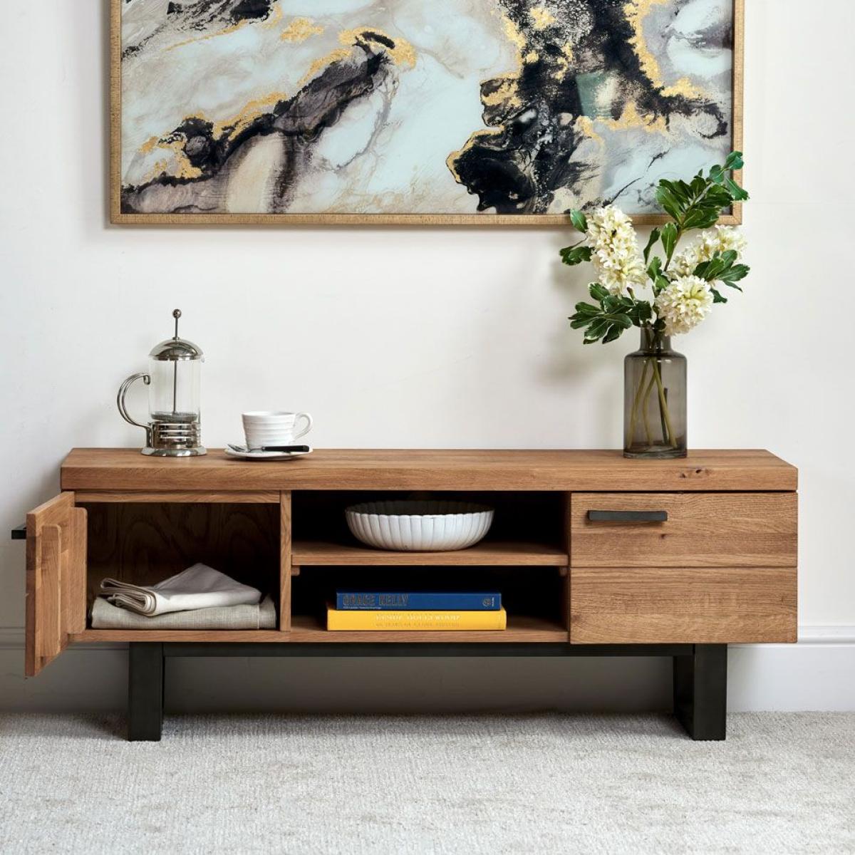 Sometimes the simplest of things are the best and that stands true with the Industrial TV unit. Made up of a robust solid wood and paired with dark grey metal door handles and legs. There's enough space to store your television system with gaps at the back to thread wires through. Team with the rest of the collection to complete the look.