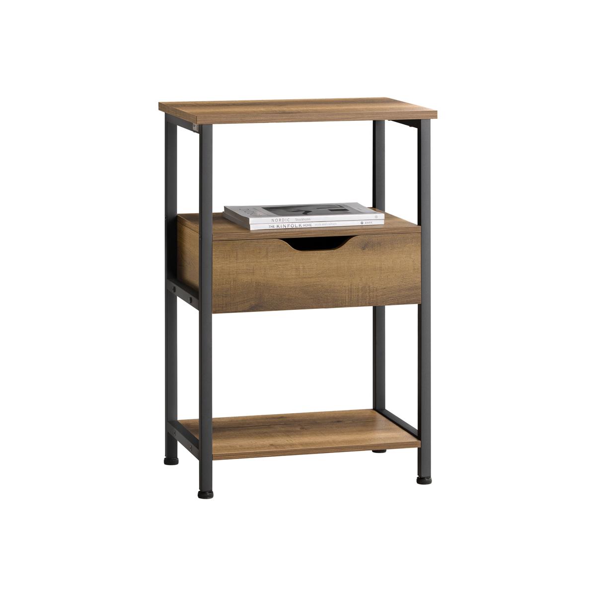 This Industrial Vintage Style side table nightstand creates a distinctive and modern atmosphere for your home. It is great to be used as a sofa side table or bedside table for you to get accessible to what you need. It offers ample storage space for books, magazines, remote controls, glasses and other small items, keeping your room tidy and organized. A drawer provides ample storage space for your personal items. The cut-out grip handle on the drawer makes you open it easily. 3 open shelves offer additional storage and display space for you. Made of high quality particle board with wooden effect and black powder coated steel frame. Sturdy and durable. It features adjustable feet under each metal leg to ensure it stay level on uneven floor. Coming with anti-tipping device, ensuring great stability and safety. Practical and space-saving, it is a good addition to any room.