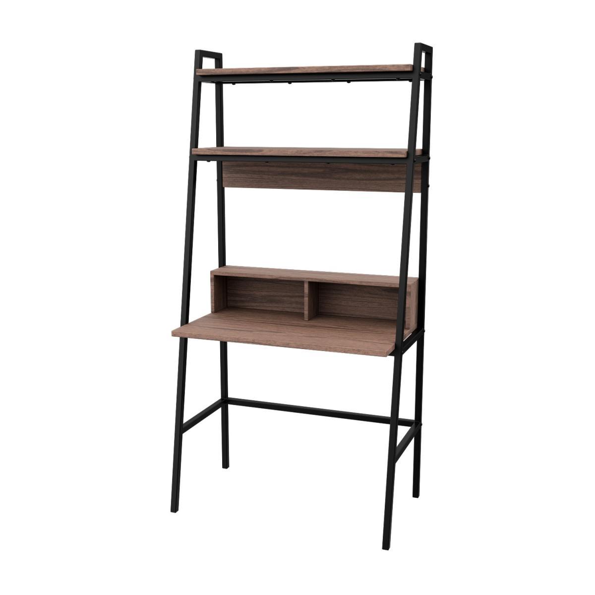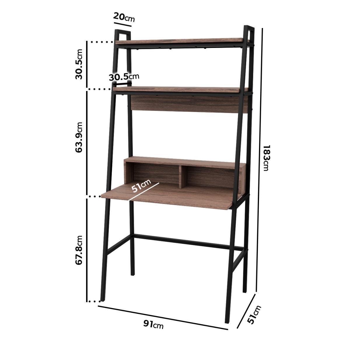 Features we love Ladder desk with rustic walnut finish and black frame. Space-saving design with two additional shelves. Features two compartments in the desk area for handy storage. High-quality laminated board is resistant to damage. Can be placed in either the office or bedroom. Need to know. Dimensions. H183 x W91 x D51 cm Weight. 35kg Colour. Brown and black Finish. Walnut Material. MDF and metal Assembly required. Yes..