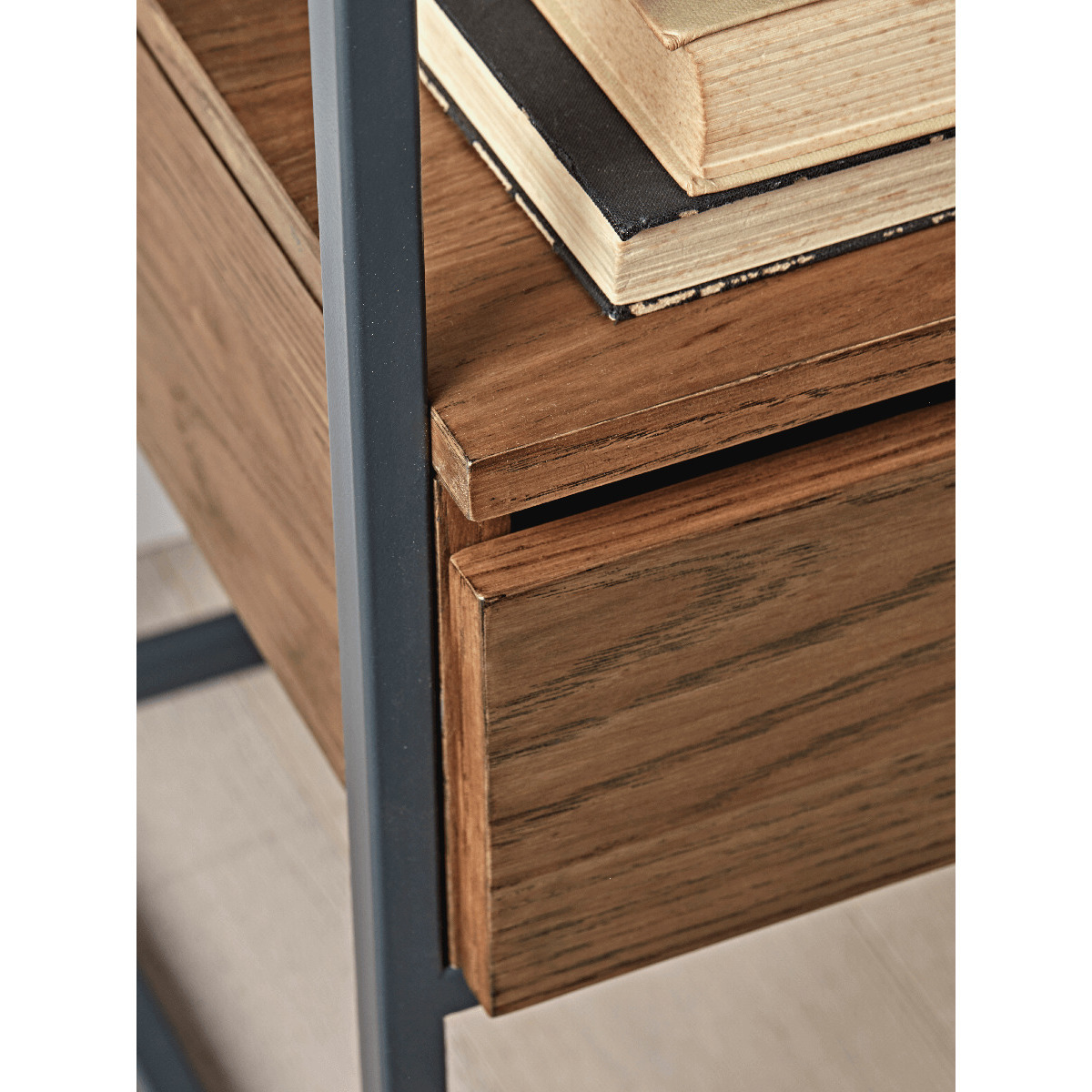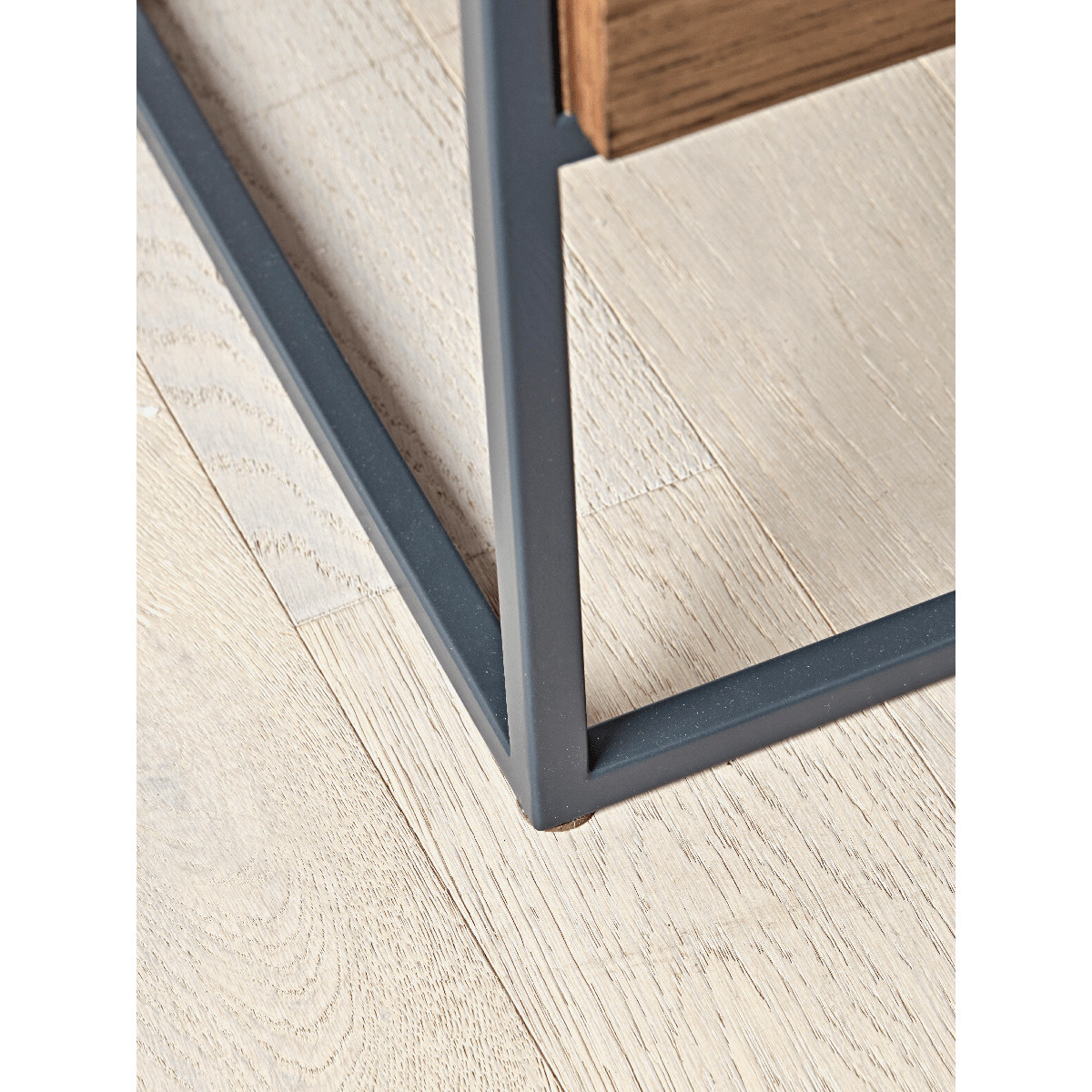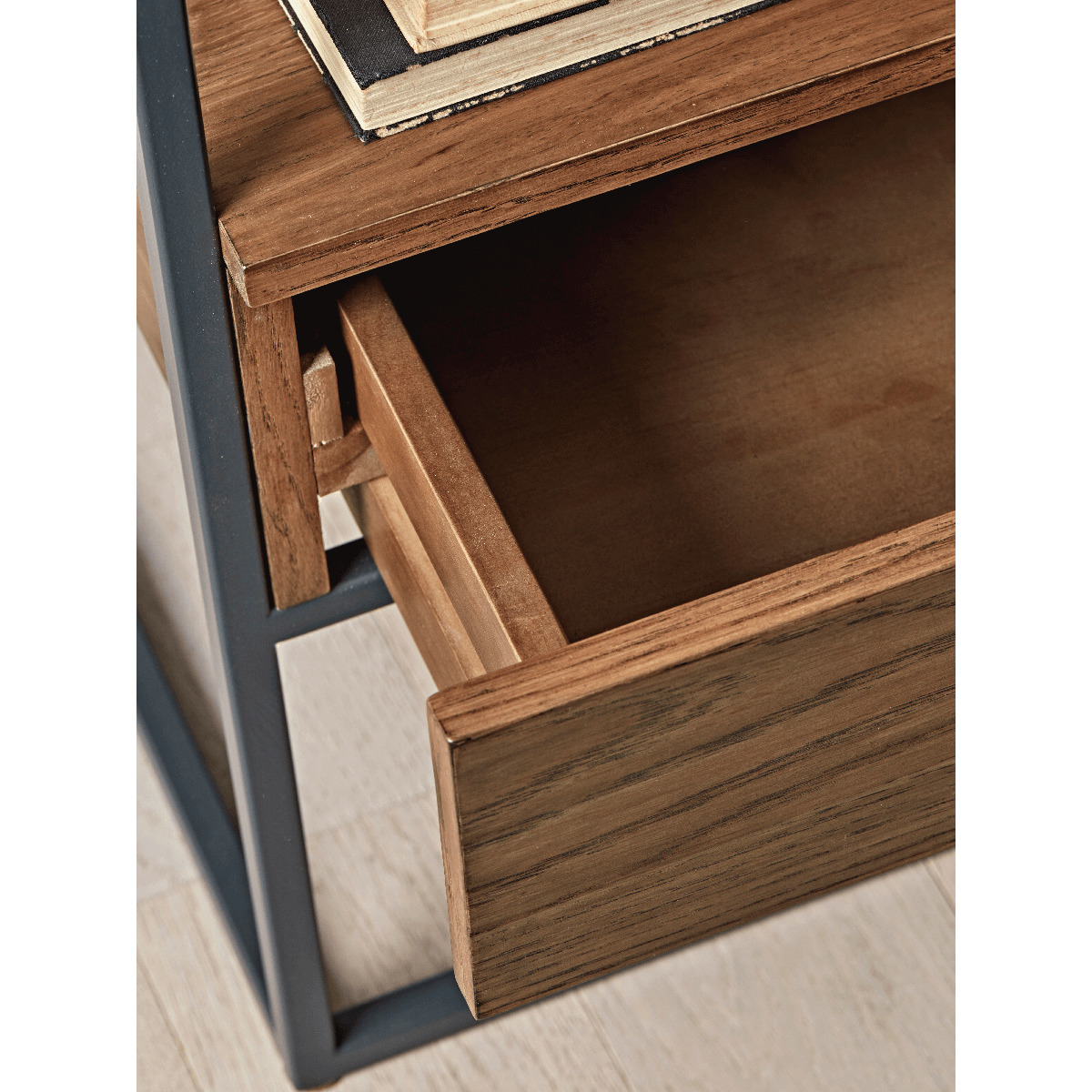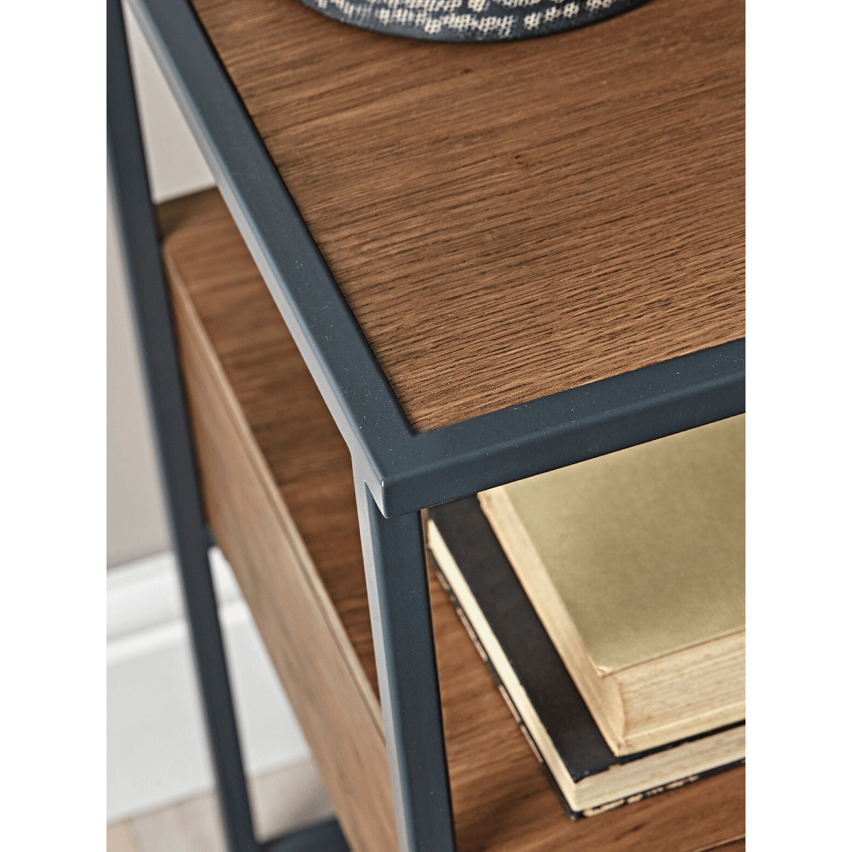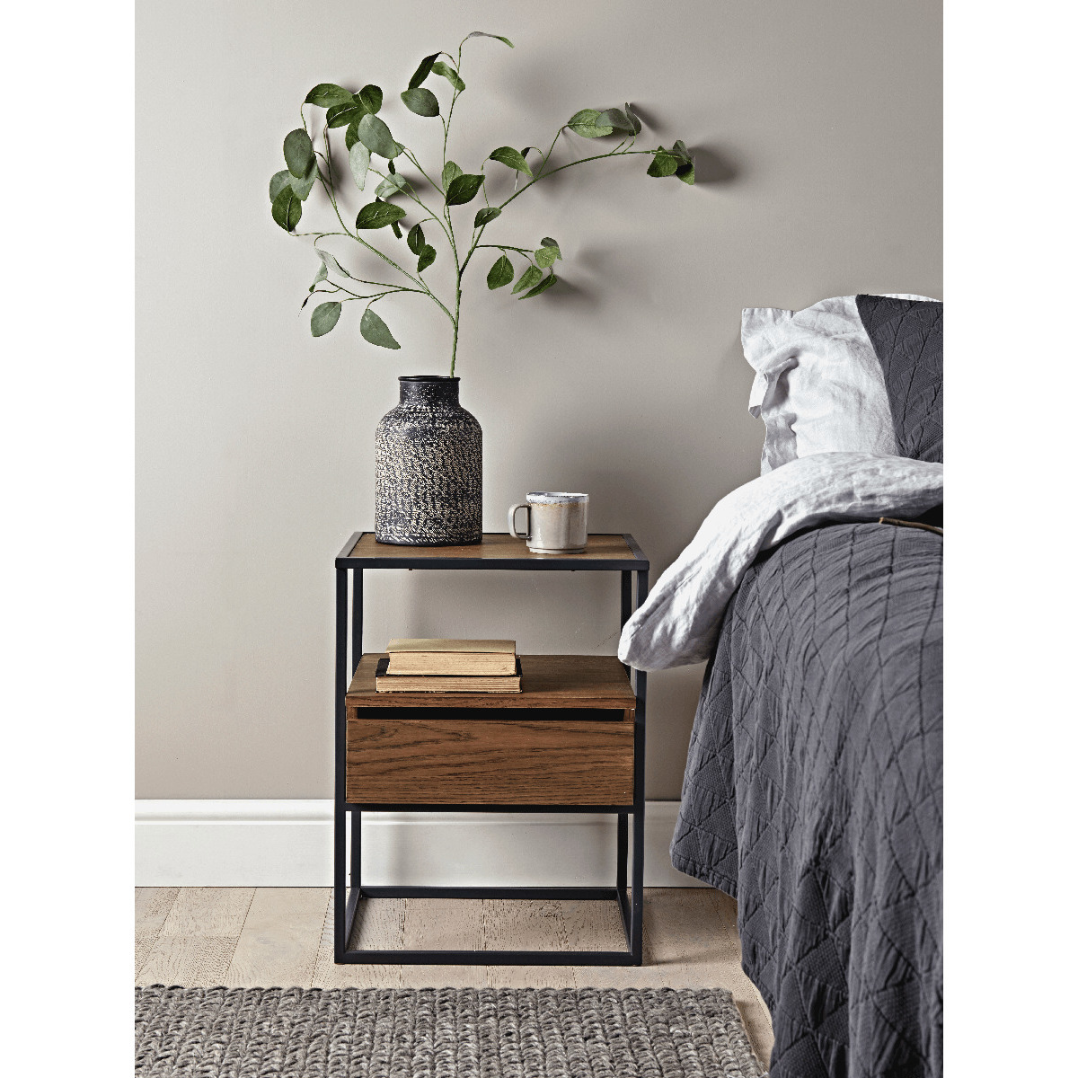 The perfect bedside table for an industrial inspired bedroom, our petite dark wood table features a slender, iron frame and obvious wood grain finish. With an open shelf and single drawer, its perfect for storing your bedside essentials.