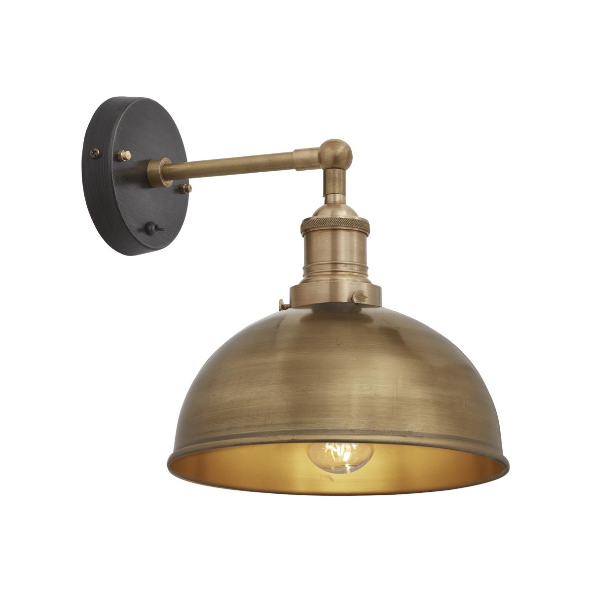 The Industville Brooklyn brass eight-inch dome wall light delivers lots of urban attitude wrapped in a warm honey-hued glow. The masculine aesthetic created by the structured and minimalist design is juxtaposed with the rich golden tones of its brassy finish, making this wall light a fantastic blend of minimalist sophistication and cosy warmth. Position your Industville dome wall light outside the front door to your home for an elegant entrance; alternatively, display it indoors, perhaps to give your kitchen light fittings an elegant makeover. The Industville Brooklyn dome wall light elevates its environment with its style, sleek silhouette and urban cool. These Lights are IP20 rated. SHAPE: Dome FINISH: BrassSHAD. E MATERIAL: Brass with a protective lacquer All images property of Industville Dimensions: W:20 x D:28 x H:26.5cm SHADE: Diameter: 20 cm x Height (no holder): 10 cm HOLDER:Diameter: 6 cm x Height: 18 cm ROSE: Diameter: 12 cm x Height: 2 cm