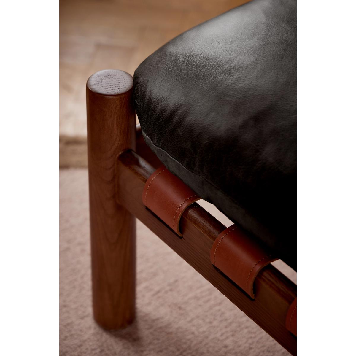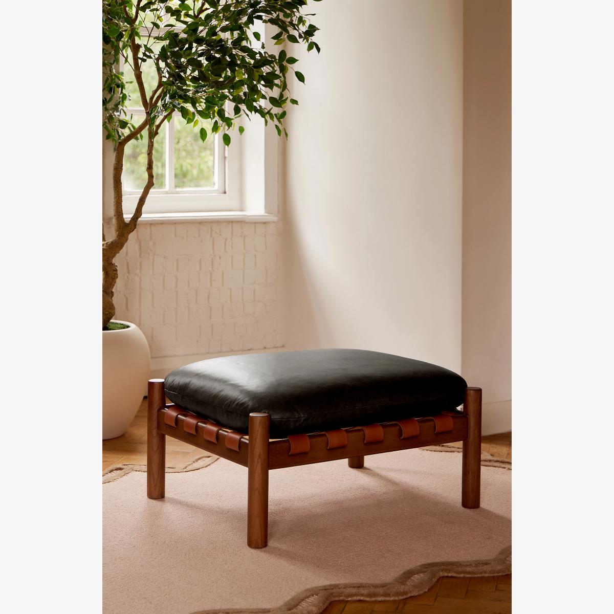 Leather upholstery and a woven base make this ottoman a functional statement piece to put your feet up. * 100% Leather upholstery * Cushion content: foam & fiber * One removable seat cushion * Sinuous spring seat construction * Kiln-dried hardwood frame * Turned legs * Professionally clean * This item is intended for indoor use * Imported