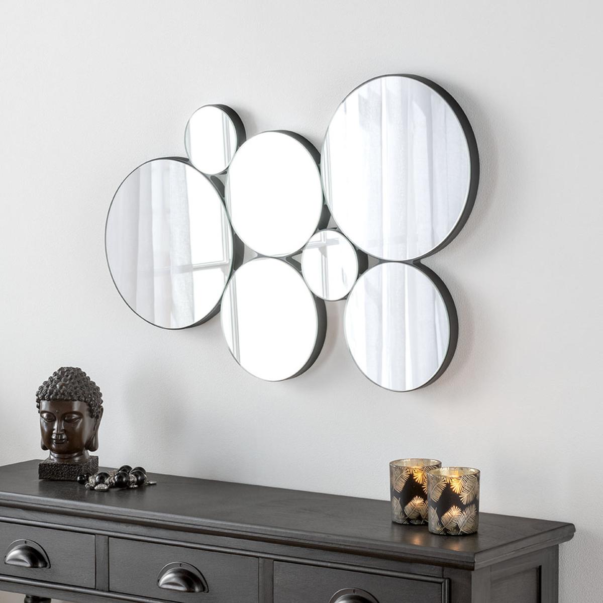 A modern-contemporary focal piece will be a wow factor due to its 'bubble' design. It has seven circled frames ranging in individual sizes but are connected to make one whole modern style mirror. This can be hung vertically or horizontally and has a black, wooden frame.