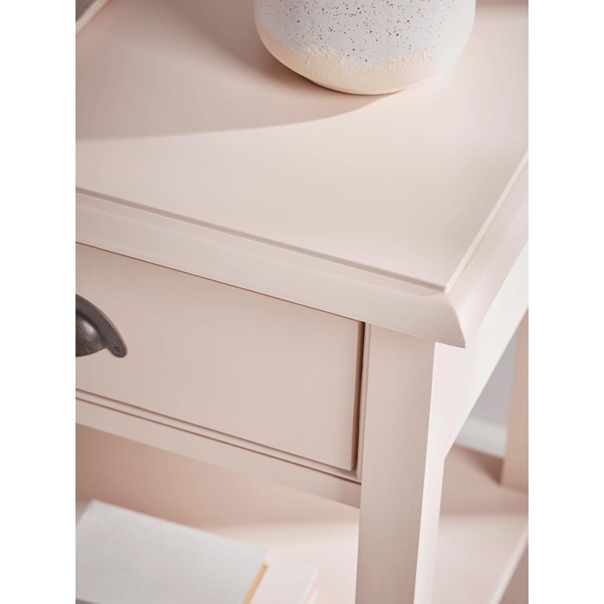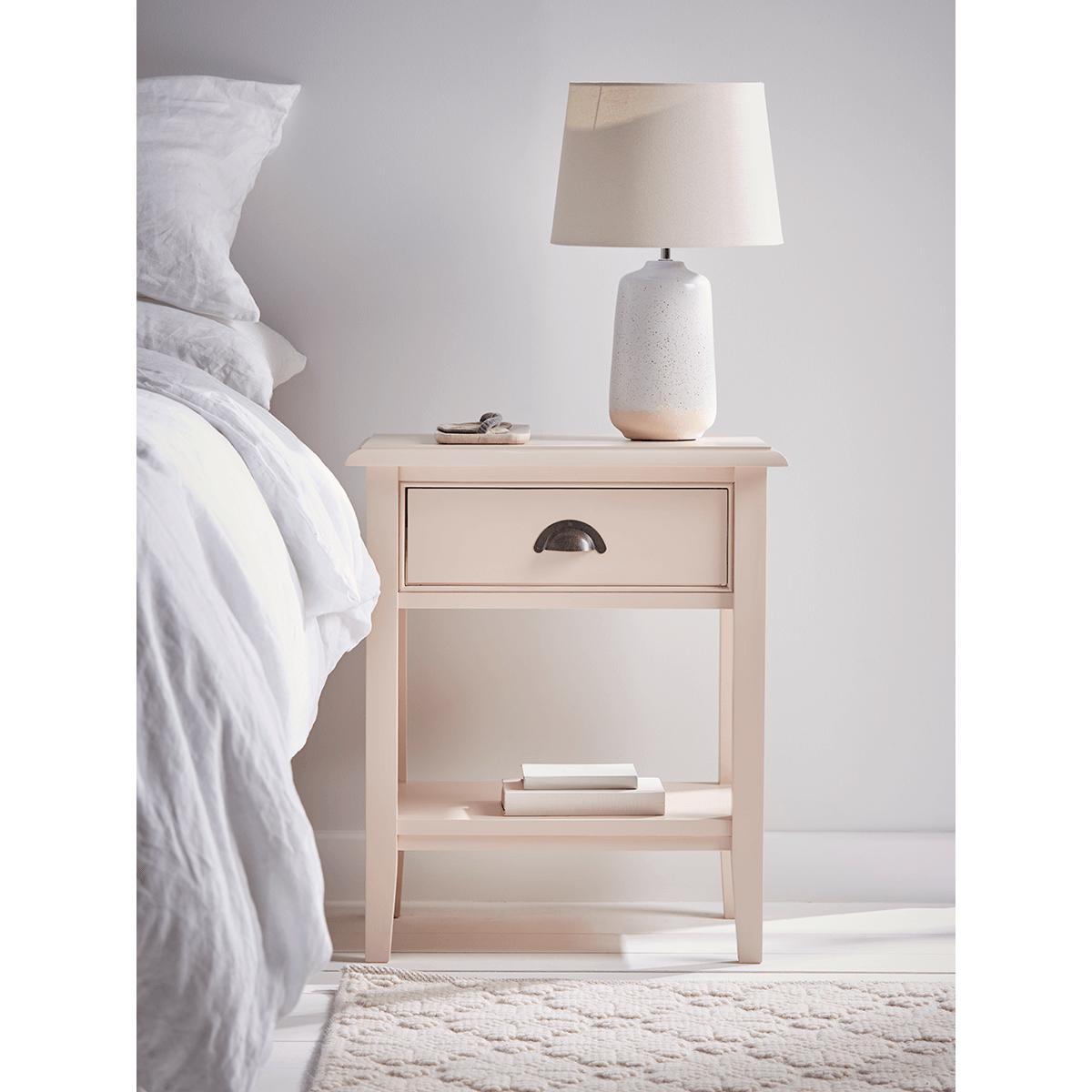 I love the soft blush tone of this bedside table-it adds a touch of colour without overpowering the space, making it versatile for both minimalist and more romantic interiors. It works particularly well in light, airy bedrooms, especially those with pastel colour schemes or neutral palettes. For styling, try layering with a small tray, a candle, and a few favourite books to create a cosy yet functional vignette. Keep the overall look clean and uncluttered for a modern feel, or introduce some textured accessories like woven or linen elements for a relaxed, tactile vibe. This piece is practical too, with a drawer for storage and plenty of surface space for essentials.