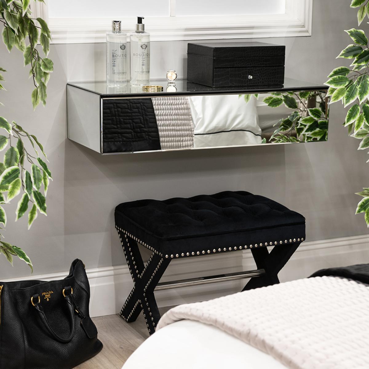 The Inga floating console table provides a useful surface whilst keeping your floor free from obstruction. Made from toughened bevelled mirrored glass with an internal drawer for storage and concealed handle to the underside. Simply and securely fixes to your wall via four screw holes in the rear.