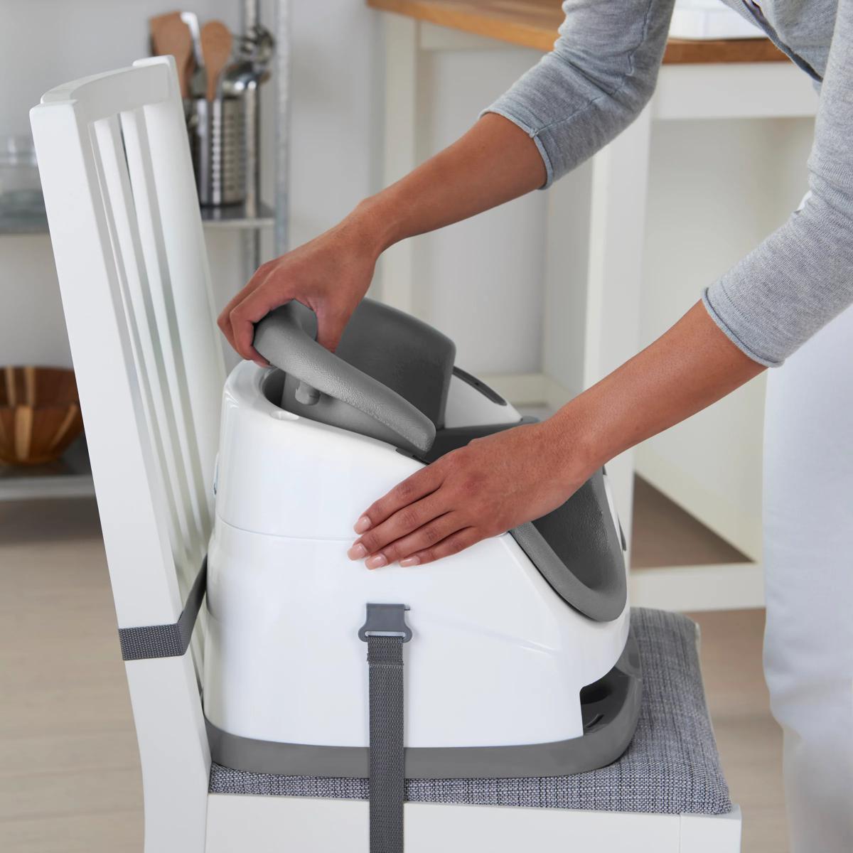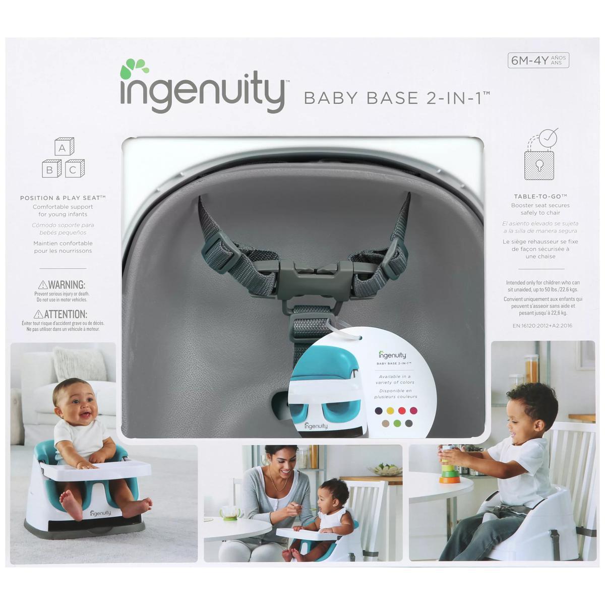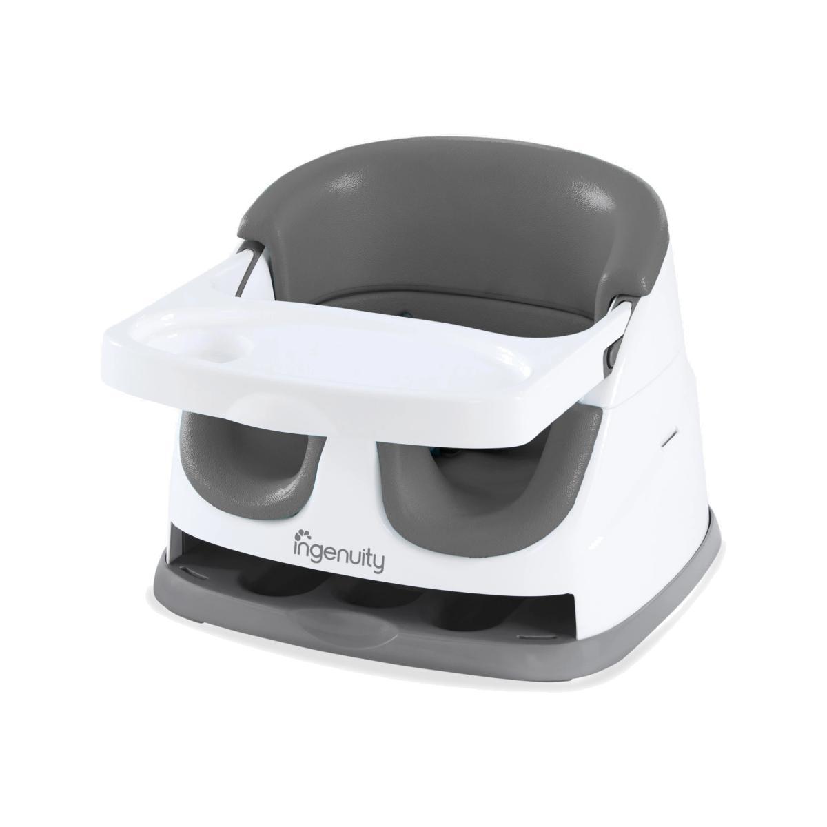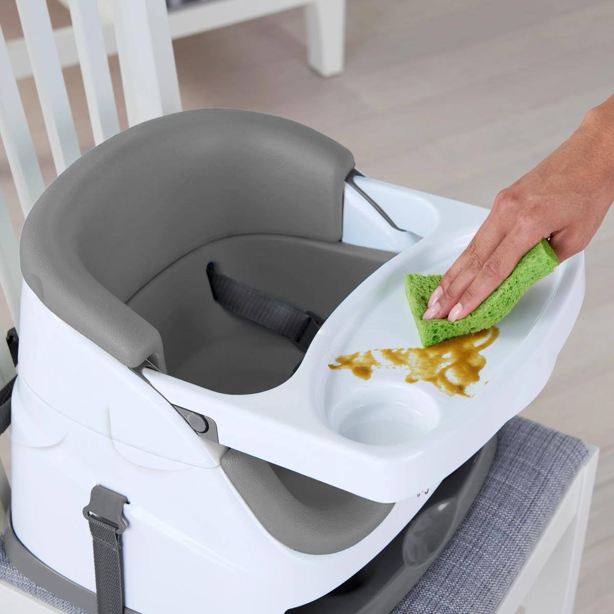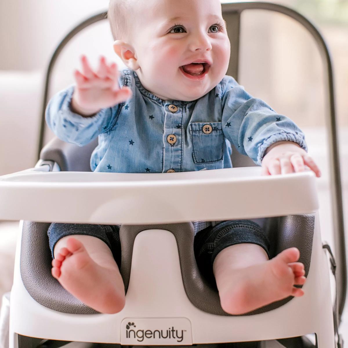 Meals are an important part of family time. Enjoy more laughter and conversation – including baby talk – by giving your little one a seat at the table. The Ingenuity Baby Base 2-in-1 Booster Seat easily attaches to dining chairs so your baby can sit up higher and see more during family dinners. This portable baby feeding seat works just as well sitting with you at the table or as a floor seat during playtime. The removable tray gives your baby her own perfectly sized table, so snacks or toys are easily within reach. When not in use, the tray conveniently tucks away right underneath the booster seat itself. As your baby grows, you can remove the foam seat insert and convert the baby booster into a toddler seat. For all those meals in between, you can count on the wipeable seat and dishwasher-safe tray to leave you more time for family catch-up and less for kitchen clean-up. Key features: Wipeable feeding seat and washable tray for easier cleaning Safe & secure baby seat for sitting up Converts from baby booster to toddler seat Removable tray stores neatly under the booster seat Mealtime seat for at home or on the go use BPA-free tray