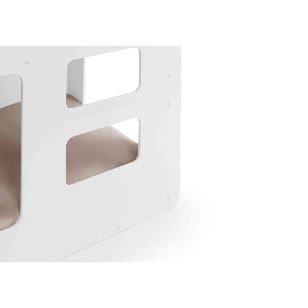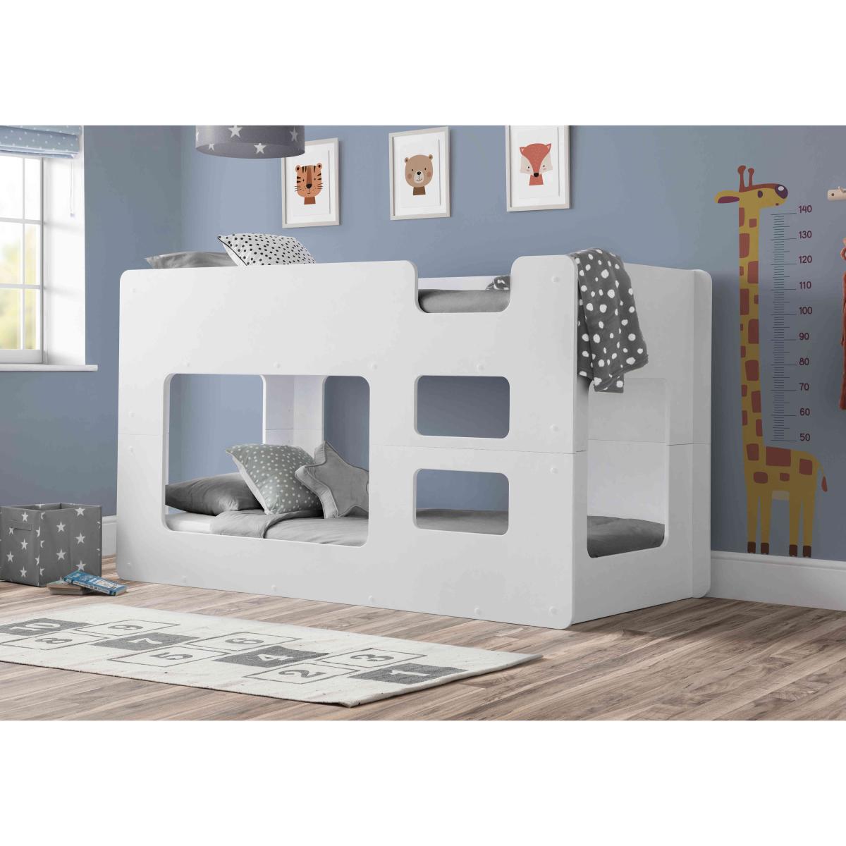 A sleek contemporary design and spacious sleeping space makes the Inger Pod Bunk Bed perfect for saving room for more fun and games. Why you'll love it Fun pod design makes bedtime the best part of the day. Crafted from sturdy materials and built to last. Lower bunk is close to the ground, making it well-suited to younger ones. Available in 2 stylish finishes, white and dove grey. We also offer a range of kids mattresses that’ll fit perfectly. This bunk bed is part of our kids bedroom range from Julian Bowen. What you need to know This bed is not supplied with a mattress included. This product is suitable for children aged 6 and over. Please note this item is self-assembly and will take approximately 180 minutes to assemble. Maximum safe mattress depth is 18 cm. Clearance of 10 cm is required either end for assembly.