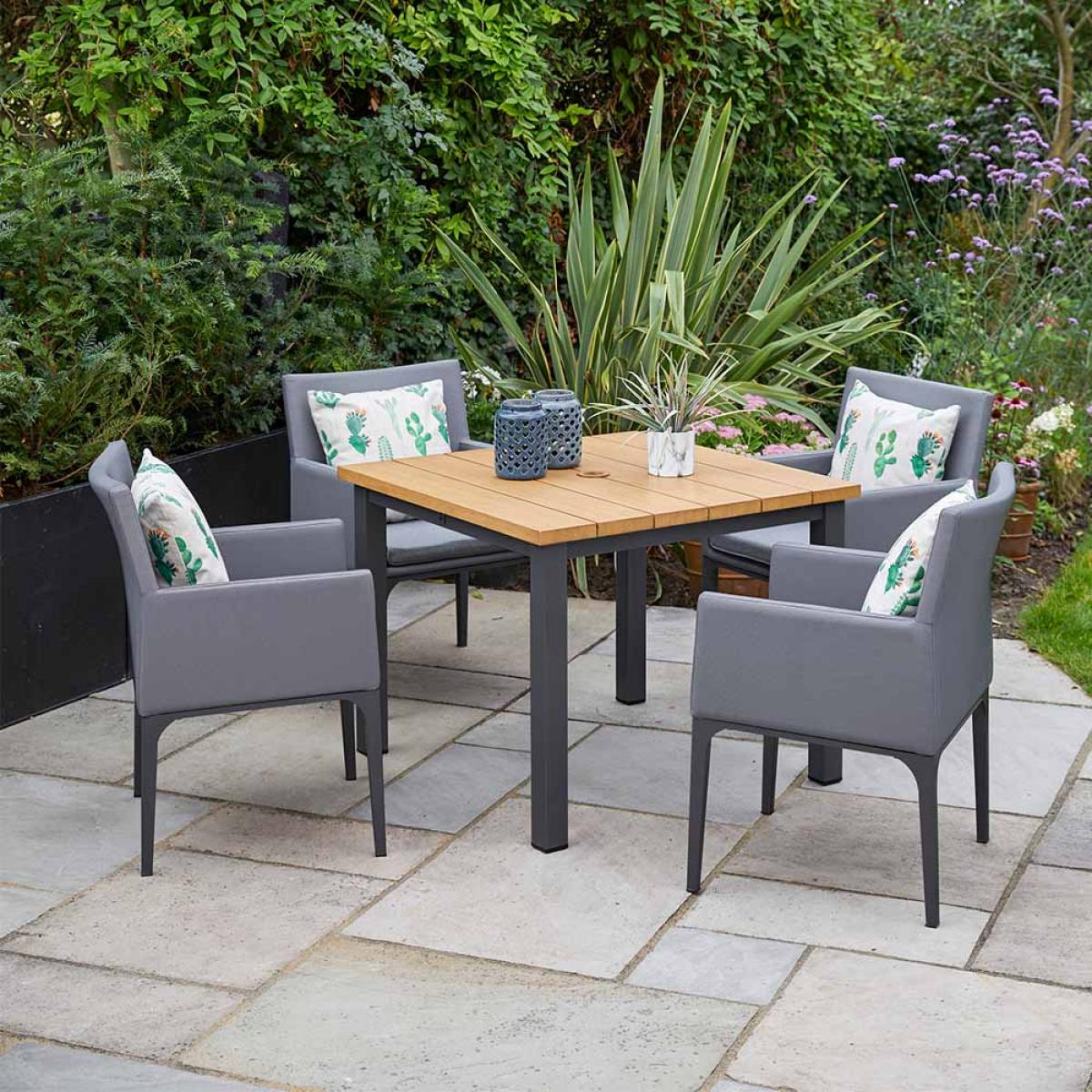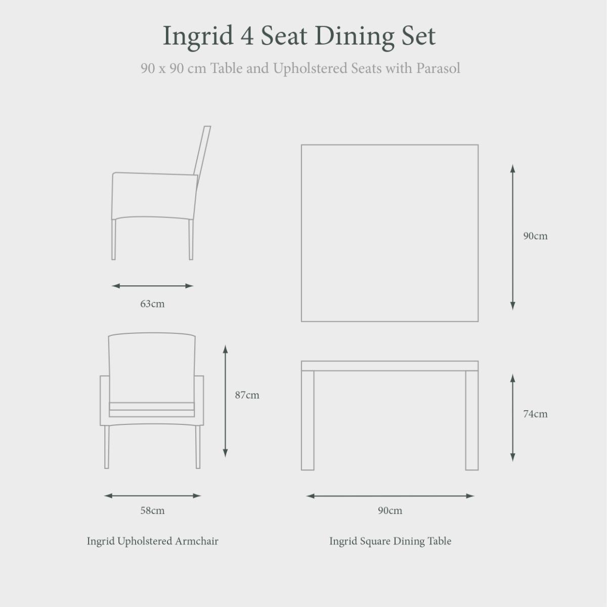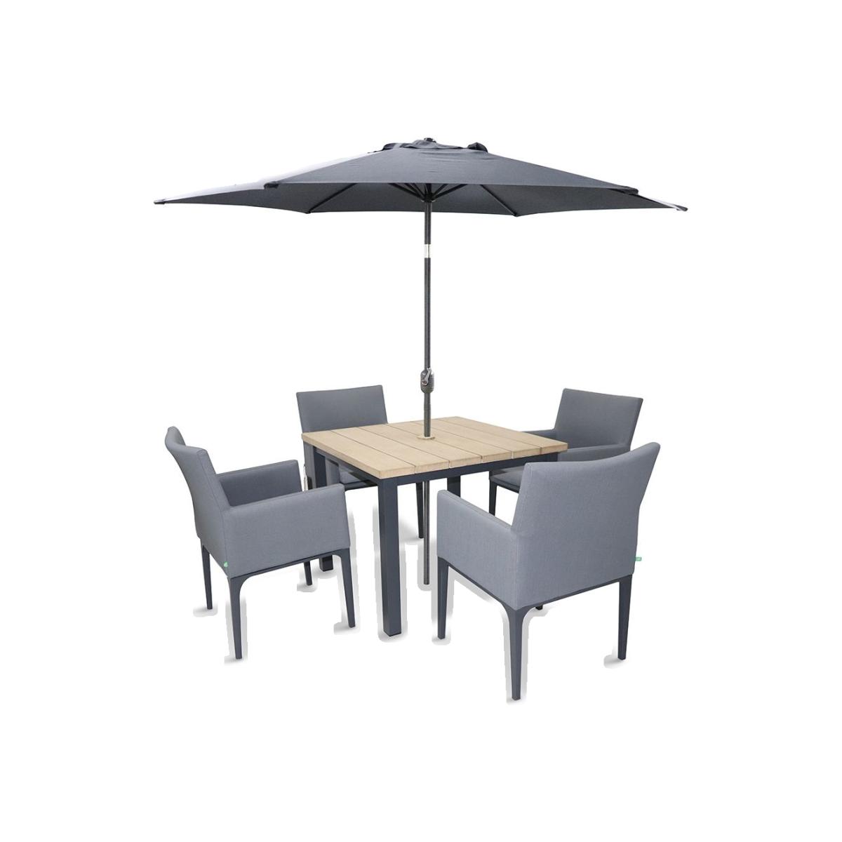 Clean-lined and contemporary, our all-weather Ingrid 4 Seat Upholstered Dining Set with Parasol is a Scandi-inspired design with comfy armchairs, teak-effect tabletop and deluxe 2.5m parasol. The chairs are just as comfy as indoor chairs, perfect for creating an outdoor room, while the parasol offers good protection from the sun. Our Ingrid range is sleek, streamlined and contemporary with upholstered weather-proof chairs that will look great for years to come. Cushions are UV resistant, water repellent and quick to dry after a summer shower so you can leave this set outside all season. The bull-nosed curved edge cushions come with removable zipped covers for easy cleaning, making this set low maintenance and easy to keep looking good as new. The Texteline design is comfortable and easy to move around while the graphite grey aluminium frames are rust-resistant and complement the slatted and hand-brushed wood-effect tabletops beautifully.