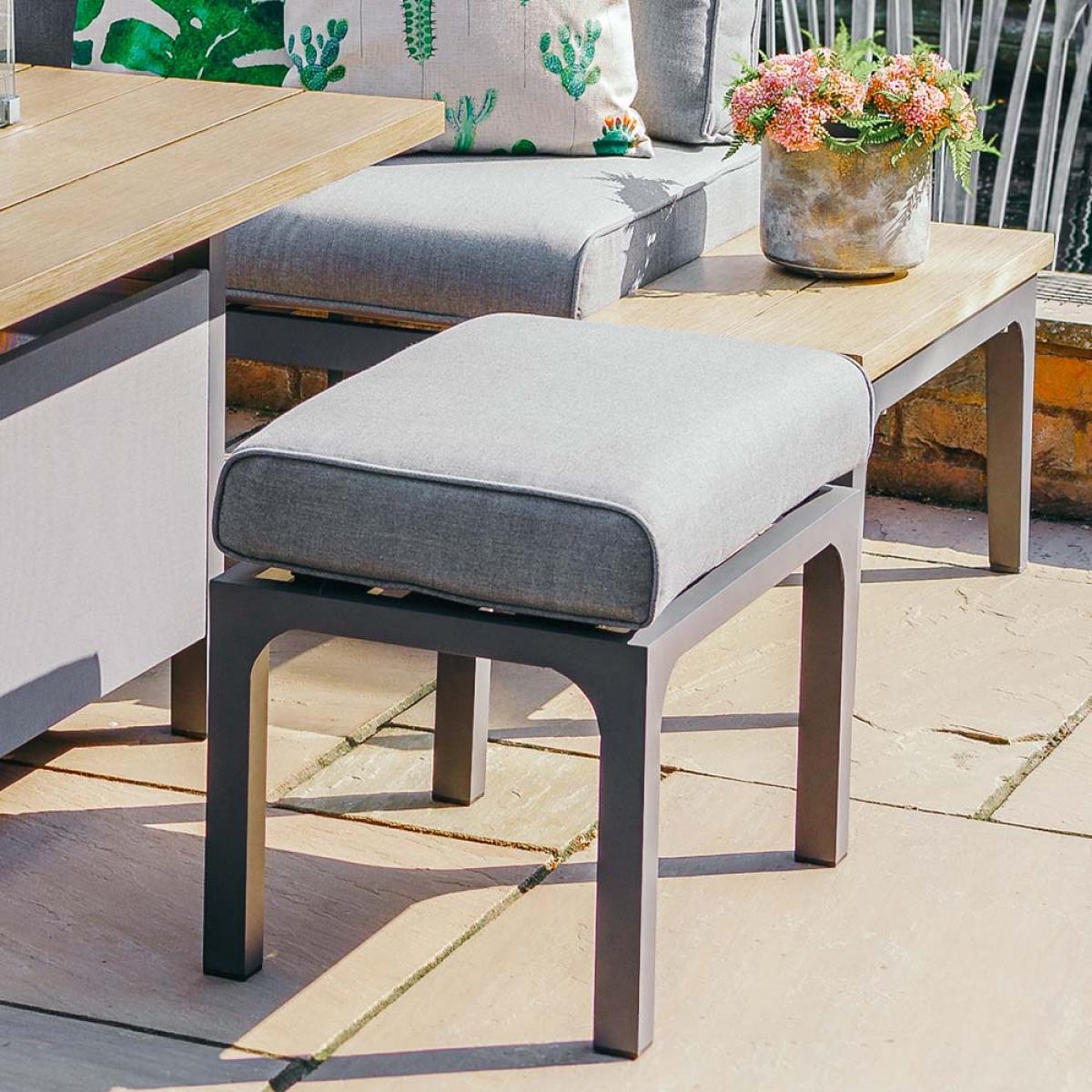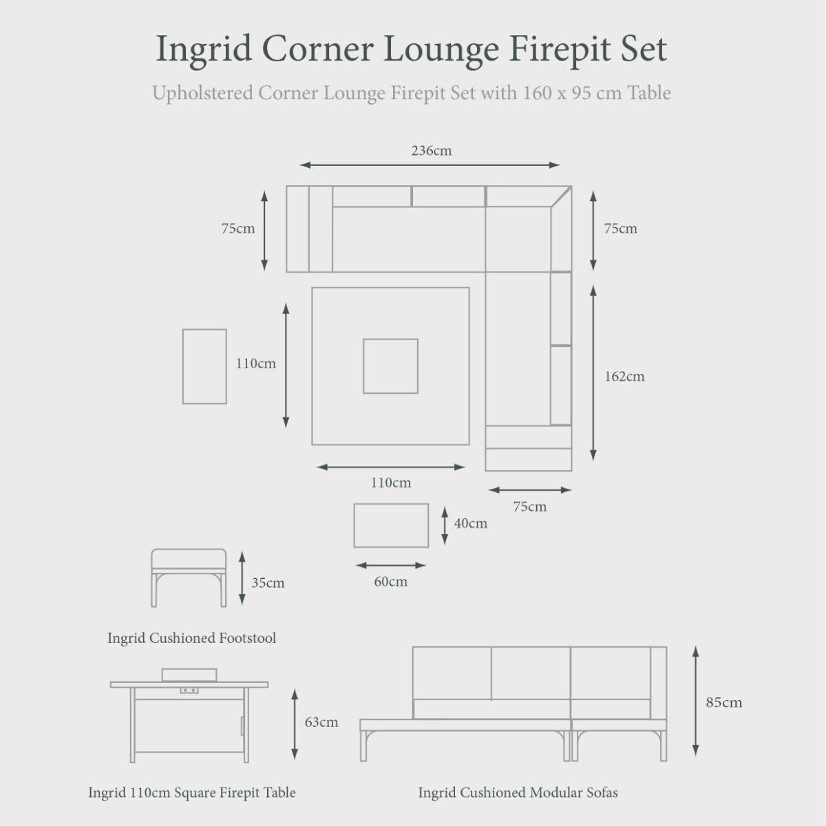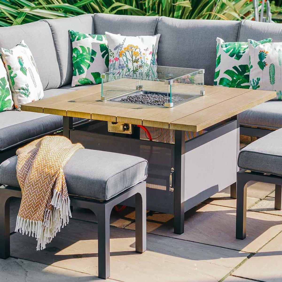 Enjoy your outside space whatever the weather with our all-weather Ingrid Upholstered Corner Lounge Firepit Set, perfect for slotting neatly into the corner of any patio, terrace or decking. The open sides of the seating accommodates useful tables on the side for placing drinks. This set includes the corner sofa, two benches and a table with firepit in the centre and hidden storage below for the gas canister. Our Ingrid range is sleek, streamlined and contemporary with upholstered weather-proof chairs that will look great for years to come. Cushions are UV resistant, water repellent and quick to dry after a summer shower so you can leave this set outside all season. The bull-nosed curved edge cushions come with removable zipped covers for easy cleaning, making this set low maintenance and easy to keep looking good as new. The Texteline design is comfortable and easy to move around while the graphite grey aluminium frames are rust-resistant and complement the slatted and hand-brushed wood-effect tabletops beautifully.