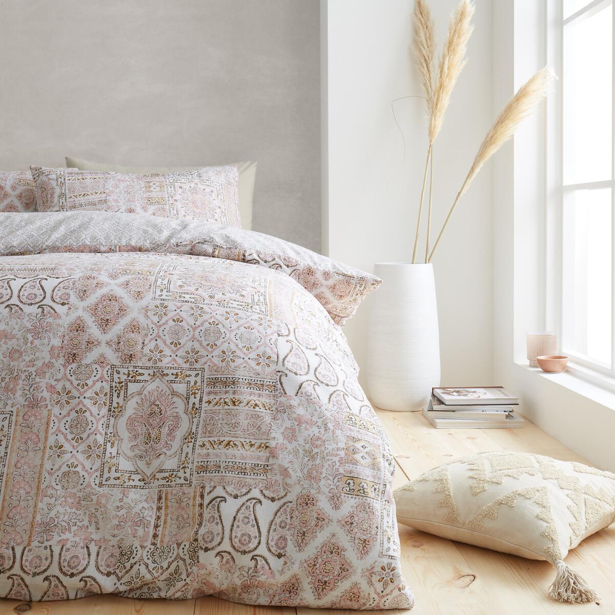 This inspired collection of eclectic designs are a fusion of influences from across the world with a modern interpretation of artisan motifs and timeless textures. Reminiscent of bustling traditional Moroccan souks, this authentic mosaic style textiles patchwork design has intricate decorative detailing influenced by hand-crafted Kaftan fabrics. Whilst the calming colour palette gives a modern sensibility to a timeless feel to your home. Crafted from 100% Cotton. Machine Wash at 40 Degrees. Single Duvet Set - 135x200cm + 1 50x75cm Pillowcase, Double Duvet Set- 200x200cm + 2 50x70cm Pillowcases, King Duvet Set - 220x230cm + 2 50x75cm Pillowcases and Super King Set - 220x260 +2 50x75cm Pillowcases. This product will be dispatched by one of our trusted suppliers. You’ll be contacted by their selected courier about your delivery.