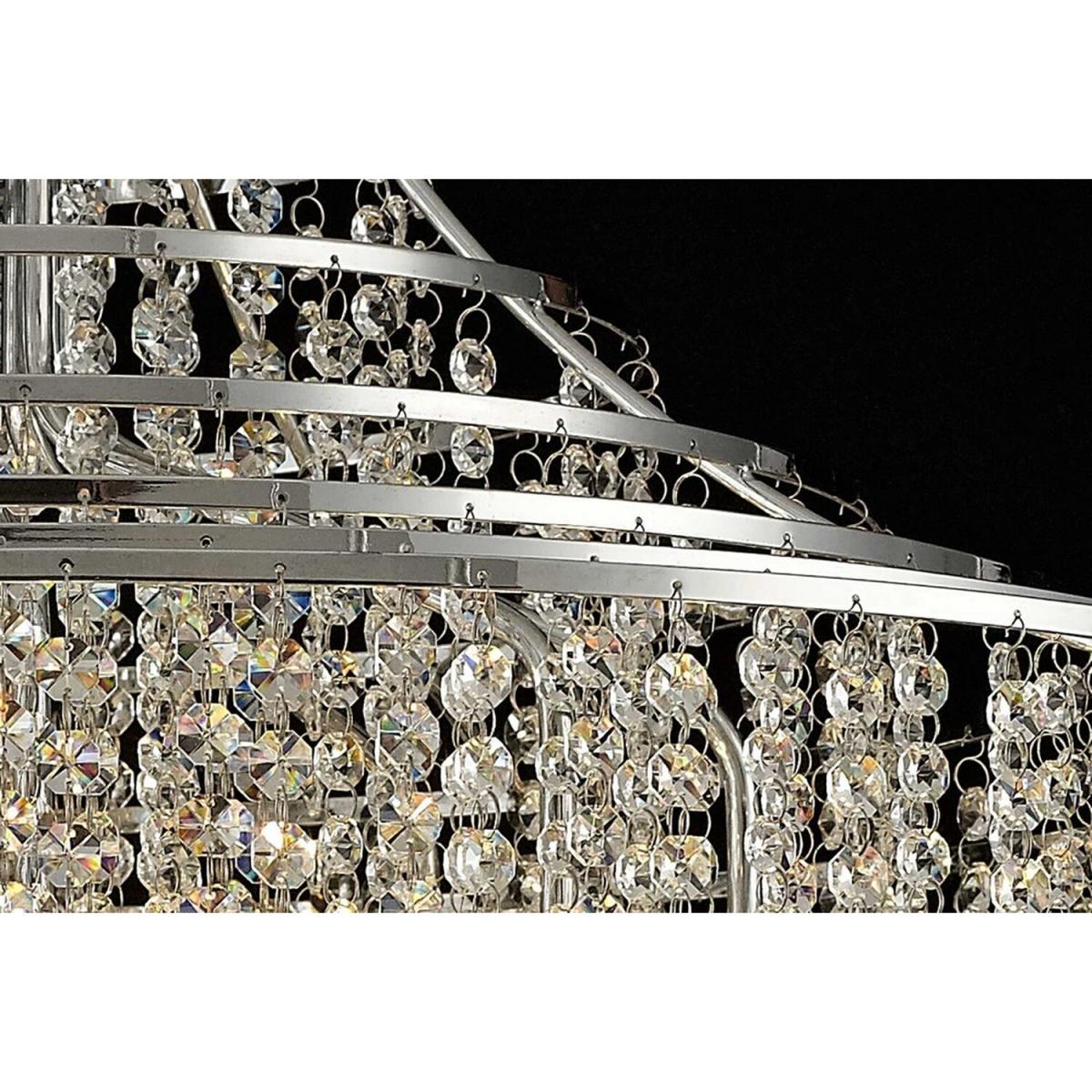 A flagship range of fittings that are dressed with an excessive amount of high quality crystal. Suspended from a Polished Chrome or French Gold framework are strands of clear octagon crystals supporting a larger clear crystal prism. The sheer quantity of crystal faces within any of this fixtures, create an immense amount of sparkle and spectral colour.