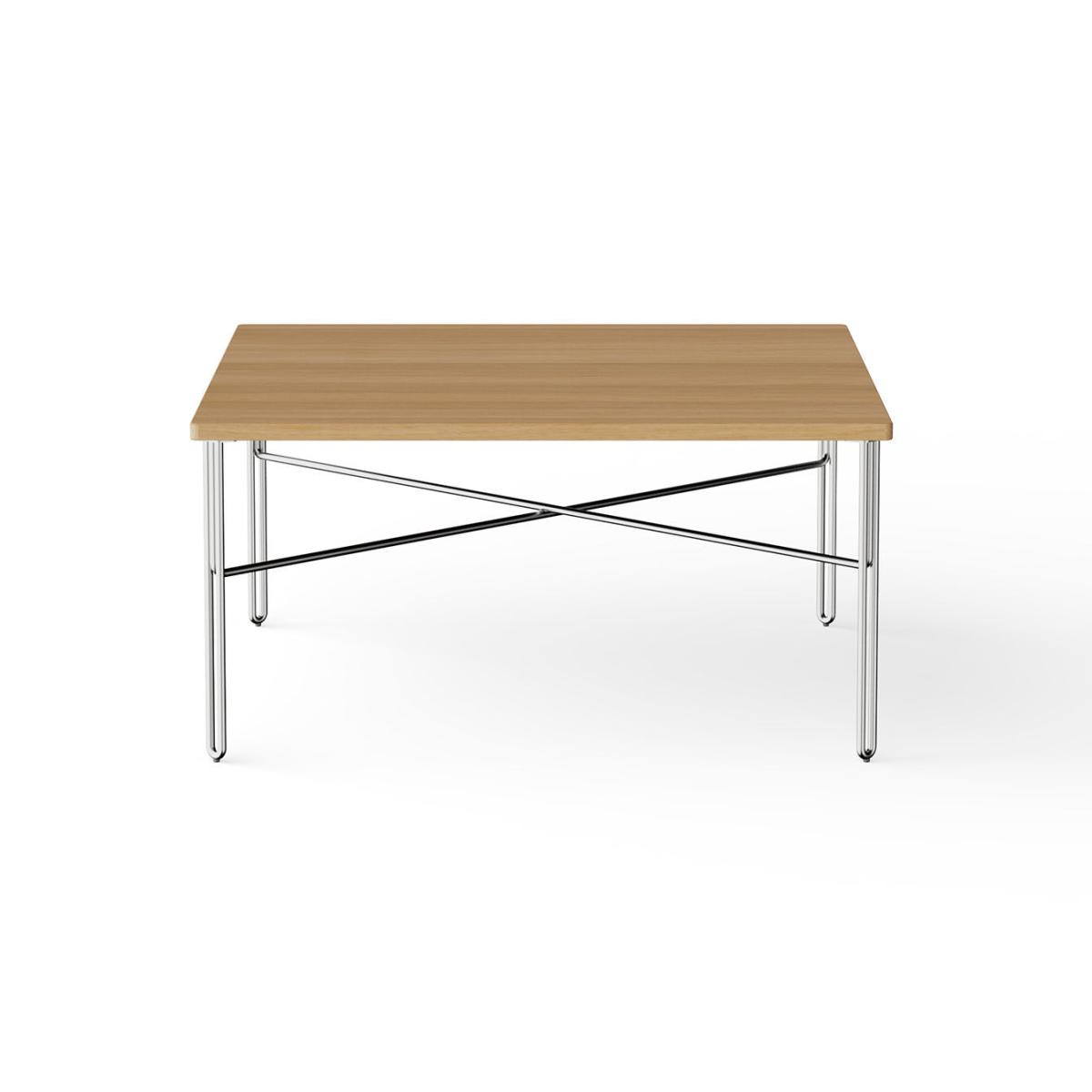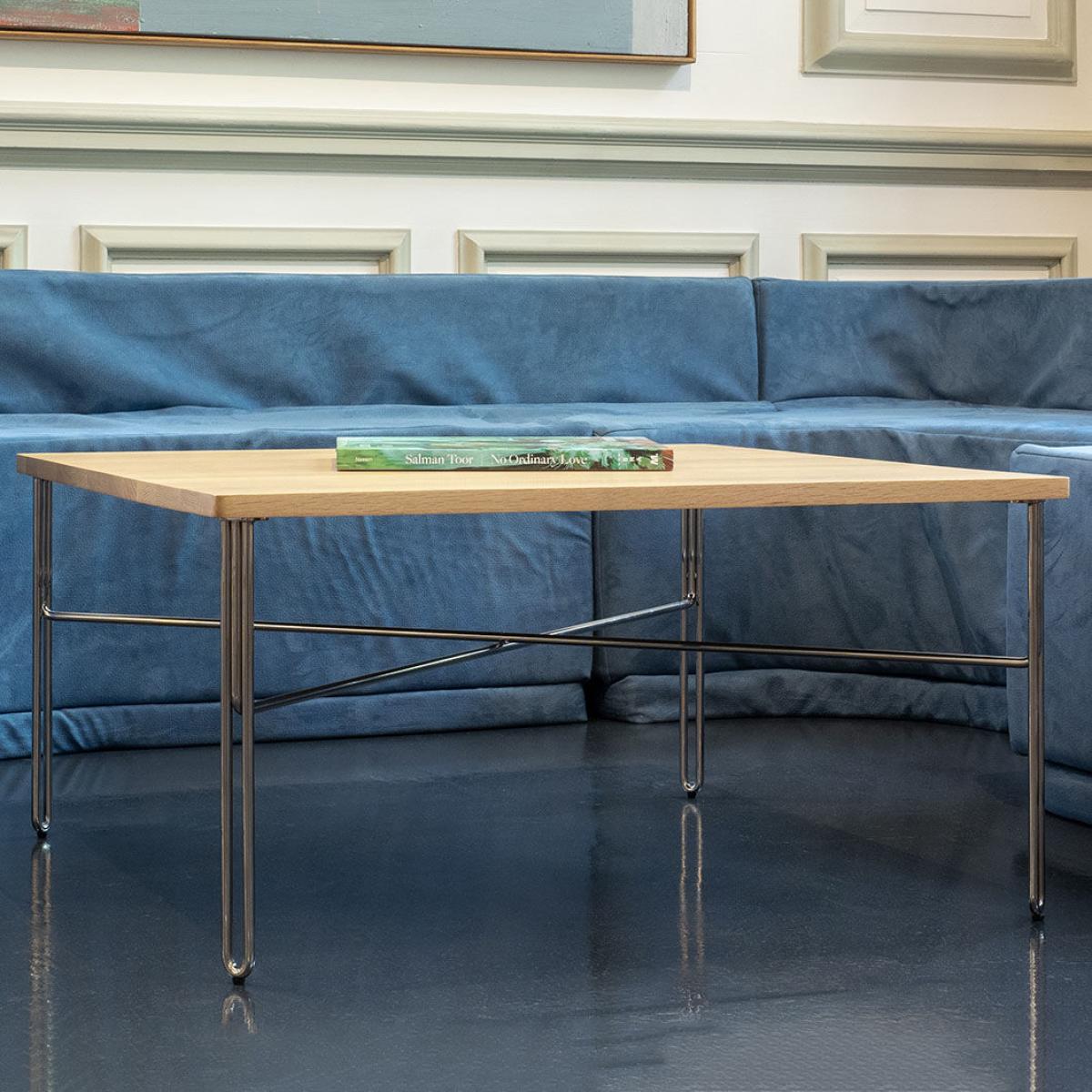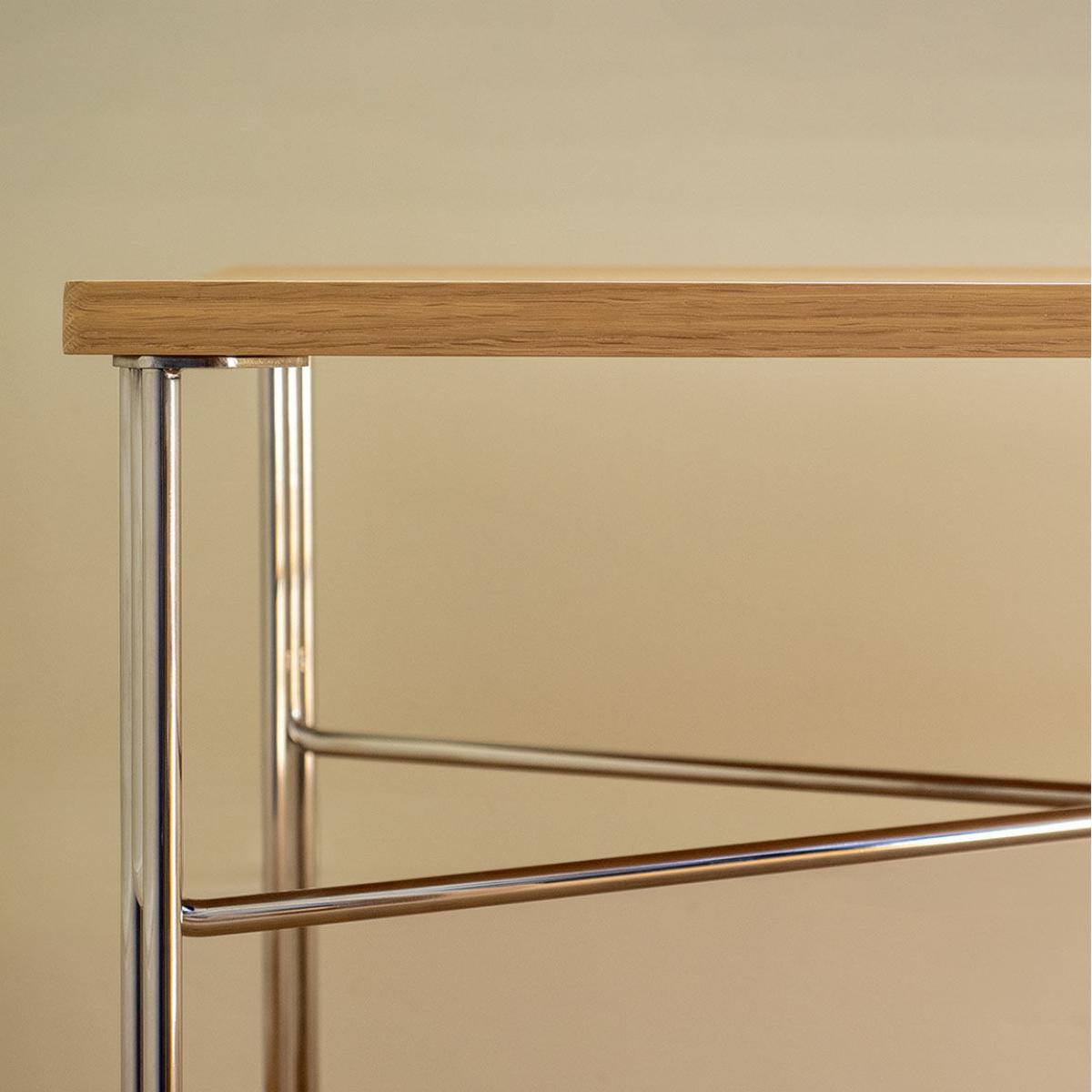 Julien Renault, a French designer living in Brussels, draws his inspiration from Danish design, the Shaker style, modern Swiss design and the modernist period, using understated, honest materials which appear simple, natural and yet also full of life. Inline is a collection of coffee tables and shelves characterized by parallel, stainless steel legs and frames. The designs are based on Renault's bold linear sketches, where simple, tautly curved, straight lines combine to create elegant, yet robust, structures. The legs and frames are made from polished, stainless steel while the table tops and shelves are made of sold oak. There are 3 different size coffee tables, 2 different size wall-mounted shelves as well as a floor-standing shelving unit.