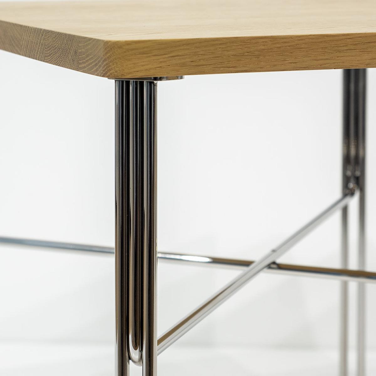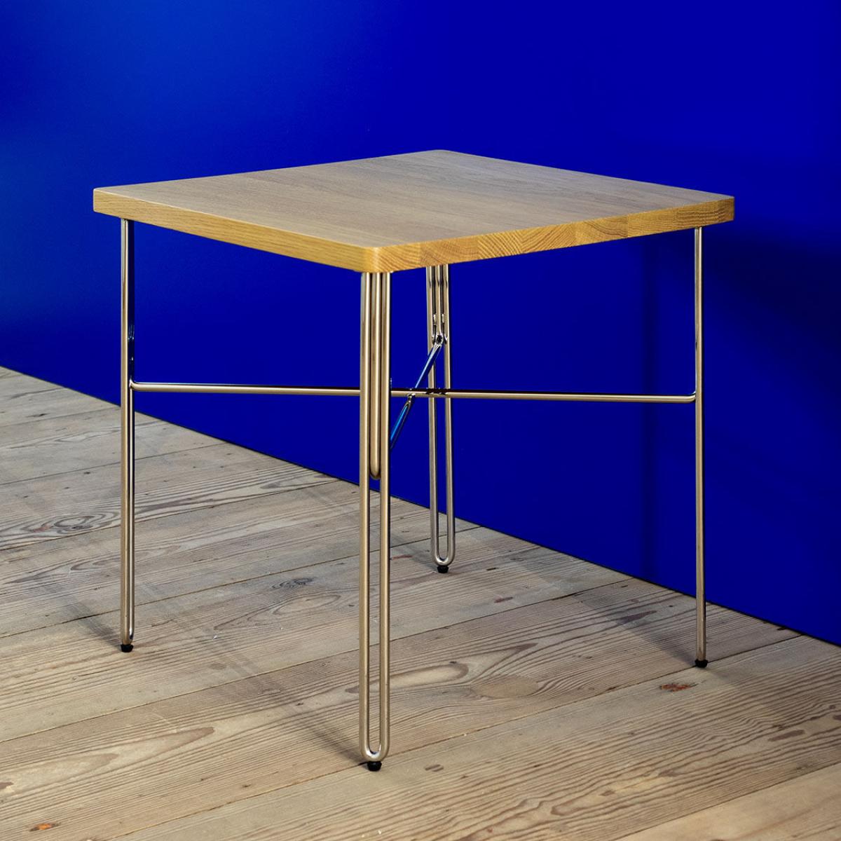 Julien Renault, a French designer living in Brussels, draws his inspiration from Danish design, the Shaker style, modern Swiss design and the modernist period, using understated, honest materials which appear simple, natural and yet also full of life. Inline is a collection of coffee tables and shelves characterized by parallel, stainless steel legs and frames. The designs are based on Renault's bold linear sketches, where simple, tautly curved, straight lines combine to create elegant, yet robust, structures. The legs and frames are made from polished, stainless steel while the table tops and shelves are made of sold oak. There are 3 different size coffee tables, 2 different size wall-mounted shelves as well as a floor-standing shelving unit.
