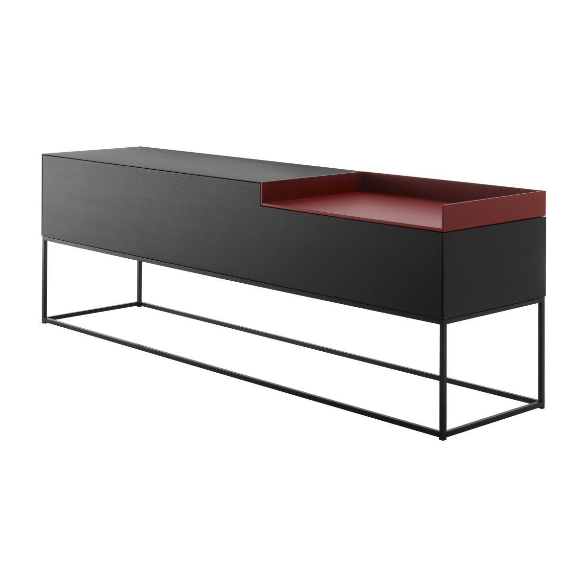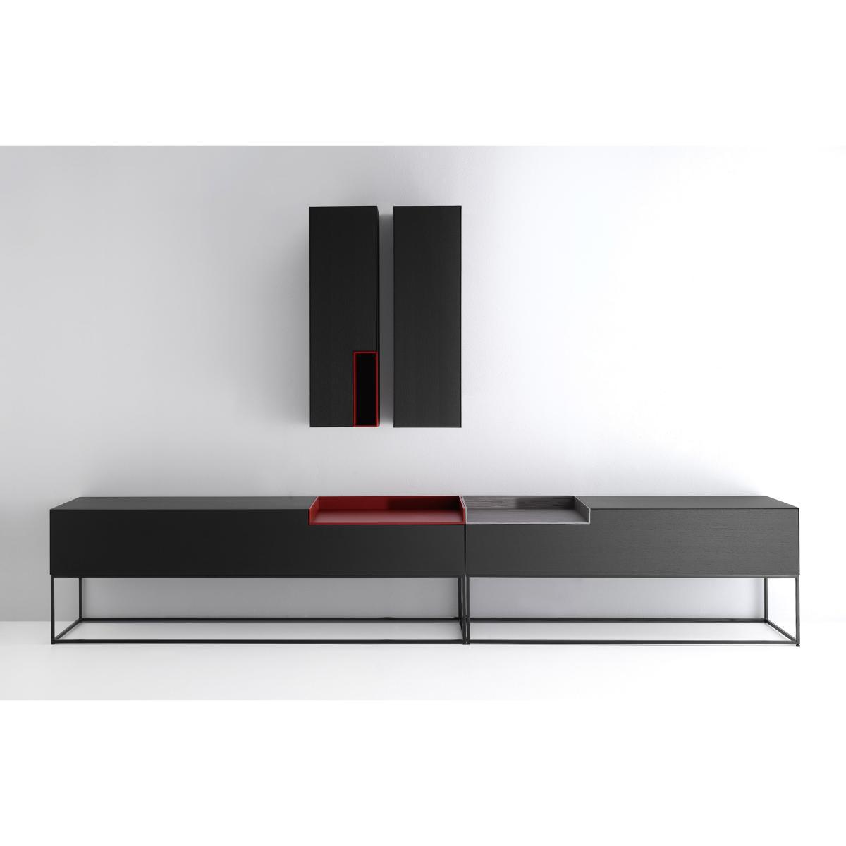 Sober and distinguished mind for Inmotion sideboard. Graphic and design, functional and practical, it fits in any room: living room, office, bedroom or entrance. MDF medium density, it has a drop down one-piece door. The compartments are large, handy for storing all your daily business. The bin, in grey stained wood contrasts with the set and brings a touch of refinement. The end base in steel and coordinated tinted color breathes great visual lightness. Between architecture and design, this very graphic sideboard immediately captures attention.
