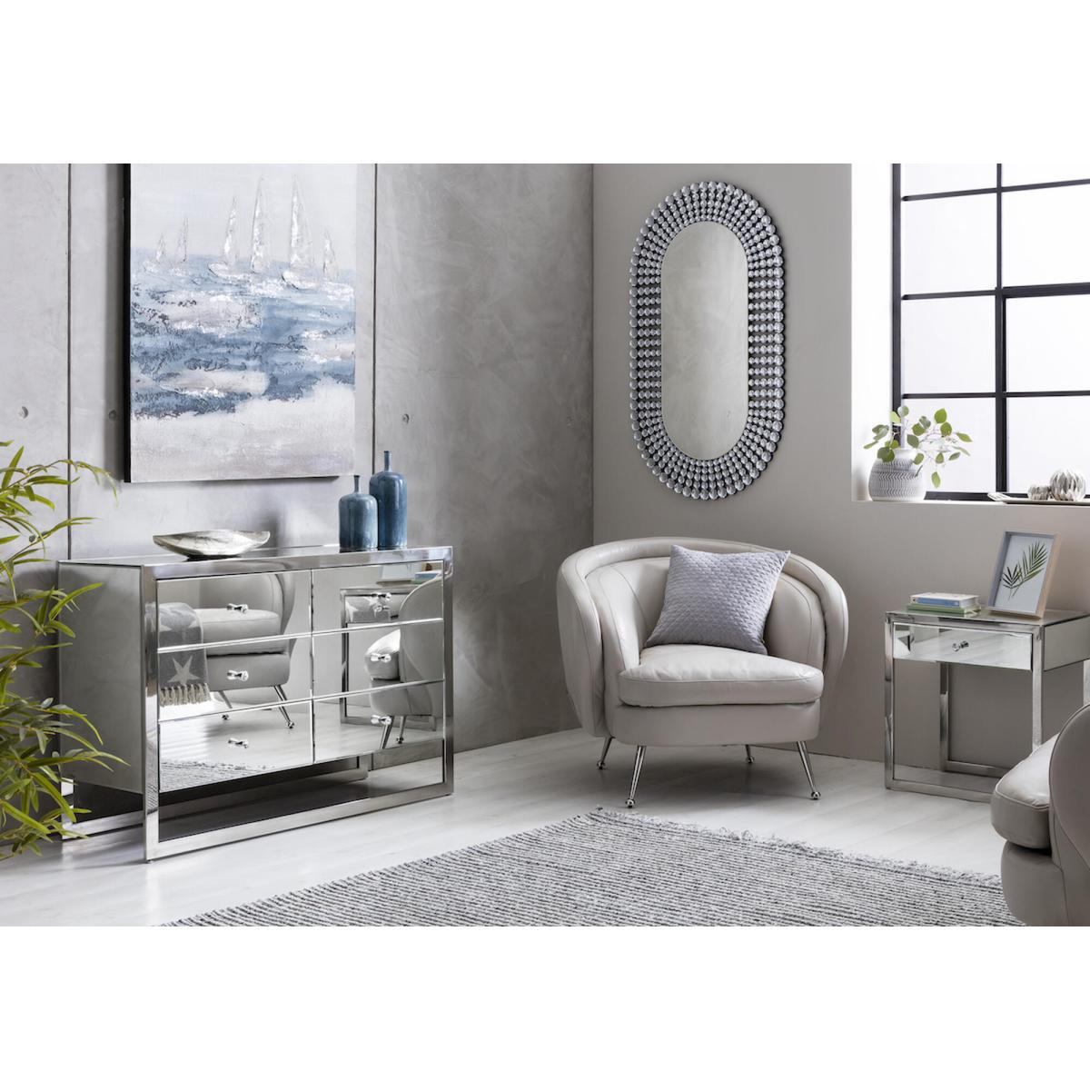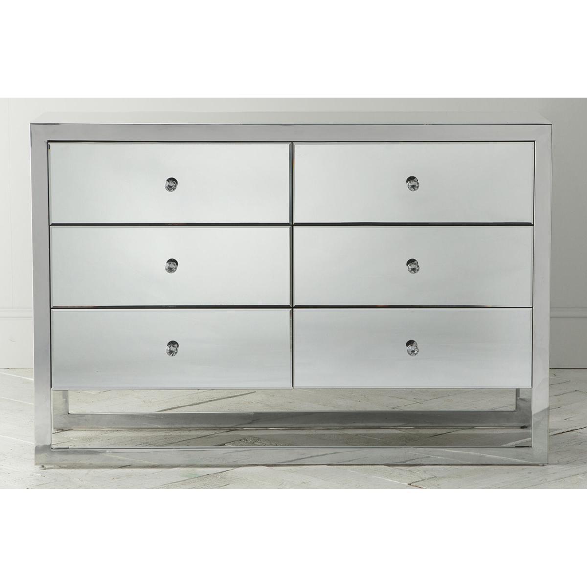 Featuring stylish stainless steal legs in a bright finish. The Inna range has bevelled glass tops and silver handles finished with crystal detail. From books to clothes to trinkets, the Inna Chest of Drawers is the perfect sleek mirrored addition to any bedroom, compact home or all white decors. With six drawers for extra storage, and the decor built right in, the range speaks for itself.