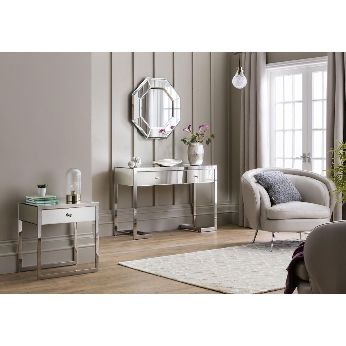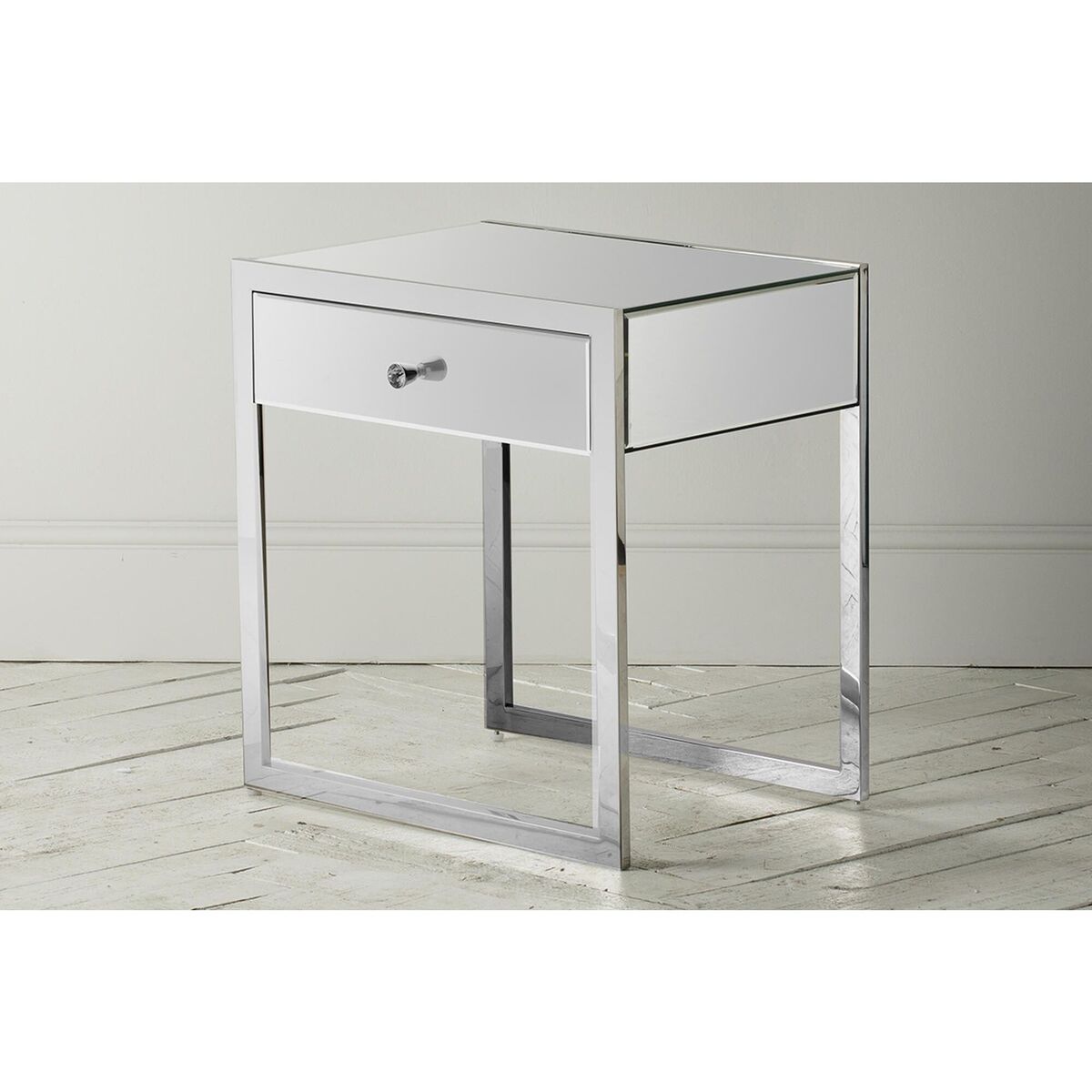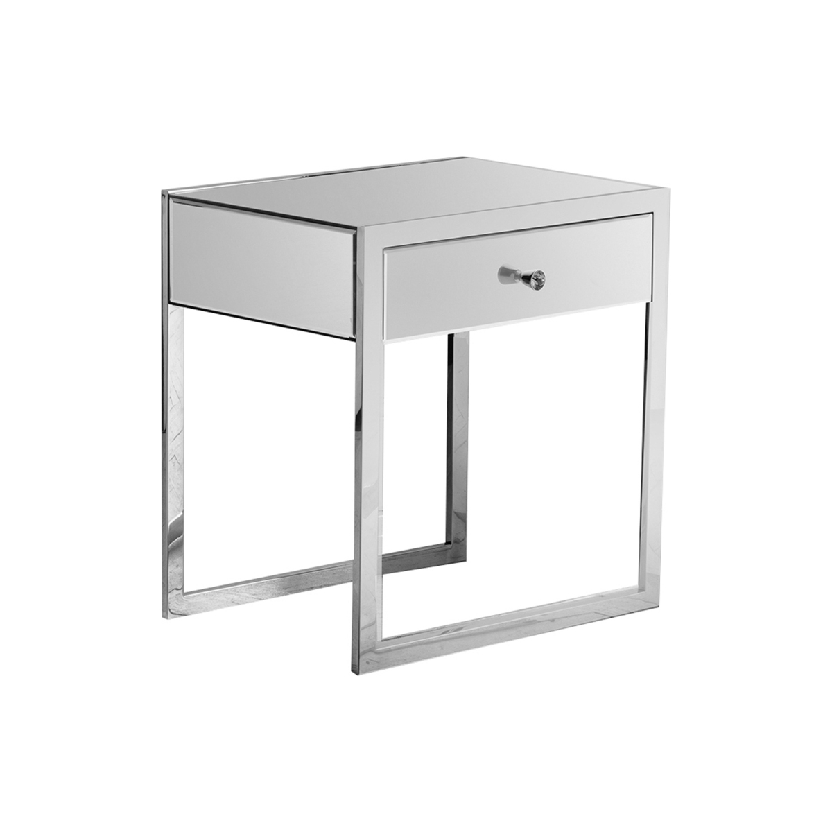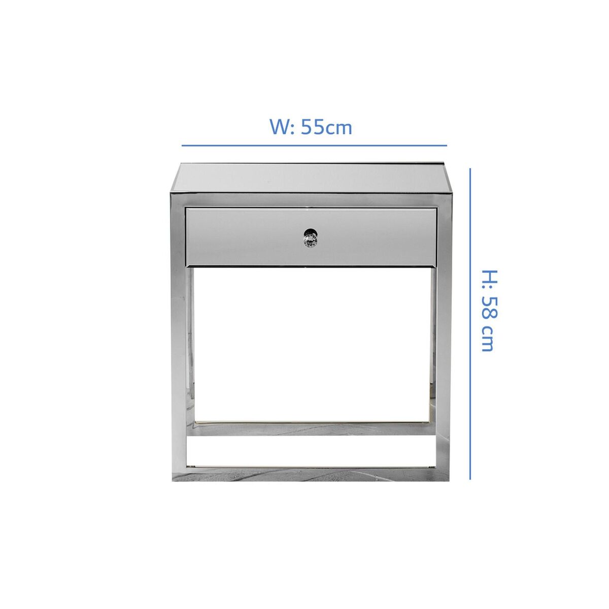 Featuring stylish stainless steel legs in a bright finish. The Inna range has bevelled glass tops and silver handles finished with crystal detail. From books to clothes to trinkets, the Inna Side Table is the perfect sleek mirrored addition to any living room, compact home or all white decors. With one drawer for extra storage, and the decor built right in, the range speaks for itself.