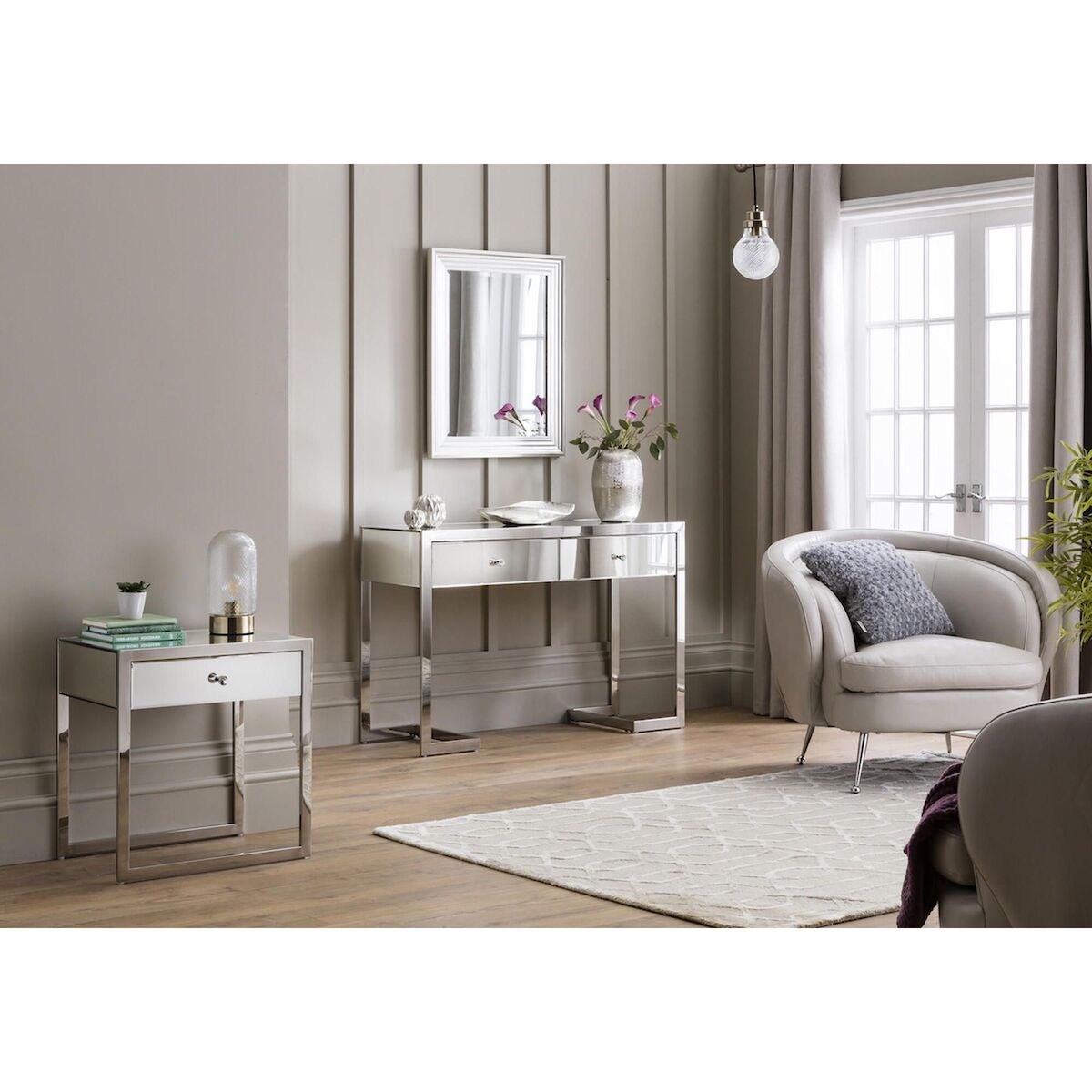 I’m a big fan of this mirrored console for its ability to bounce light around a room and visually expand tighter hallways or snug living areas. The slim chrome legs keep the look feeling modern rather than fussy, and the two drawers are perfect for stashing keys, post and other small essentials without adding bulk. Styling-wise, it works just as well in a minimalist apartment as it does in a more eclectic scheme - layer on a sculptural lamp and a neat stack of books, or try a pair of matching vases in contrasting colours for a bit of drama. In a bedroom setting you could use it as a sleek dressing table with a round mirror above; in a hallway, add a tray for your everyday essentials and a small plant for instant polish.