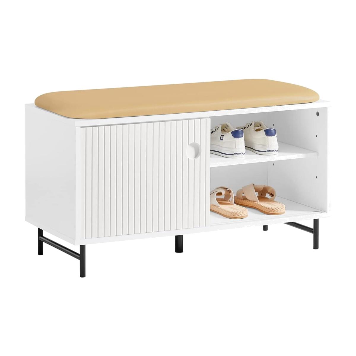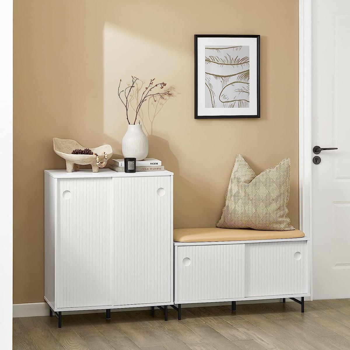 Modern design shoe cabinet storage bench is a good choice for hallway, living room, bedroom, etc. The PU leather seat cushion which is removable is ideal for comfortable sitting while putting on and taking off shoes. The sliding doors add a stylish touch to this cabinet and help you take out needed items with ease.2 internal shelves are adjustable in three heights. You can adjust the height to meet your needs or simply remove the shelves. Sturdy and durable It has MDF main part, PU leather seat cushion, metal side feet and bamboo middle foot. Tidies up your hallway or porch nicely hiding all your shoes and the other items! Modern elegant design shoe cabinet will fit perfectly with any style of decor.