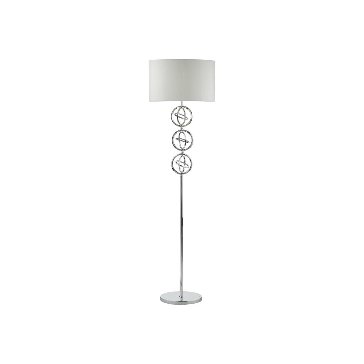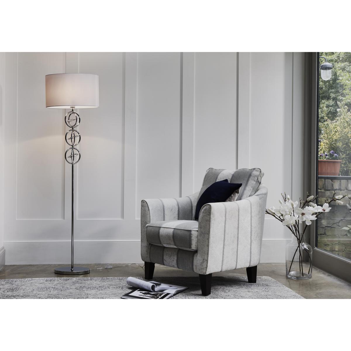 Elegant modern table lamp Polished chrome base with attractive interlocking ring design Faux silk lined cylindrical shade in ivory Holds E27 bulb, 60W (not included) Complements the Innsbruck Table Lamp A luxurious finishing touch for the contemporary home Dimensions Height: 167cm (66 inches) Depth: 25cm (10 inches) Width: 44cm (17 inches) Innsbruck Floor Lamp - Grey