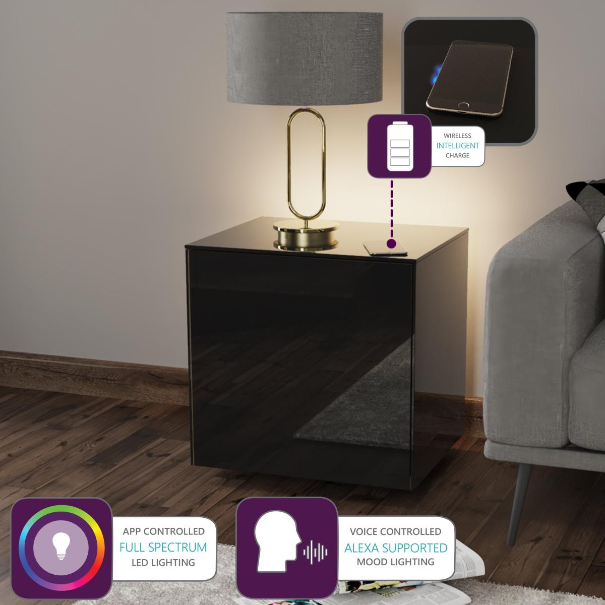 Upgrade your lamp table the smart way - this Intel LED Lamp Table is sure to wow you with its futuristic features. The full colour spectrum LED mood back lighting that can be operated by the free Frank Olsen app or voice control via Amazon Alexa, so you can change the vibe at the touch of your finger or at your order. Charge your phone without the messy wires and faff thanks to the table's wireless phone charging compatibility, simply pop your phone on the table to charge! This contemporary table has a high gloss finish with matching glass top for easy cleaning, with an internal shelf to store all your bits and bobs. Please note: deliveries not included are Remote Scotland, Highlands, Ireland, Isle of Man, Channel Islands etc.