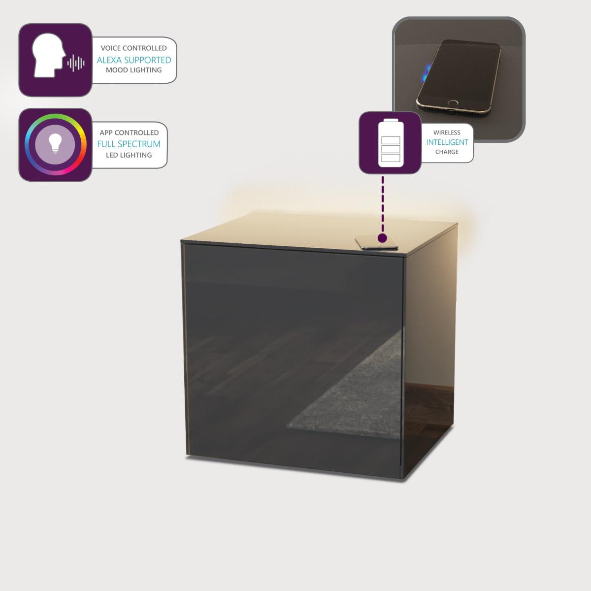 Upgrade your lamp table the smart way - this Intel LED Lamp Table is sure to wow you with its futuristic features. The full colour spectrum LED mood back lighting that can be operated by the free Frank Olsen app or voice control via Amazon Alexa, so you can change the vibe at the touch of your finger or at your order. Charge your phone without the messy wires and faff thanks to the table's wireless phone charging compatibility, simply pop your phone on the table to charge! This contemporary table has a high gloss finish with matching glass top for easy cleaning, with an internal shelf to store all your bits and bobs. Please note: deliveries not included are Remote Scotland, Highlands, Ireland, Isle of Man, Channel Islands etc.