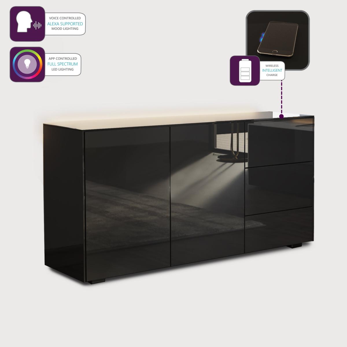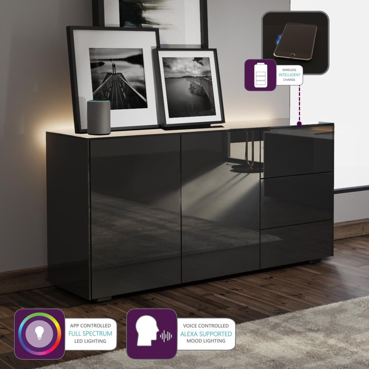 Voice controlled furniture is a thing of the future. Or is it? This Intel LED Sideboard features full colour spectrum LED rear lighting to instantly change the mood and feel of your space for whatever occasion. Impress your guests by taking control via the free Frank Olsen Smart app or by voice command with Amazon Alexa. The high gloss and matching glass top of the sideboard creates a modern finish, internally you'll find internal shelves with fantastic storage capacity. This sideboard comes on castor wheels for easy movement when the interior design spark strikes next. Deliveries not included are Remote Scotland, Highlands, Ireland, Isle of Man, Channel Islands etc.
