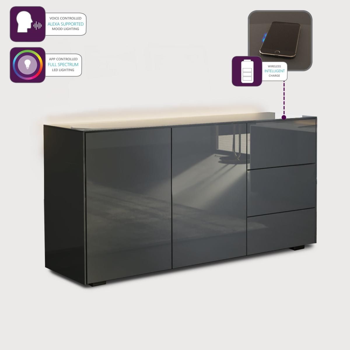 Voice controlled furniture is a thing of the future. Or is it? This Intel LED Sideboard features full colour spectrum LED rear lighting to instantly change the mood and feel of your space for whatever occasion. Impress your guests by taking control via the free Frank Olsen Smart app or by voice command with Amazon Alexa. The high gloss and matching glass top of the sideboard creates a modern finish, internally you'll find internal shelves with fantastic storage capacity. This sideboard comes on castor wheels for easy movement when the interior design spark strikes next. Deliveries not included are Remote Scotland, Highlands, Ireland, Isle of Man, Channel Islands etc.