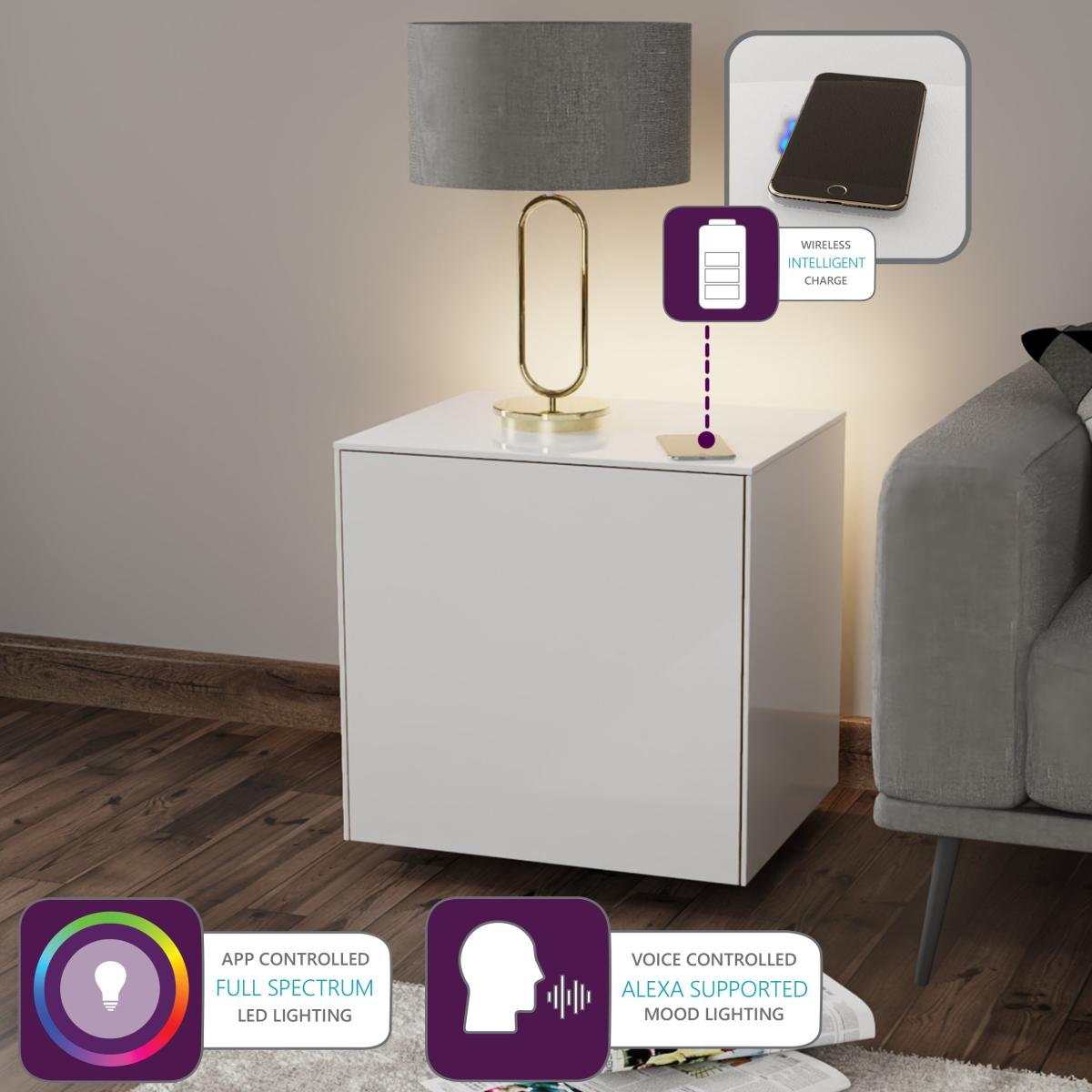 Upgrade your lamp table the smart way - this Intel LED Lamp Table is sure to wow you with its futuristic features. The full colour spectrum LED mood back lighting that can be operated by the free Frank Olsen app or voice control via Amazon Alexa, so you can change the vibe at the touch of your finger or at your order. Charge your phone without the messy wires and faff thanks to the table's wireless phone charging compatibility, simply pop your phone on the table to charge! This contemporary table has a high gloss finish with matching glass top for easy cleaning, with an internal shelf to store all your bits and bobs. Please note: deliveries not included are Remote Scotland, Highlands, Ireland, Isle of Man, Channel Islands etc.