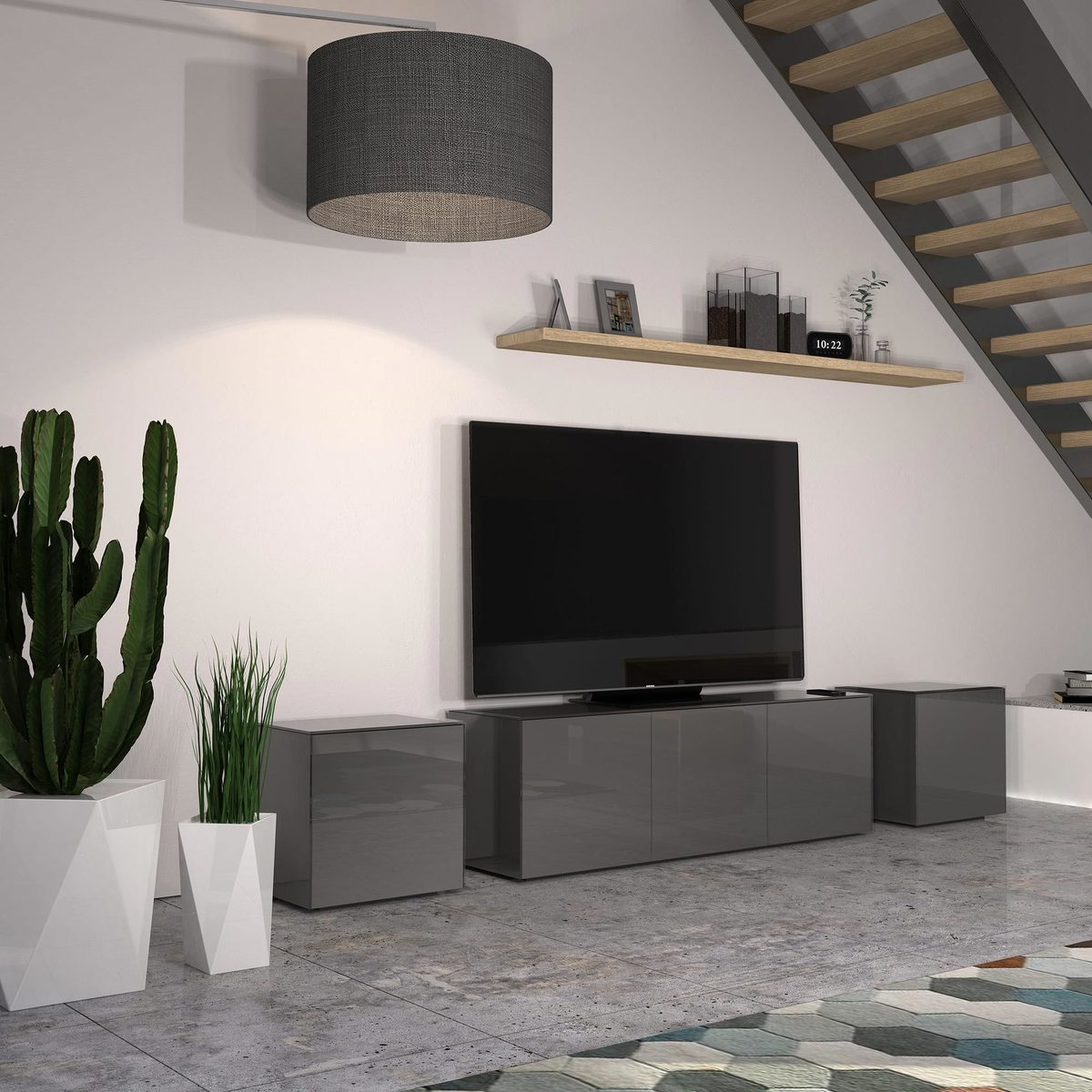This 3 door TV unit features a stunning clean lined design in many high gloss finishes, with push to open door fronts and plenty of ventilated internal storage, the Concept 150 is ideal for hiding away all your entertainment essentials.;Designed with a built in wireless phone charger and intelligent remote eye system, the Concept TV unit allows you to keep its doors closed and still operate up to 8 pieces of AV equipment, providing optimum high tech quality without having to compromise on its seamless sleek design.;Constructed from only solid 18mm board and toughened glass throughout, The Concept offers a durable finish that you can simply wipe clean, ideal for busy family life.;Please note: For none QI (wireless charge compatible) phones the cabinets are all supplied with both 1 x iPhone & 1 x Android microport, superslim wireless charging receivers. These simply sit under your existing phone case to make any phone work as wireless charging with the furniture. At approx 0.5mm thick, these receivers hide perfectly under a standard phone case.