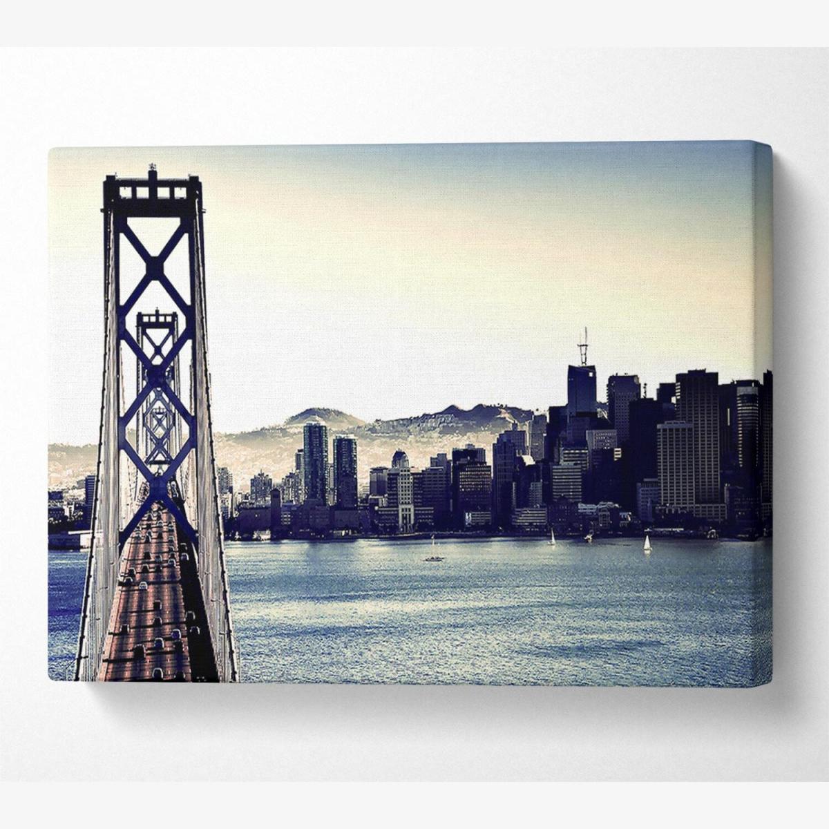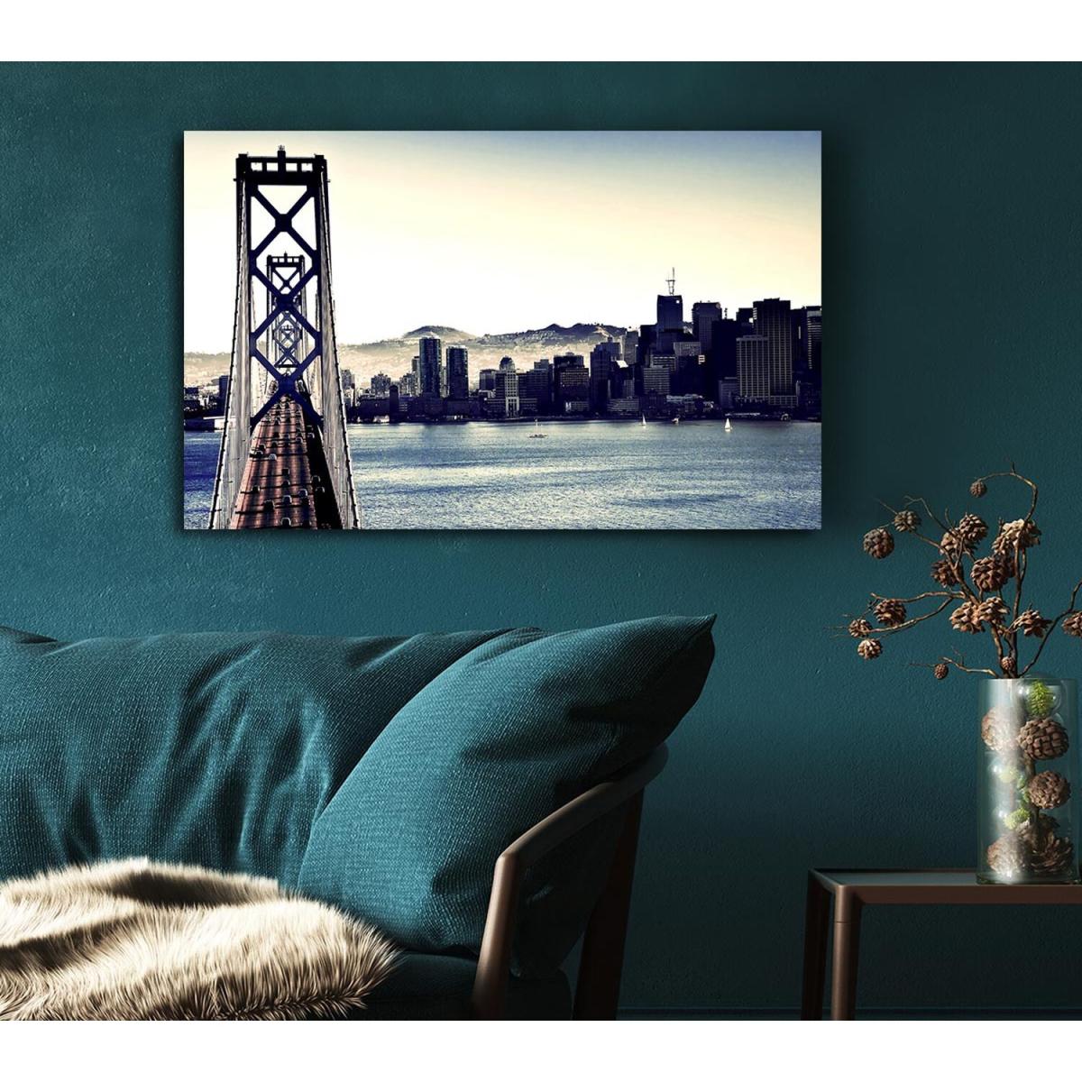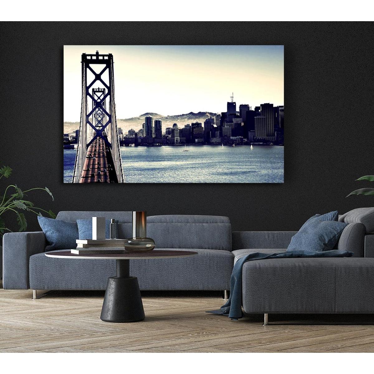 I love this canvas print of the Bay Bridge-it brings a modern urban vibe with its bold yellow accents that really pop. It works well in contemporary or minimalist interiors, especially when paired with neutral colour schemes to let the artwork stand out. Practical styling tips include hanging it above a sleek sideboard or low console to create a focal point, or in a living room with other black, grey, or white accessories for a cohesive look. Its sizeable scale makes it ideal for larger walls, where it can command attention without overwhelming the space. Overall, it’s a stylish piece that adds colour and a sense of energy to any room.