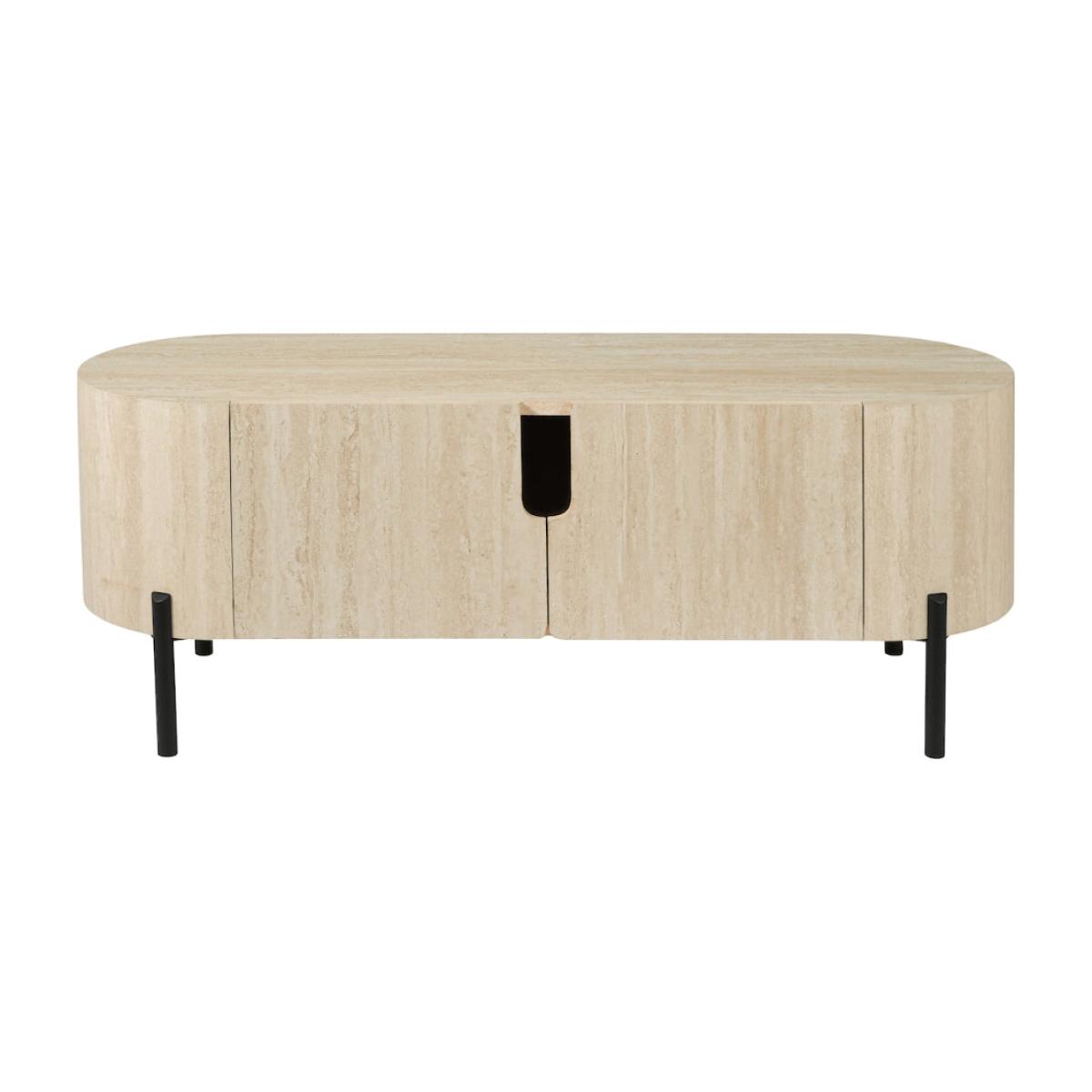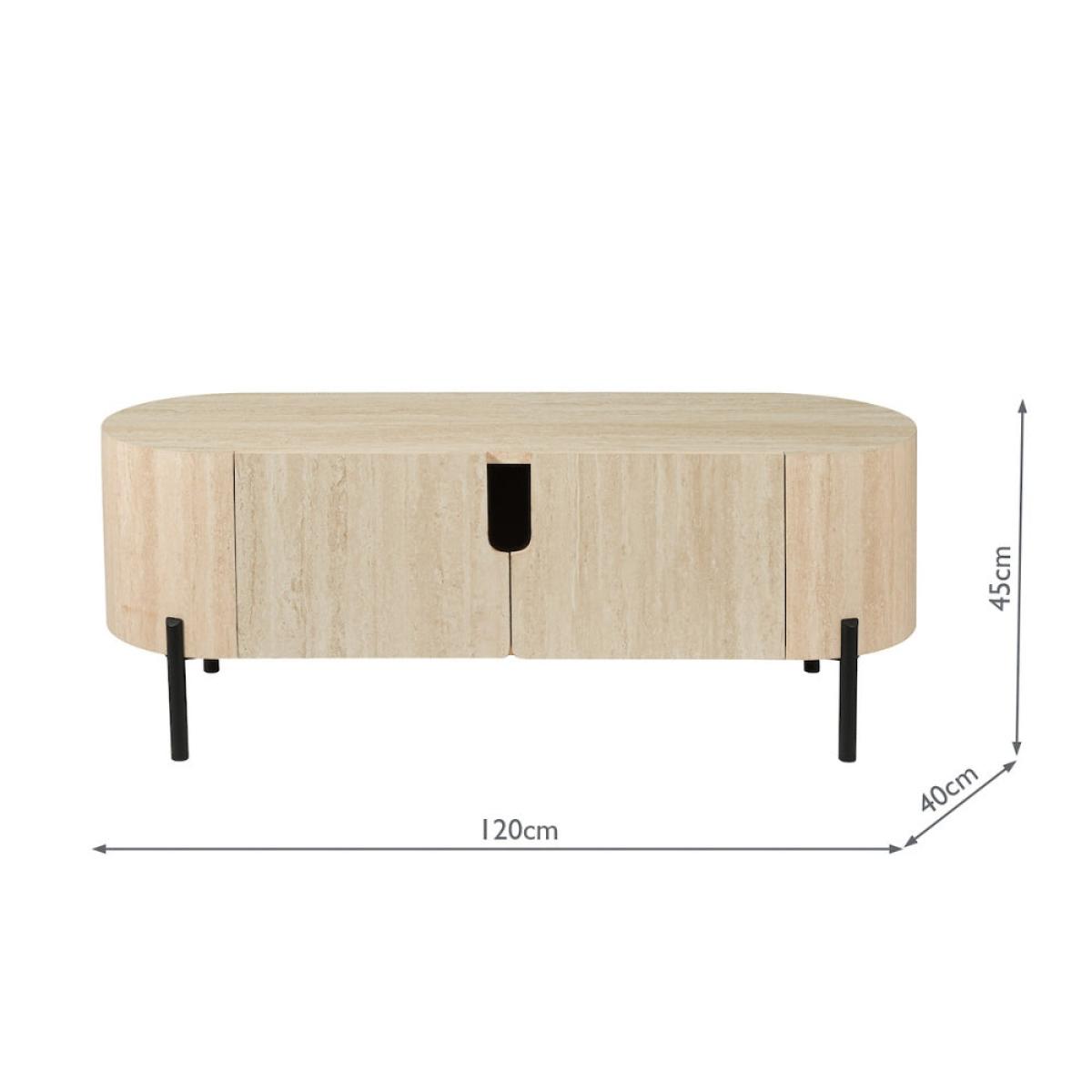 The Ioana low side console cabinet offers sleek storage with modern elegance. Finished in a warm travertine-effect veneer and set on matt black legs, it blends natural texture with contemporary style. A push-to-open function ensures a seamless, handle-free look while providing easy access to your essentials. Perfect for living areas, bedrooms, or home offices, this versatile piece requires simple self-assembly. To preserve its finish, avoid hot items, wipe spills promptly, and keep away from heat sources.
