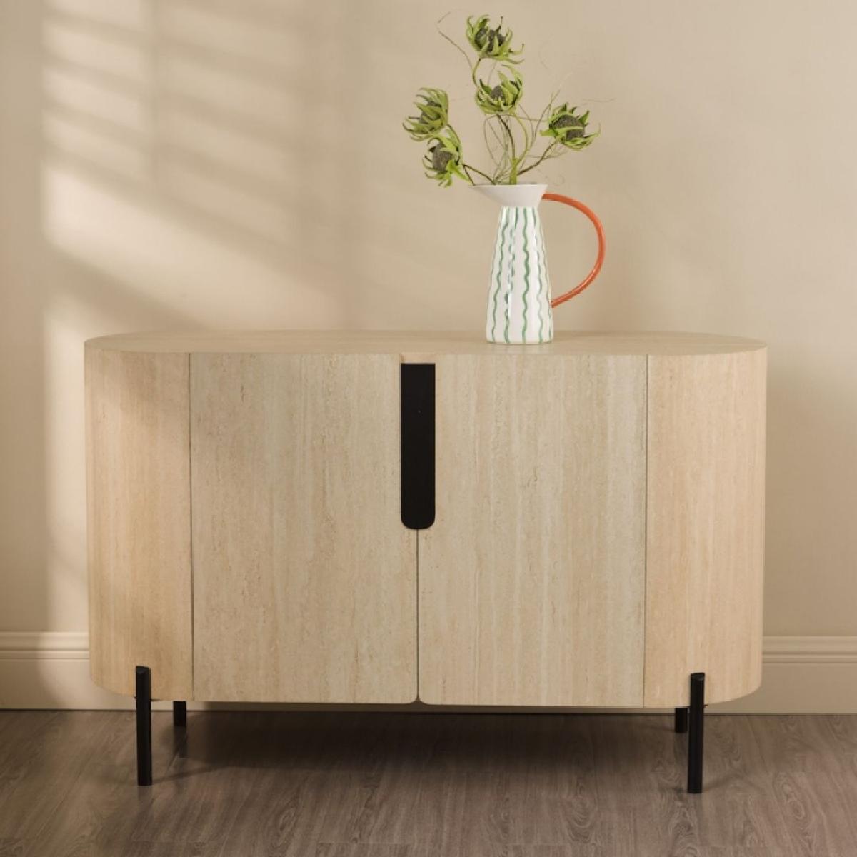 I love this small travertine effect cabinet for its clean, modern look with a touch of warmth, making it versatile for various interior styles. It works particularly well in contemporary or minimalist spaces, where its subtle texture adds interest without overwhelming. Practical styling tips include pairing it with sleek decorative accessories, such as geometric vases or understated lamps, to highlight its understated elegance. In kitchens or living rooms, it can serve as a functional storage piece while blending seamlessly with neutral or pastel colour schemes. Its understated yet stylish appearance makes it a flexible choice that can adapt to both SCANDI-inspired interiors and more eclectic, layered spaces.