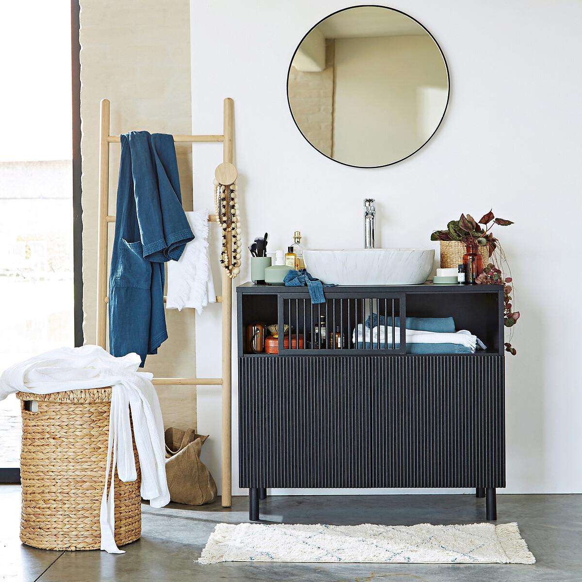 Simple and practical. A mirror whose metal structure with a black outline gives a modern and elegant appearance. Product Details • Steel structure • MDF back • For wall hanging (fixings not supplied)Dimensions • Diameter: 60cm • Thickness: 2cm. Dimensions and weight of parcel1 parcel • L67.5 x H8 x D67.5 cm. 7.3kg