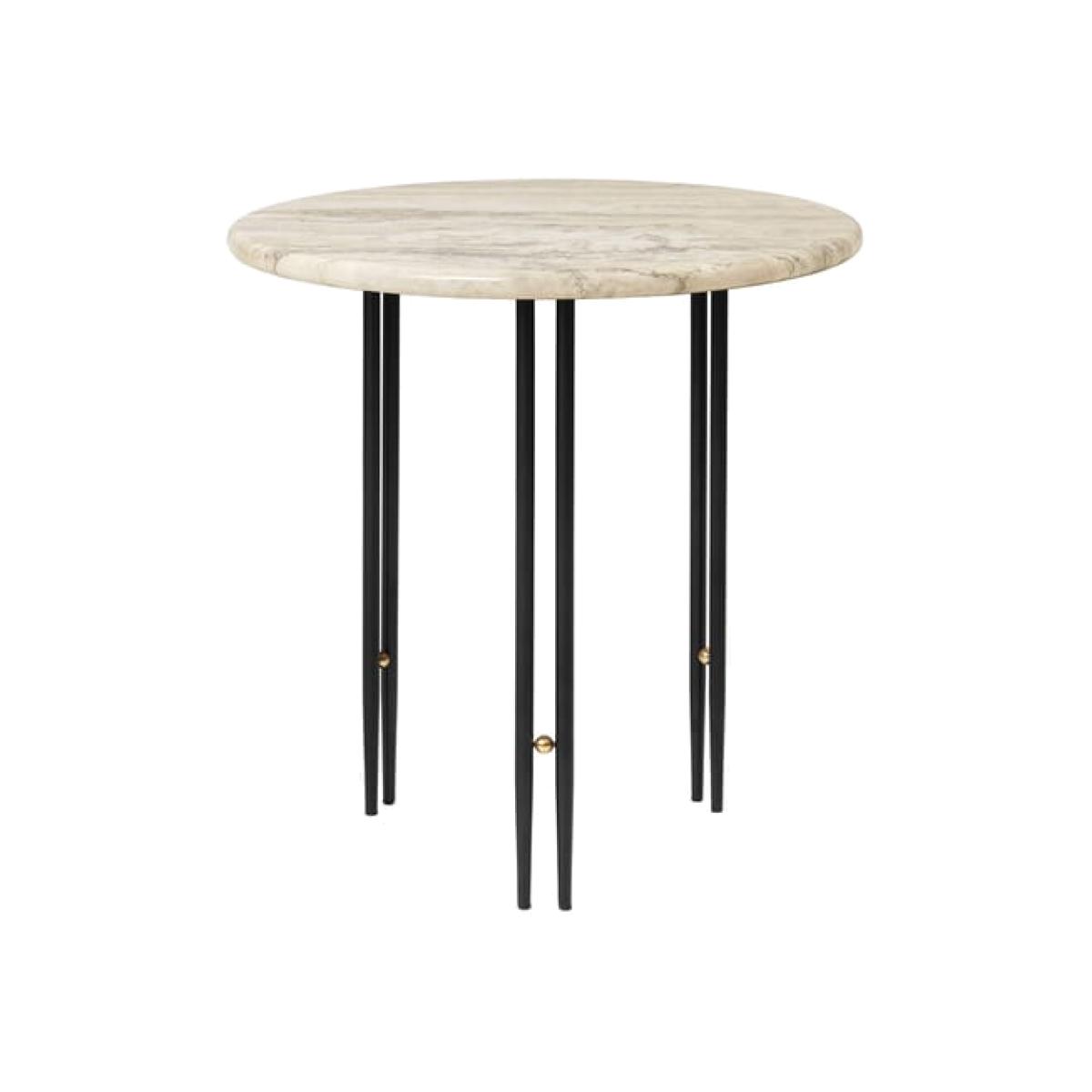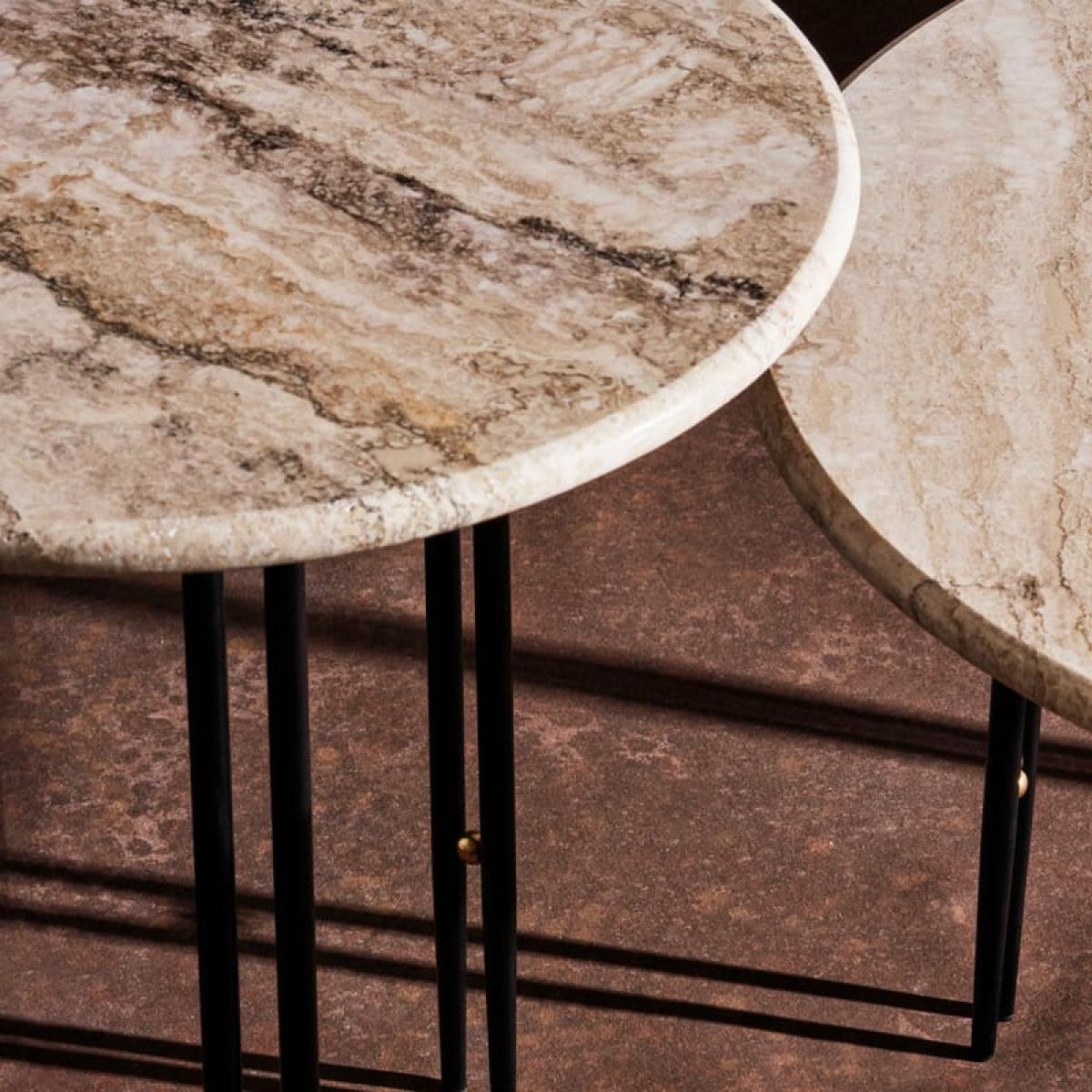 Coffee table IOI by Gam. Fratesi: geometric elegance in the service of design The IOI coffee table, by design duo Gam Fratesi for GUBI, is a contemporary tribute to the sophisticated lines of Art Deco. Combining noble materials such as solid brass, steel and Italian travertine, this piece explores the subtle balance between form, space and material. Refined, sculptural designThe name IOI, inspired by the structure of the table legs - two metal tubes linked by a brass sphere - perfectly conveys the essence of this refined design. Available in black or chrome finishes, the slender base supports a circular top in Rippled Beige travertine, a novelty introduced by GUBI. This material, carefully sourced in Italy, provides a natural texture and robustness, while being softened by U-shaped edges, creating a harmonious balance between hardness and softness. Versatility and harmonyAvailable in two heights and diameters, the IOI coffee table adapts to all configurations: used alone for a minimalist look or combined as a duo for a dynamic composition. Its timeless design blends perfectly with the armchairs and sofas in the GUBI collection. A Gam Fratesi creationThe Danish-Italian duo Gam. Fratesi, renowned for their creations blending classicism and modernity, have created an emblematic piece where contrasts - between light and solid, curves and lines - captivate design lovers. With the IOI coffee table, GUBI redefines modern luxury, combining aesthetics and functionality. In detail: Variation : Beige Marble (Ripple) / Black Base, legs Brand : Gubi Designer : Gam Fratesi Type : End table Colour : Tray: beige marble (Ripple) - Legs: black and brass balls. Material :Tray: Rippled marble - Legs: Lacquered steel and Brass balls Dimensions : Ø 50 x H 50 cm Weight : 38.28 lb Characteristics :For interiors only Show less