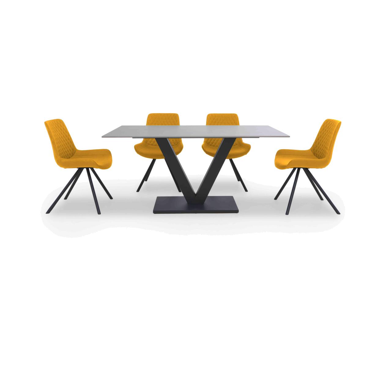 Our mission to bring you stylish and practical dining furniture at great-value prices reaches another milestone in our fabulous Ion range. Designed for busy family homes, Ion includes dining tables, dining sets and a bar table all with sintered stone tops in versatile and ever-fashionable taupe. The tables’ black metal V-shaped bases make it easy to seat more people in comfort, and the collection’s dining chair, dining bench and bar stool are industrial in style, with black metal legs and easy-care upholstery. The incredible-value Ion range is exclusively available at Furniture Village. Available in two sizes and with a lovely sintered stone top in fashionable taupe, the dining table in this dining set is paired with four stylish dining chairs upholstered in easy-care fabric. Why you'll love it Contemporary compact dining style for less. Beautiful sintered stone top with a satin finish in taupe. Ergonomic black metal V-shaped base is ideal for smaller spaces. With 4 industrial-style dining chairs in easy-care fabric. Choice of upholstery colours. Stylish stitching detail and splayed black metal legs. Choose small or large dining table. Exclusive to Furniture Village – you won’t find it anywhere else. This dining set is part of our Ion range. What you need to know Chairs have foam seat cushioning, and metal frames and legs. Choose one colour for all 4 chairs. Small dining table seats 4. Large dining table seats 6. Table top is made from sintered stone, which is created using natural stone. Top is coated with glass and may show light surface scratches with use. Use placemats and coasters at all times to protect the surface. Mop spills quickly, and avoid abrasive cloths and cleaning materials.
