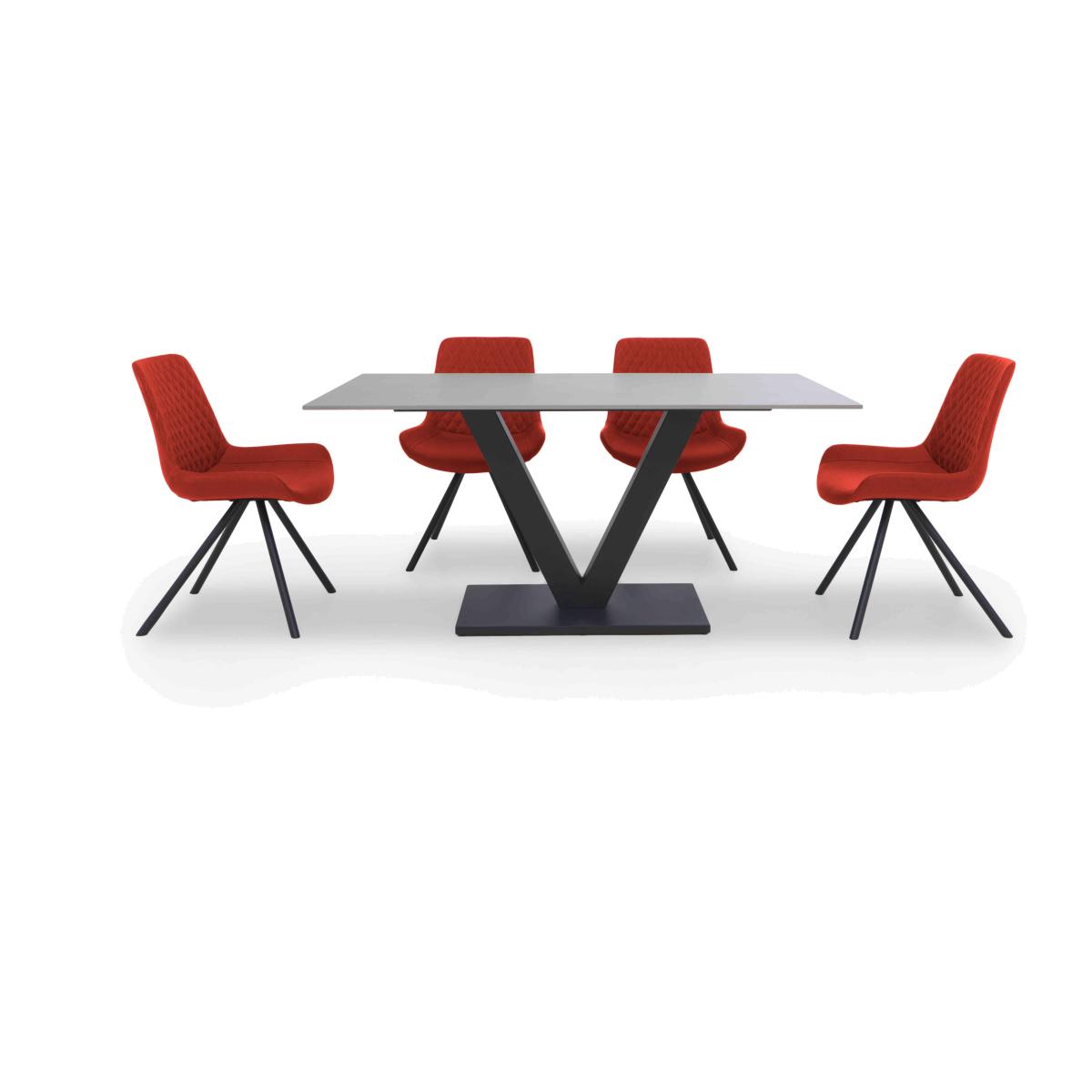 Our mission to bring you stylish and practical dining furniture at great-value prices reaches another milestone in our fabulous Ion range. Designed for busy family homes, Ion includes dining tables, dining sets and a bar table all with sintered stone tops in versatile and ever-fashionable taupe. The tables’ black metal V-shaped bases make it easy to seat more people in comfort, and the collection’s dining chair, dining bench and bar stool are industrial in style, with black metal legs and easy-care upholstery. The incredible-value Ion range is exclusively available at Furniture Village. Available in two sizes and with a lovely sintered stone top in fashionable taupe, the dining table in this dining set is paired with four stylish dining chairs upholstered in easy-care fabric. Why you'll love it Contemporary compact dining style for less. Beautiful sintered stone top with a satin finish in taupe. Ergonomic black metal V-shaped base is ideal for smaller spaces. With 4 industrial-style dining chairs in easy-care fabric. Choice of upholstery colours. Stylish stitching detail and splayed black metal legs. Choose small or large dining table. Exclusive to Furniture Village – you won’t find it anywhere else. This dining set is part of our Ion range. What you need to know Chairs have foam seat cushioning, and metal frames and legs. Choose one colour for all 4 chairs. Small dining table seats 4. Large dining table seats 6. Table top is made from sintered stone, which is created using natural stone. Top is coated with glass and may show light surface scratches with use. Use placemats and coasters at all times to protect the surface. Mop spills quickly, and avoid abrasive cloths and cleaning materials.