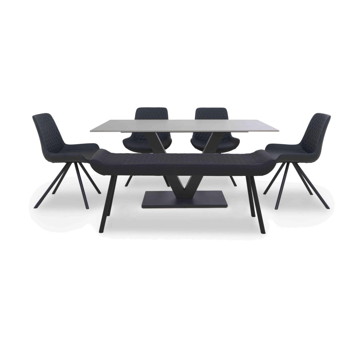 Our mission to bring you stylish and practical dining furniture at great-value prices reaches another milestone in our fabulous Ion range. Designed for busy family homes, Ion includes dining tables, dining sets and a bar table all with sintered stone tops in versatile and ever-fashionable taupe. The tables’ black metal V-shaped bases make it easy to seat more people in comfort, and the collection’s dining chair, dining bench and bar stool are industrial in style, with black metal legs and easy-care upholstery. The incredible-value Ion range is exclusively available at Furniture Village. With flexible and space-saving seating – dining chairs and a dining bench – plus a sintered stone dining table, this dining set is perfect for stylish family dining. Why you'll love it Contemporary compact dining style for less. Table has a beautiful sintered stone top with a satin finish in taupe. Ergonomic black metal V-shaped base is ideal for smaller spaces. With 4 industrial-style dining chairs and a backless dining bench. Upholstered in easy-care faux leather in a choice of colours. Chairs and bench have stitching detail and splayed black metal legs. Choose small or large dining table. Exclusive to Furniture Village – you won’t find it anywhere else. This dining set is part of our Ion range. What you need to know Chairs and bench have foam seat cushioning, and metal frames and legs. Bench seats 2 adults in comfort or 3 cosily. Small table seats 4. Large table seats 6. Table top is made from sintered stone, which is created using natural stone. Top is coated with glass and may show light surface scratches with use. Use placemats and coasters at all times to protect the surface. Mop spills quickly, and avoid abrasive cloths and cleaning materials.