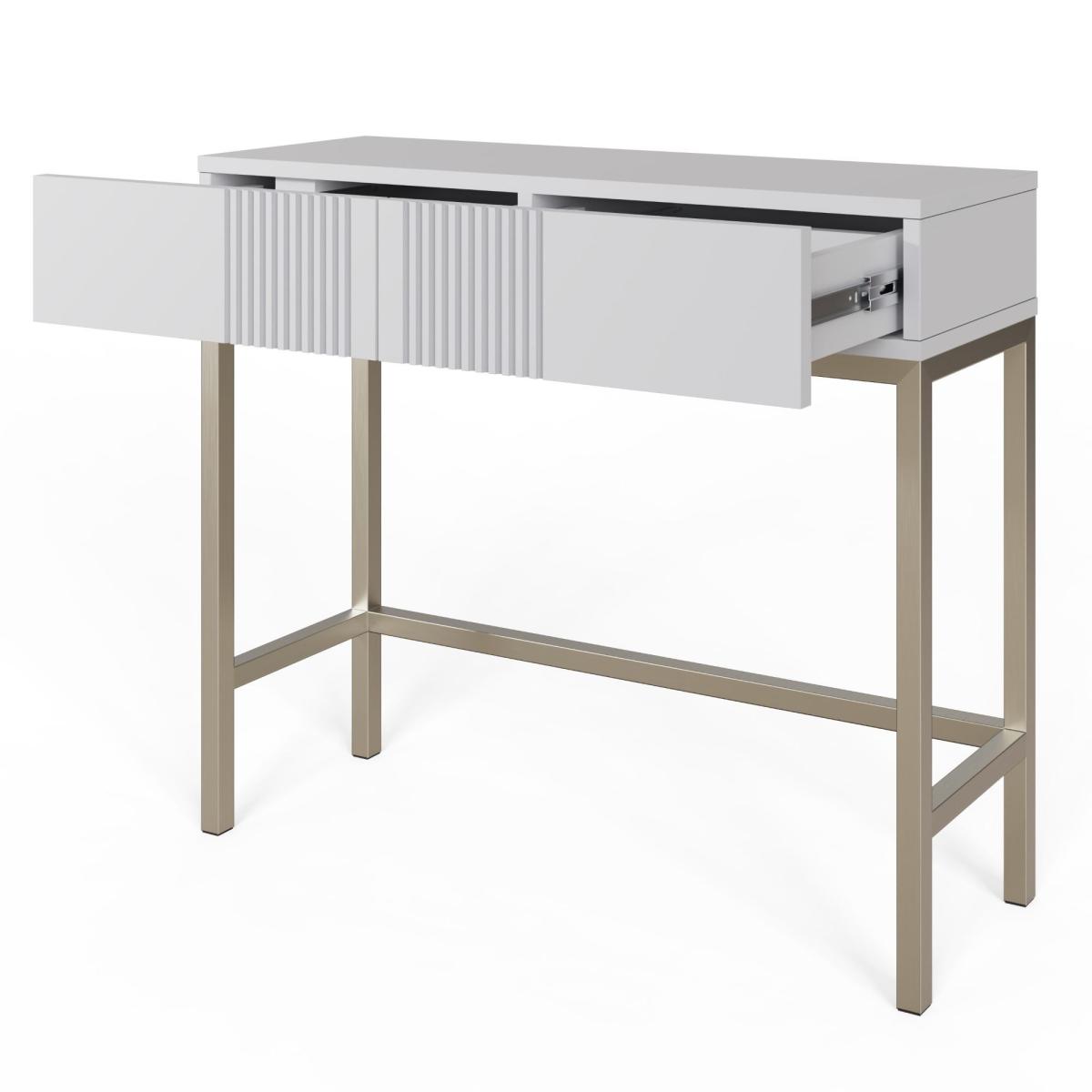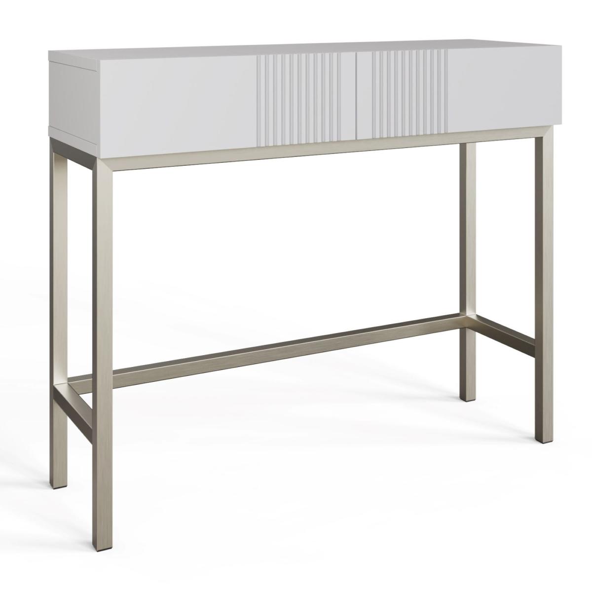 Our Iona Console Table is a versatile piece that adds beauty and functionality to your living room, hallway, or bedroom. With two drawers featuring the signature fluted design and push to open drawers, this console table is as practical as it is elegant. The striking brushed nickel legs and integrated discreet SMART features add a touch of modern sophistication to your home. Plus, with app and smart speaker operated back lighting and a discreet wireless phone charge point, this console table is perfect for your modern lifestyle. Assembly Information:. Up to five times faster than other standard self-assembly products, using a revolutionary furniture construction method that's easy, fast, and produces solid cabinets with no visible fixings. Our unique premium assembly method combines simplicity and strength, using hidden fixings for a sleek, seamless finish.