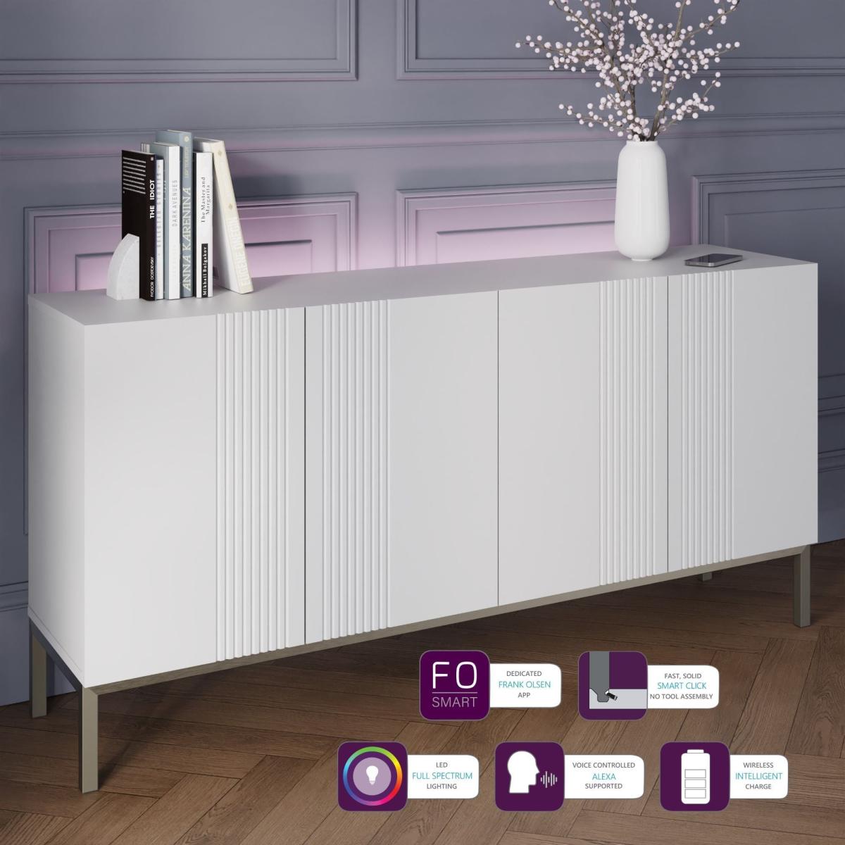 Transform your dining room into a stylish haven with our Iona Sideboard. Featuring four fluted detailed doors with a painted finish, this statement piece is sure to impress your guests. With adjustable shelves and push to open doors, this sideboard offers not only beauty but also convenience. Plus, with app and smart speaker operated back lighting and a discreet wireless phone charge point, this sideboard is the perfect addition to your modern home. Assembly Information: Up to five times faster than other standard self-assembly products, using a revolutionary furniture construction method that's easy, fast, and produces solid cabinets with no visible fixings. Our unique premium assembly method combines simplicity and strength, using hidden fixings for a sleek, seamless finish.