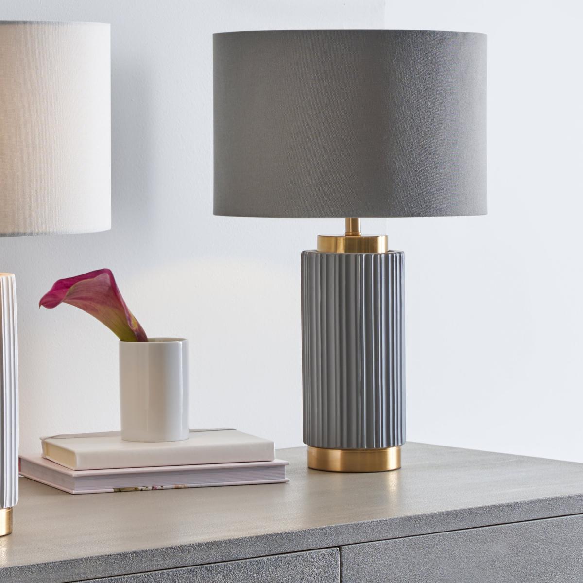 Designed to last, this durable ceramic Ionic table lamp has a modern ribbed design that will refresh your chosen room's decor. The lamp will also help provide a nice light level for when you settle down in an evening. Just buy an ES GLS bulb and get your room lit up in no time.