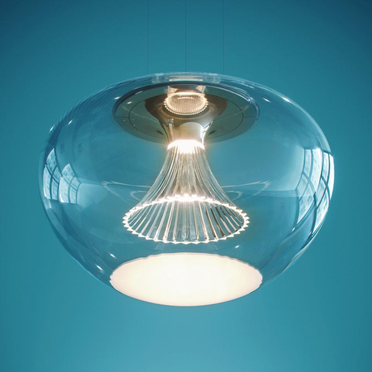The Ipno pendant combines tradition and innovation, glass-blower expertise and cutting-edge optical technology. The blown glass transparent globe is light as a feather. Inside of the globe is a smart PMMA pleated corolla in a deliciously retro style. This corolla-shaped diffuser hides the optical device and avoids glare. The LED source is located behind an engraved lens which concentrates the light and directs it downwards. The light flow is then reflected by the white glass disk located under the lampshade. Light emission is optimal: the light is cast evenly, is functional and not blinding. The elements which make up this pendant have been reduced to the essential so that the light can be expressed fully….