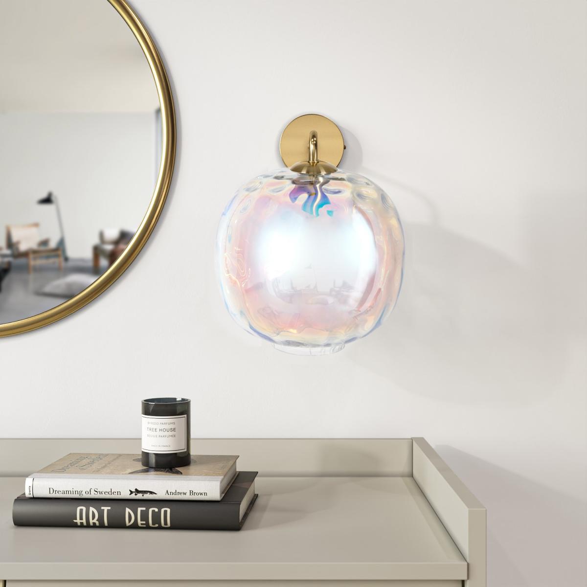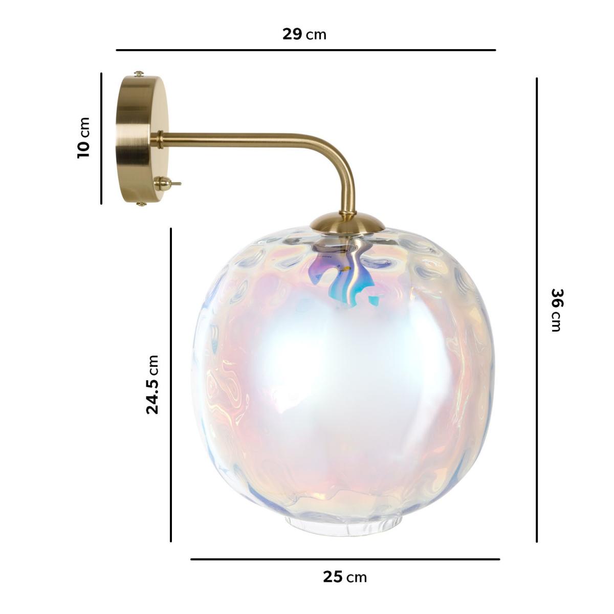 Features we love Dimpled glass wall light with a modern aesthetic. It’s striking thanks to the colourful iridescent effect. With complimenting contrasting brushed brass fixtures. Makes the perfect feature light to adorn bedrooms. It also comes available in a matching ceiling light All about me. Give your home an instant style update with this gorgeous iridescent effect glass wall light. It’s striking thanks to the dimpled glass shade and comes alive when in use. Its luminous colours change in all directions making this so eye-catching. It would look great taking centre stage in your bedroom hallway or living room. It’s dimmable and LED compatible too. It also comes in a champagne colour and a smoked glass shade. Need to know. Overall dimensions. W25 x D29 x H36 cm Shade dimensions. W25 x D25 x H24.5 cm Backplate dimensions. W10 x D2.5 x H10 cm Range. Avellino Style. Modern Fixture design. Wall Switch type. Rocker Number of lights. 1 Bulb type. E27 Maximum wattage. 40W IP rating. IP20 Colour. Iridescent (multi) Finish. Glass and brushed brass metal (accents and backplate) Material. Glass metal and PVC (cable inside) LED compatible. Yes Dimmer compatible. Yes Bulb included. No Weight. 1.53kg Fixings supplied. Yes Assembly required. Yes Warranty. 1 year.