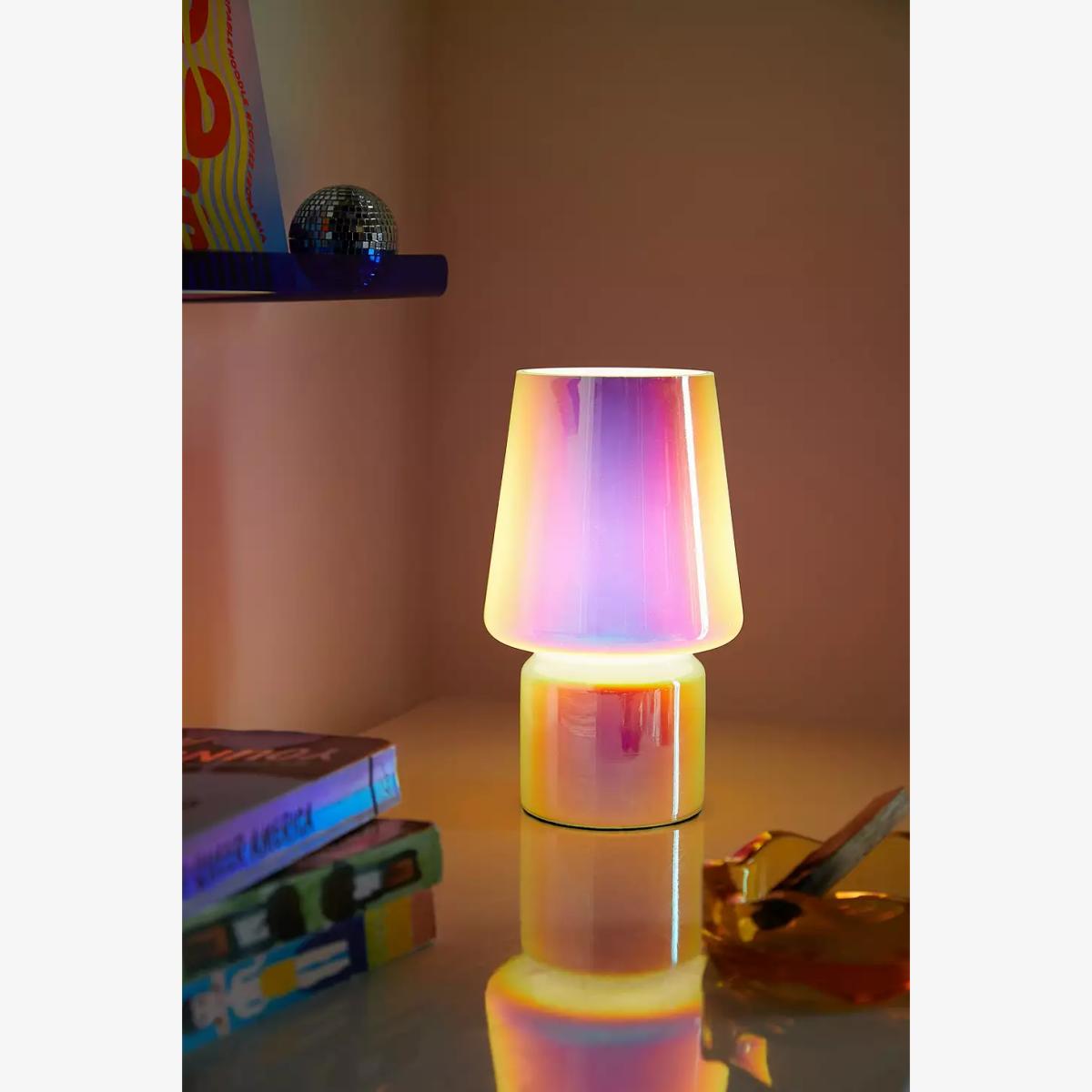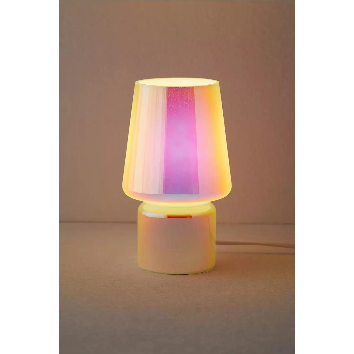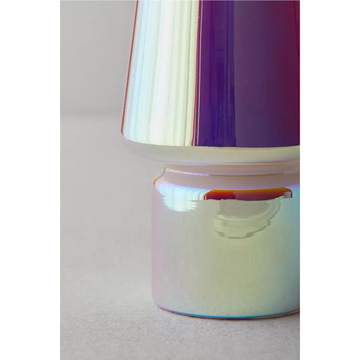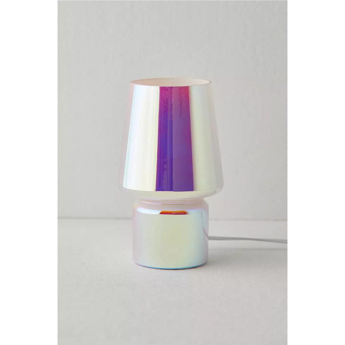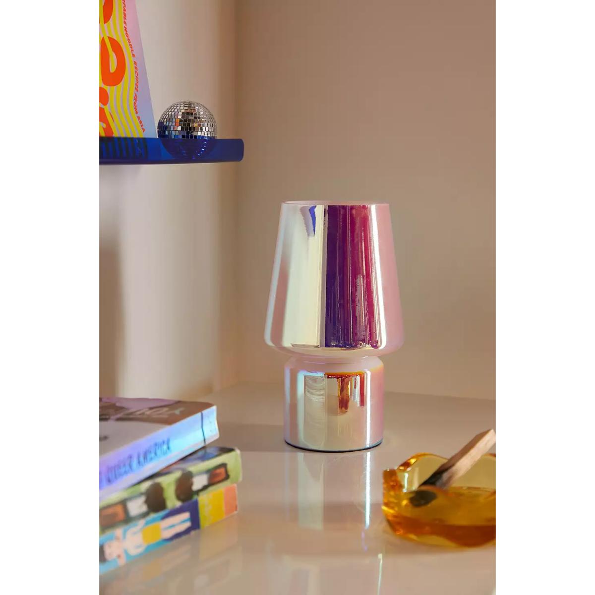 Small table lamp in an iridescent glass construction, complete with curved edges, an open-top silhouette and an overall ribbed design. Frosty glass lamp emits a warm glow when turned on, perfect for adding to your bedside table or bookshelf. Simply plug in to power on. **Content + Care** \- Glass \- Wipe clean \- Requires one E27 25W bulb \- Includes UK plug **Size** \- Dimensions: W: 9.6cm x H: 22cm
