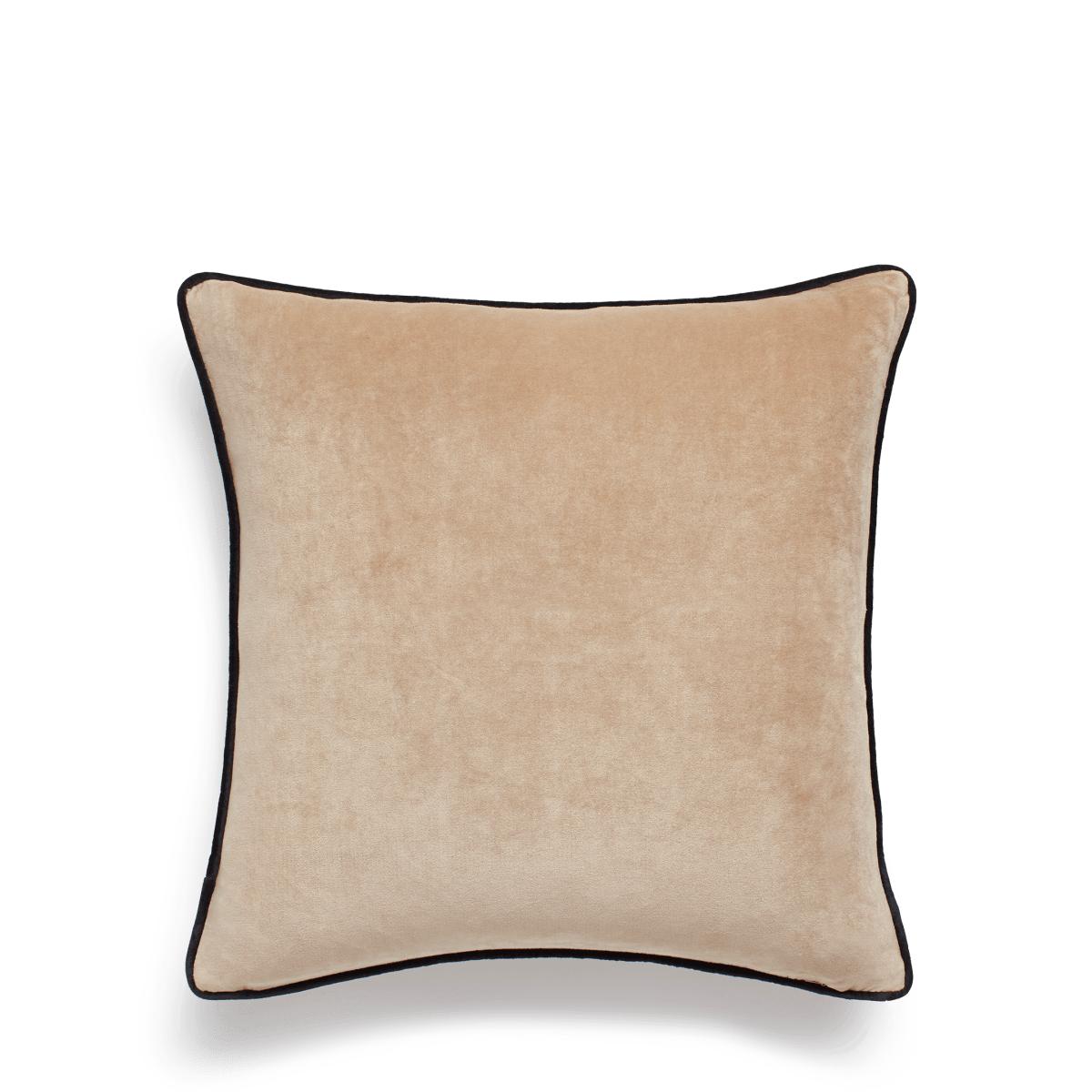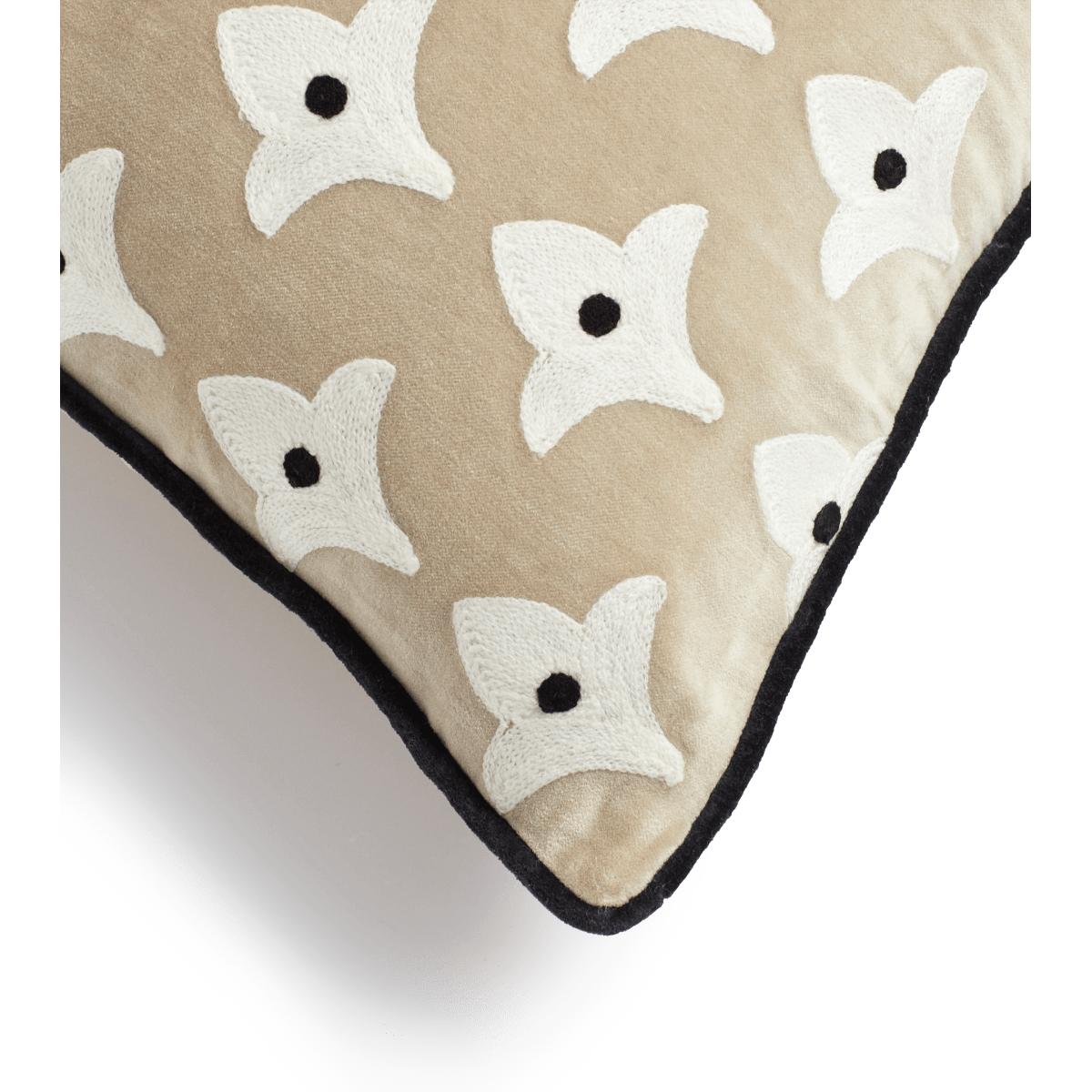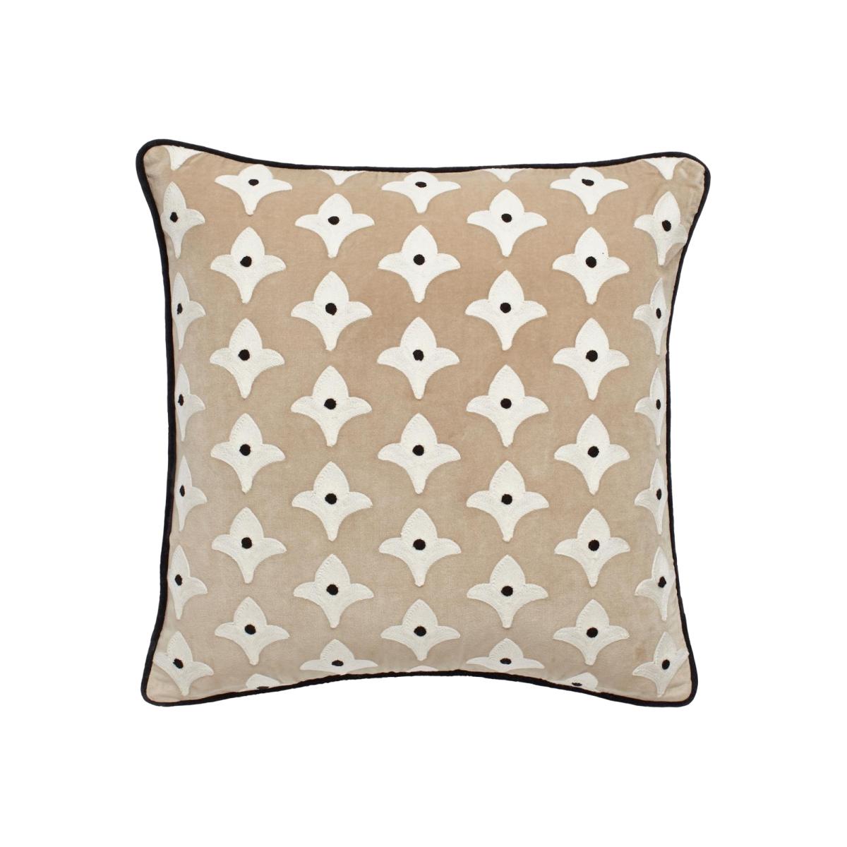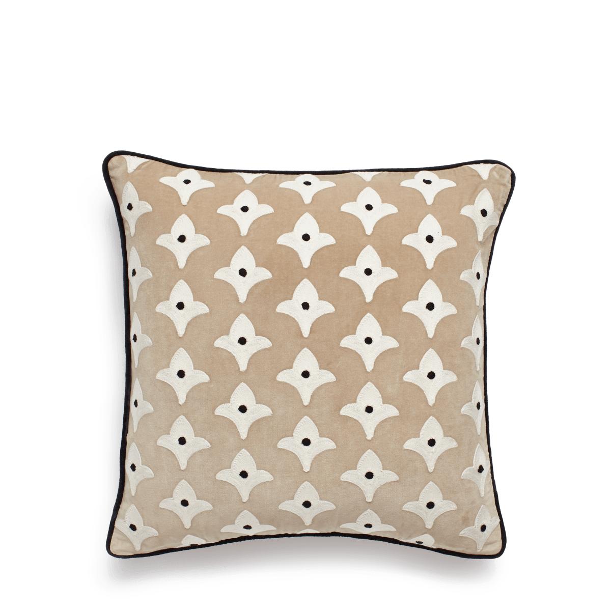 Our Iridos Cushion Cover features a fleur-de-lis-style motif that is machine embroidered in chain stitching, a repeating pattern on a neutral velvet base. It’s finished with contrasting velvet piping and its simplicity makes it a great piece for layering among other cushions of plain and bold styles.