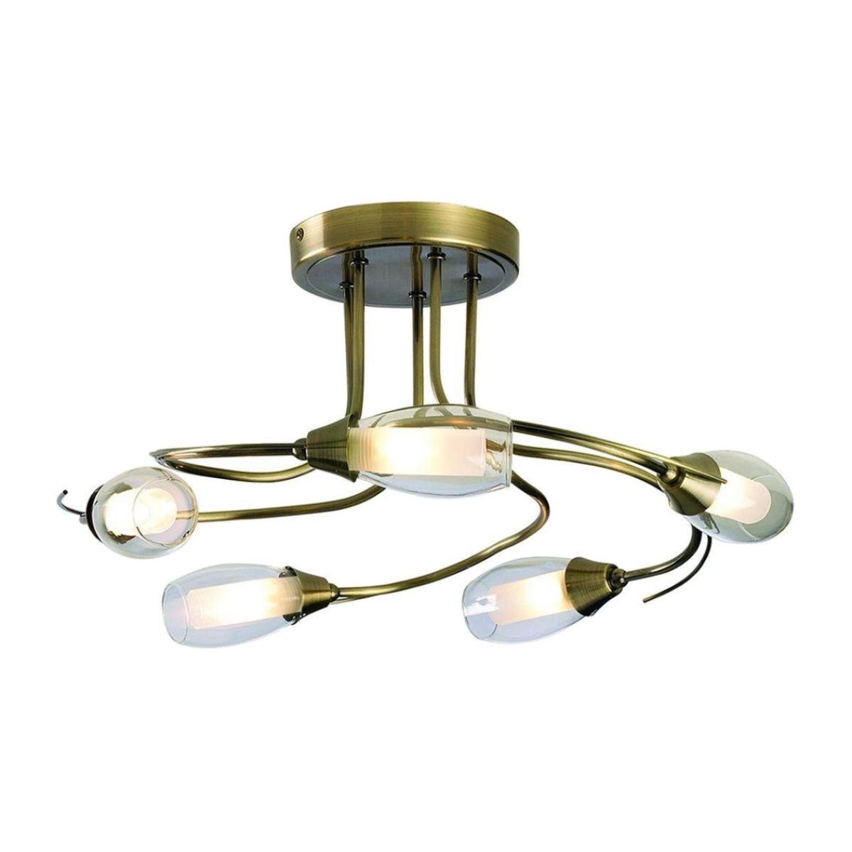 Iris 5-light semi-flush ceiling light, featuring a curved, twisted design, an antique brass finish and clear outer shades with frosted glass inner fluted shades. The Iris 5-light semi-flush ceiling light is a beautifully crafted fixture that blends classic elegance with a contemporary twist. Designed to make a subtle yet sophisticated statement, it features gracefully curved metal arms in a warm antique brass finish, adding a refined touch to any interior. Each of the five lights is encased within a clear glass outer shade, allowing for an open and airy feel while showcasing the delicate frosted inner shades. This layered glass design creates a soft, diffused glow, making the Iris ideal for living spaces, bedrooms or hallways where warm and ambient lighting is desired. With its semi-flush structure, this ceiling light is perfect for rooms with lower ceilings, providing ample illumination without overpowering the space. The Iris semi-flush ceiling light is a timeless piece that harmonises graceful curves, vintage-inspired finishes and layered glass detailing, making it a versatile choice for both traditional and modern interiors. Iris 5-light semi-flush ceiling light, featuring a curved, twisted design, an antique brass finish and clear outer shades with frosted glass inner fluted shades. The Iris 5-light semi-flush ceiling light is a beautifully crafted fixture that blends classic elegance with a contemporary twist. Designed to make a subtle yet sophisticated statement, it features gracefully curved metal arms in a warm antique brass finish, adding a refined touch to any interior. Each of the five lights is encased within a clear glass outer shade, allowing for an open and airy feel while showcasing the delicate frosted inner shades. This layered glass design creates a soft, diffused glow, making the Iris ideal for living spaces, bedrooms or hallways where warm and ambient lighting is desired. With its semi-flush structure, this ceiling light is perfect for rooms with lower ceilings, providing ample illumination without overpowering the space. The Iris semi-flush ceiling light is a timeless piece that harmonises graceful curves, vintage-inspired finishes and layered glass detailing, making it a versatile choice for both traditional and modern interiors.