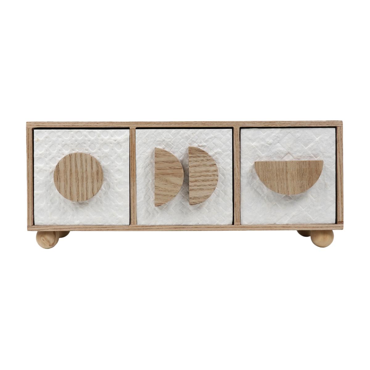 I love this little dresser for its simplicity and natural feel, making it a versatile piece that works well in a variety of interiors. Its organic wood tones and subtle texture add warmth without overpowering a space, making it perfect for both modern and rustic schemes. The three drawers with playful, geometric accents bring a touch of character - great for a living room or bedroom where you want practical storage with a bit of visual interest. Practical styling tips include pairing it with neutral textiles and incorporating other natural materials like woven baskets or linen for a cohesive look. It also works beautifully as a statement piece in minimal, Scandinavian, or boho-inspired interiors.