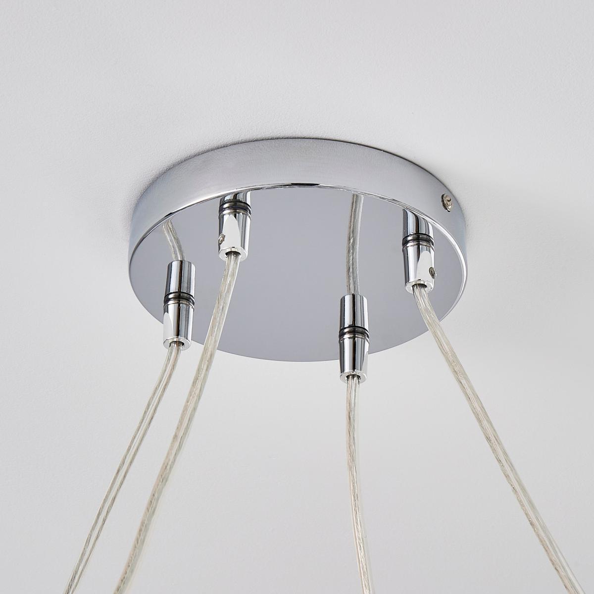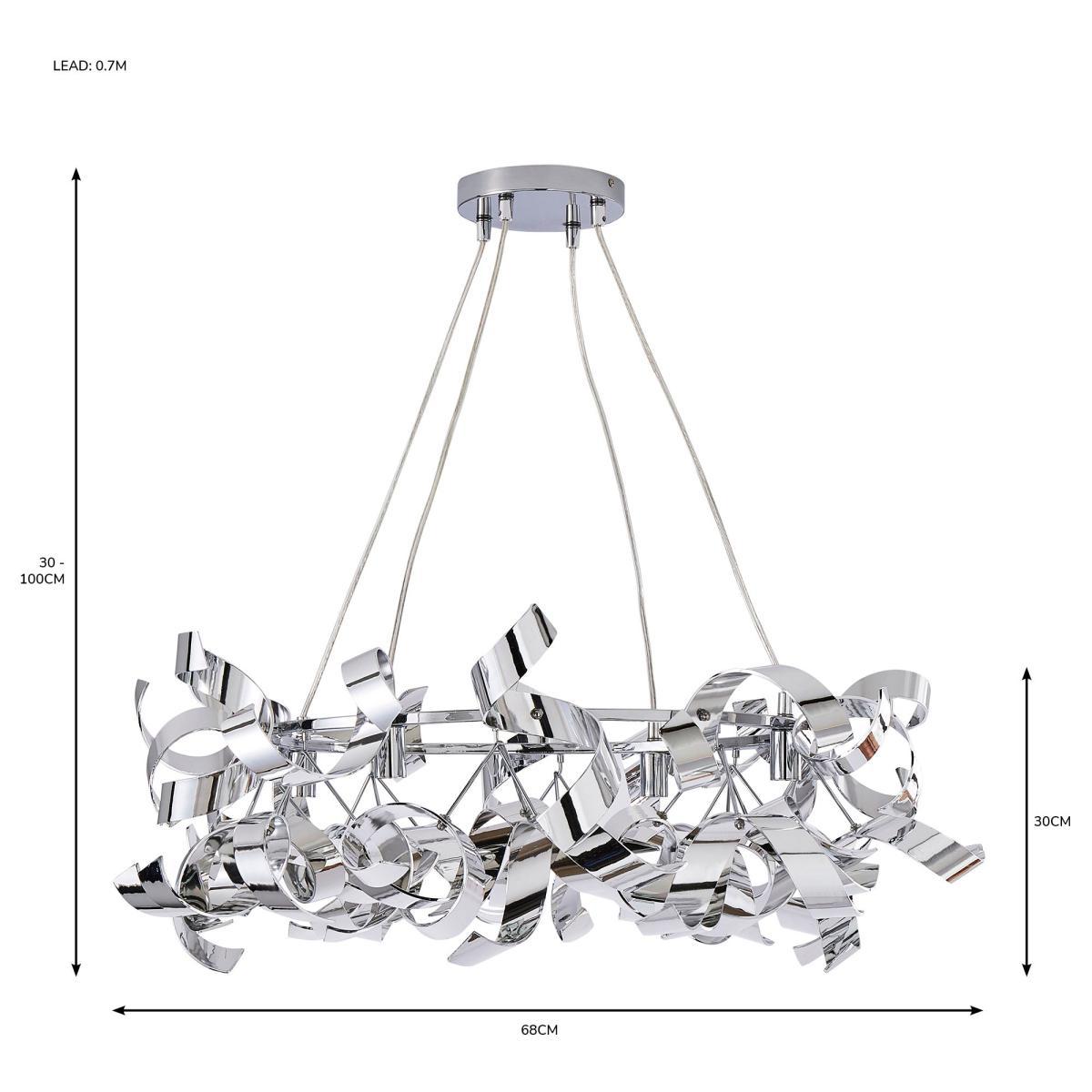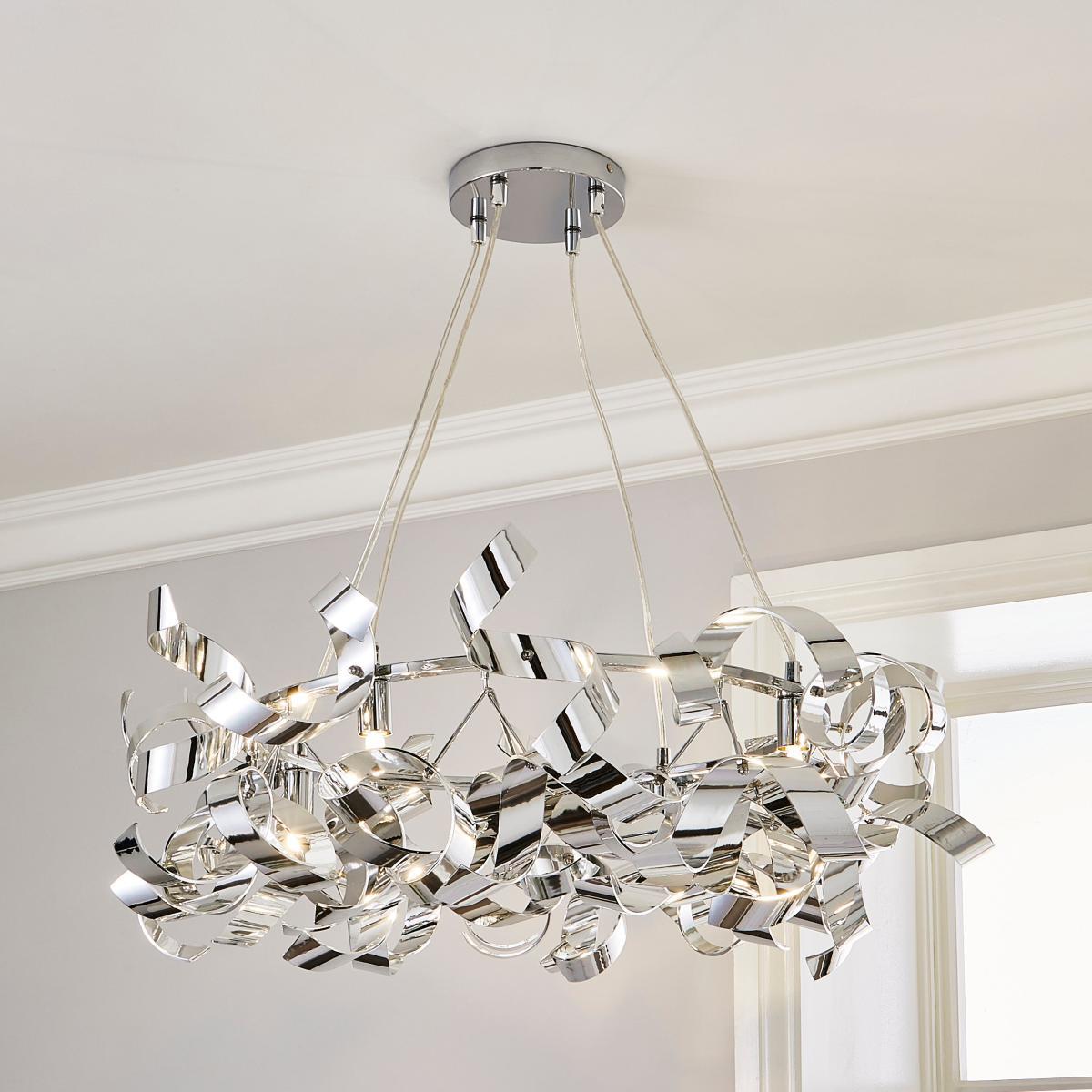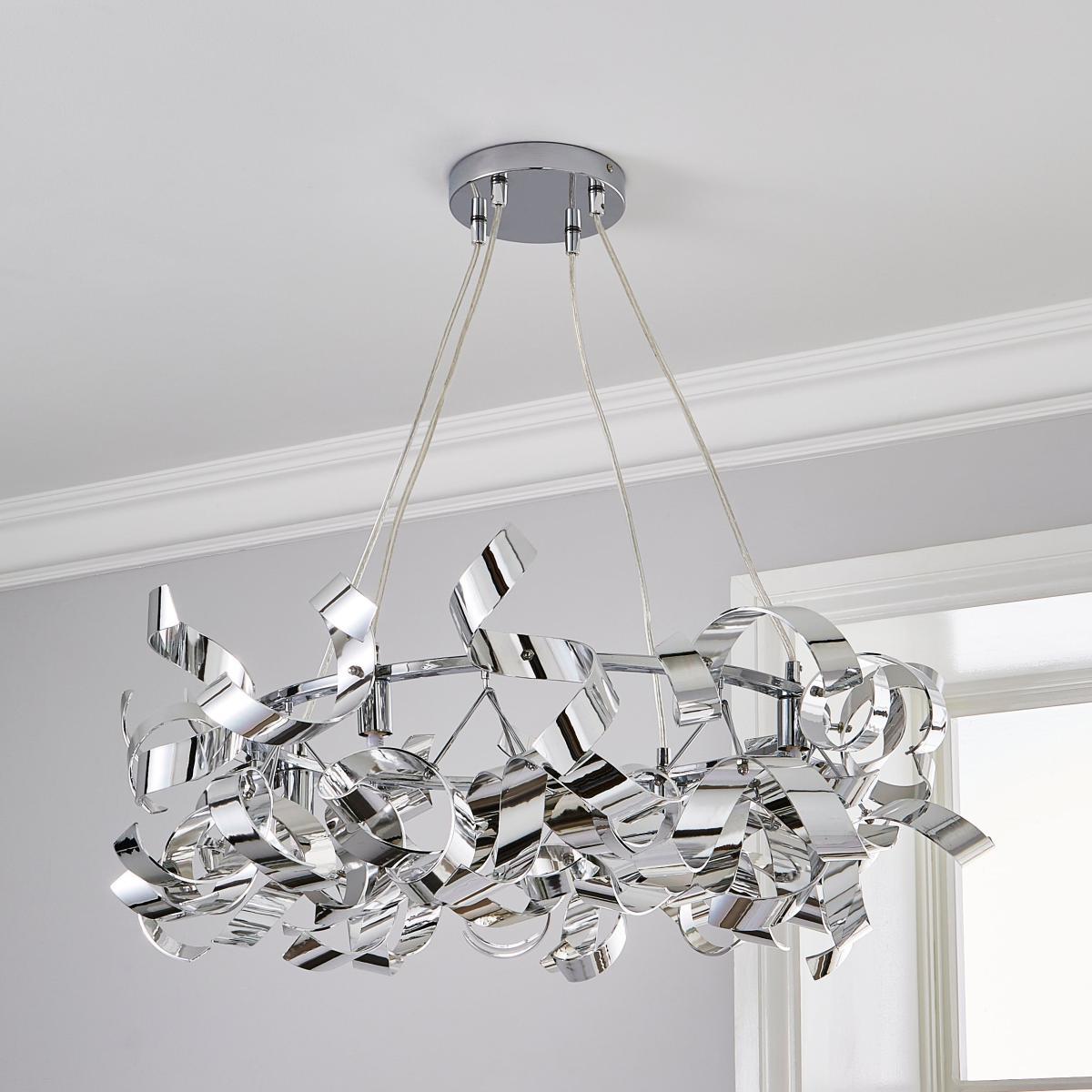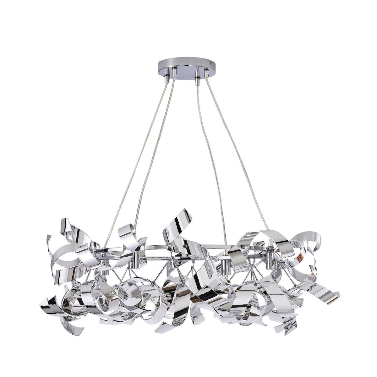I really like this piece because of its contemporary look with a touch of glamour, thanks to the polished chrome finish and sculptural form. It works particularly well in modern or minimalist interiors, adding visual interest without overwhelming the space. For styling, consider using it in a living room or dining area with neutral tones to let the fixture stand out, or pair it with softer textiles and furnishings to create a balanced, sophisticated vibe. Because of its eye-catching design, keep surrounding decor understated, allowing the light and shape to become a focal point. Practical tip: hang it in rooms with high ceilings for the best effect, and choose dimmable bulbs to modulate the ambiance.
